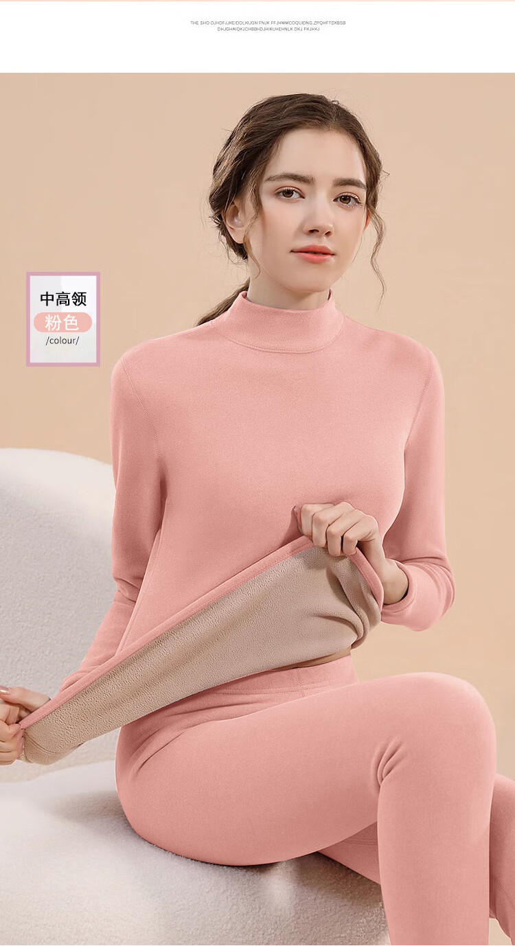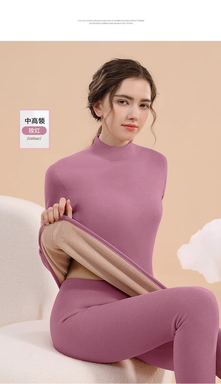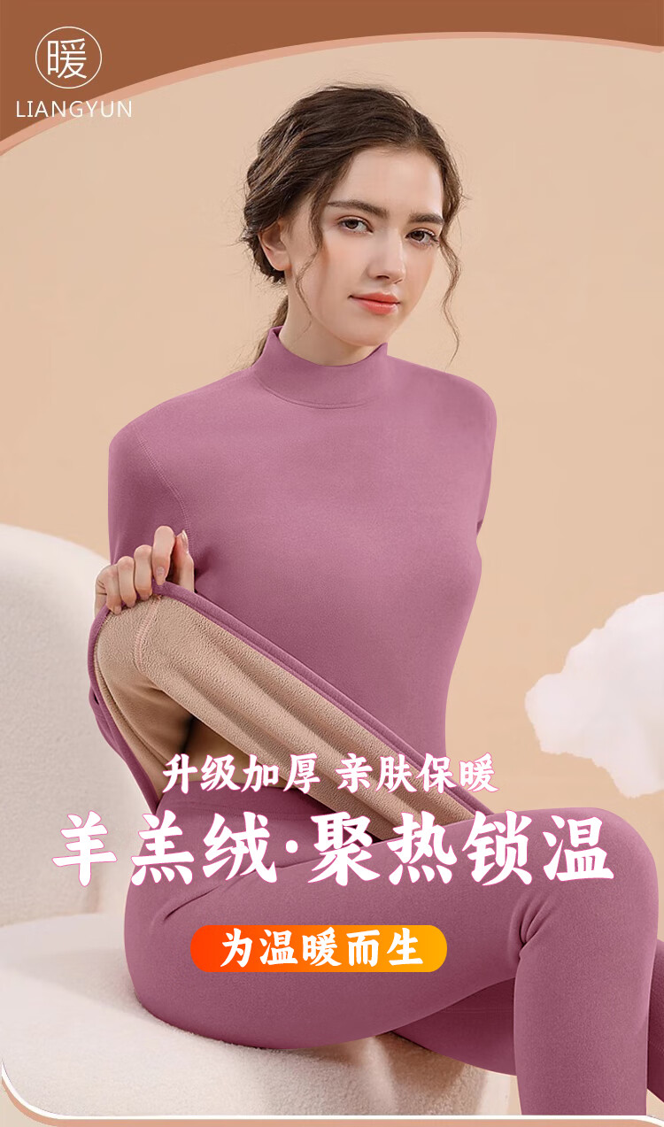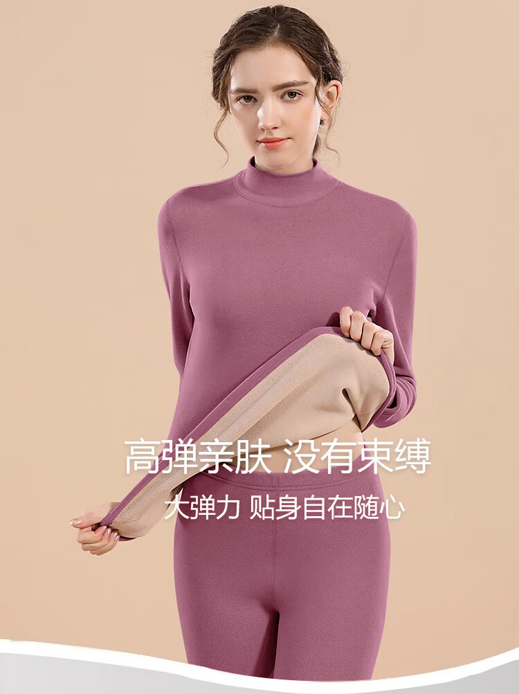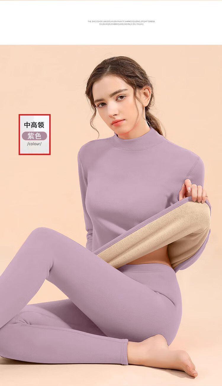 芬腾羊羔绒保暖内衣加绒加厚女士半高领德绒发热秋衣秋裤百搭套装冬季 紫色【Z1097高领套装】 M 【建议80-100斤】