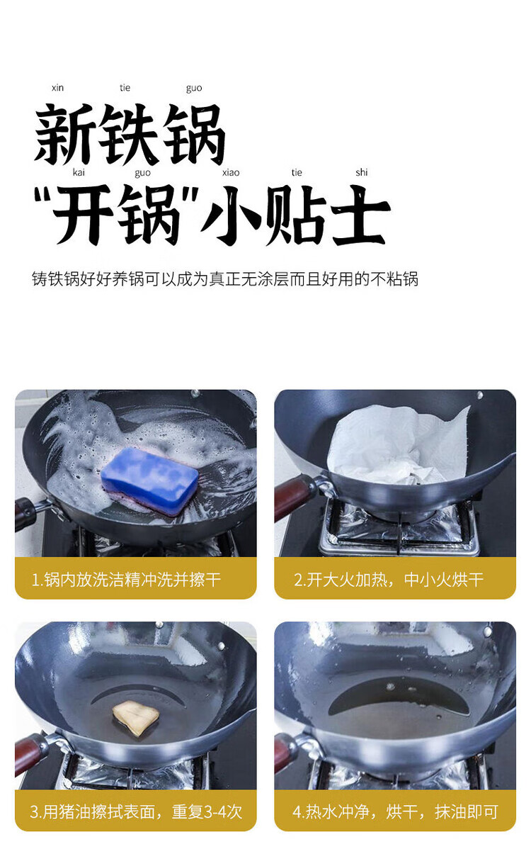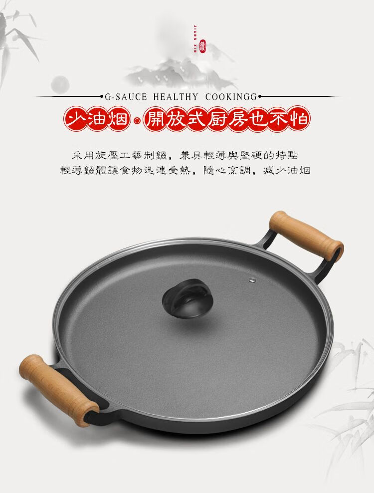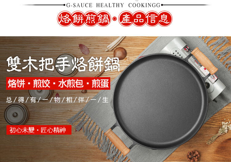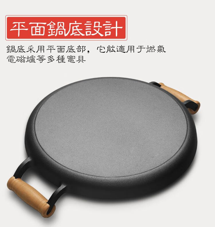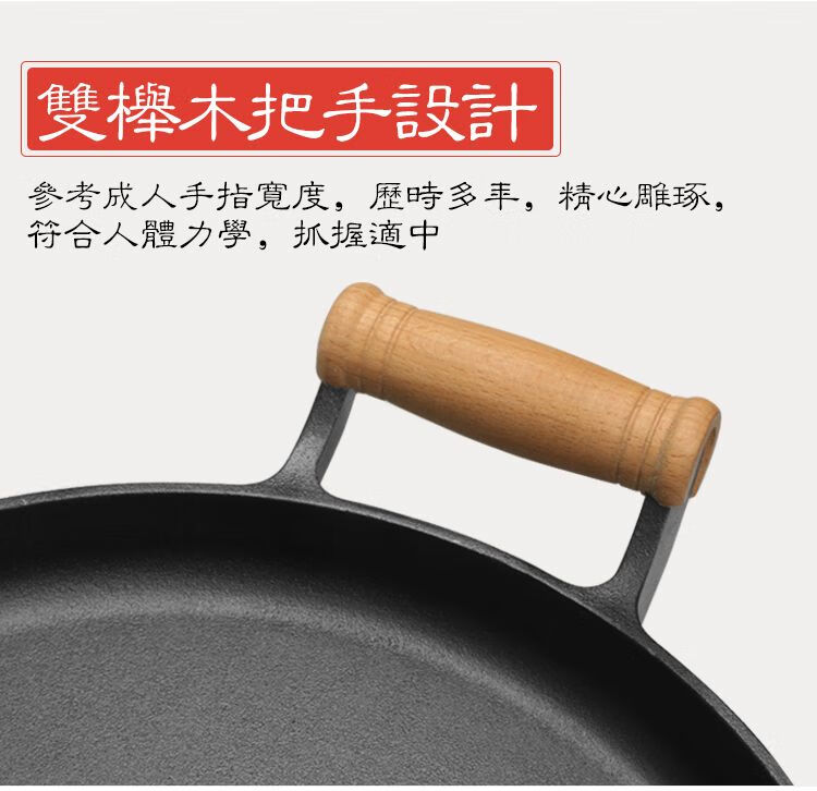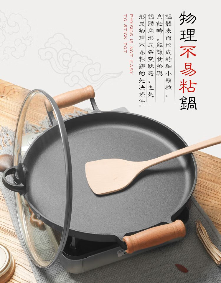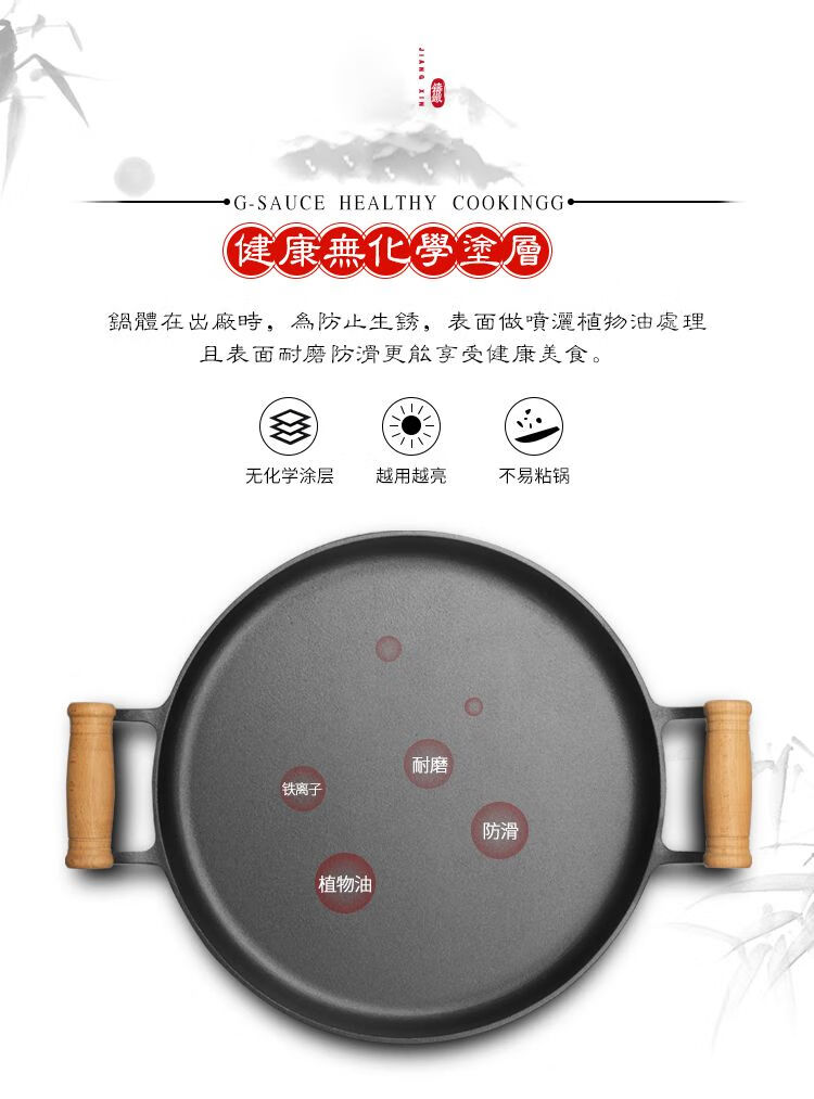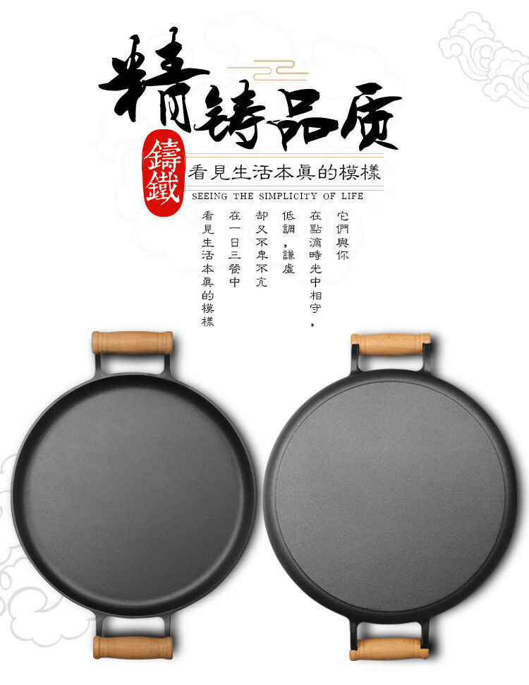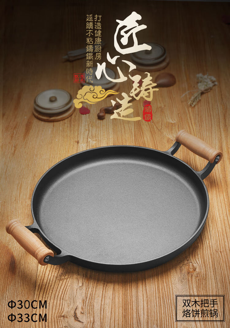 简漾铸铁烙饼锅煎饼锅家用无涂层不粘锅手抓饼煎饼果子工具生铁鏊子 木柄款30cm平底煎锅单锅无工具