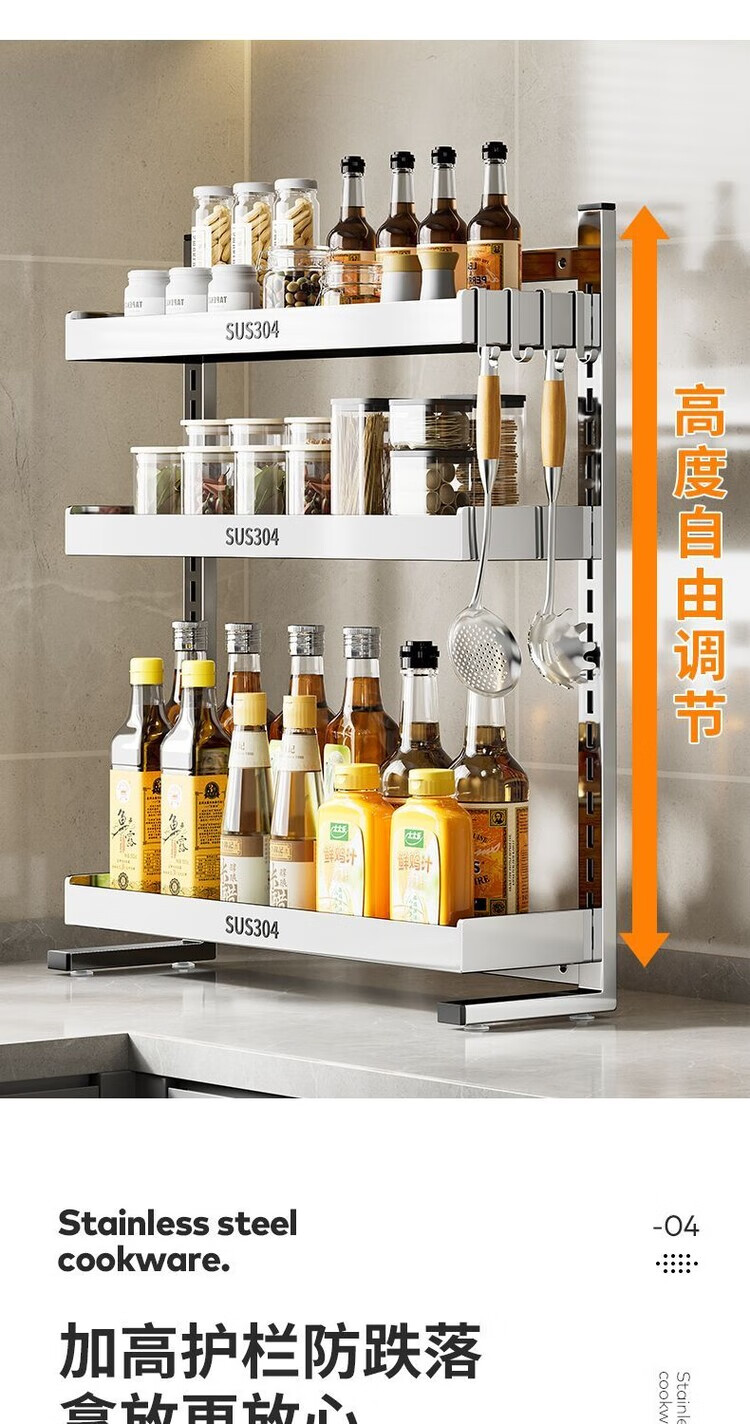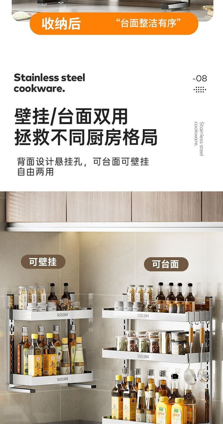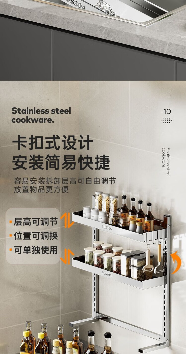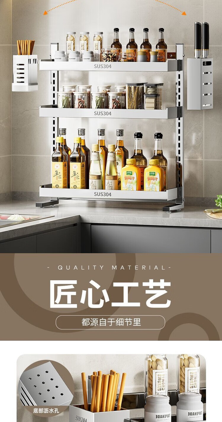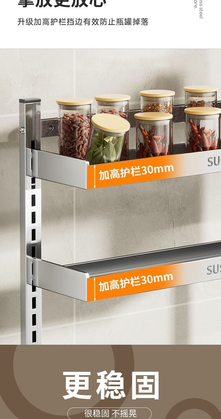 简漾新品304加粗不锈钢厨房调料置物架多功能油盐酱醋收纳壁挂免打孔 两层32+送4勾