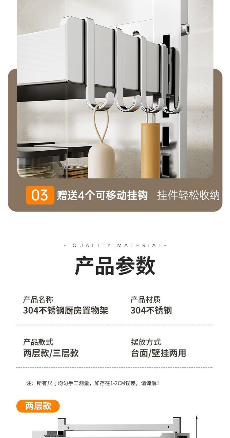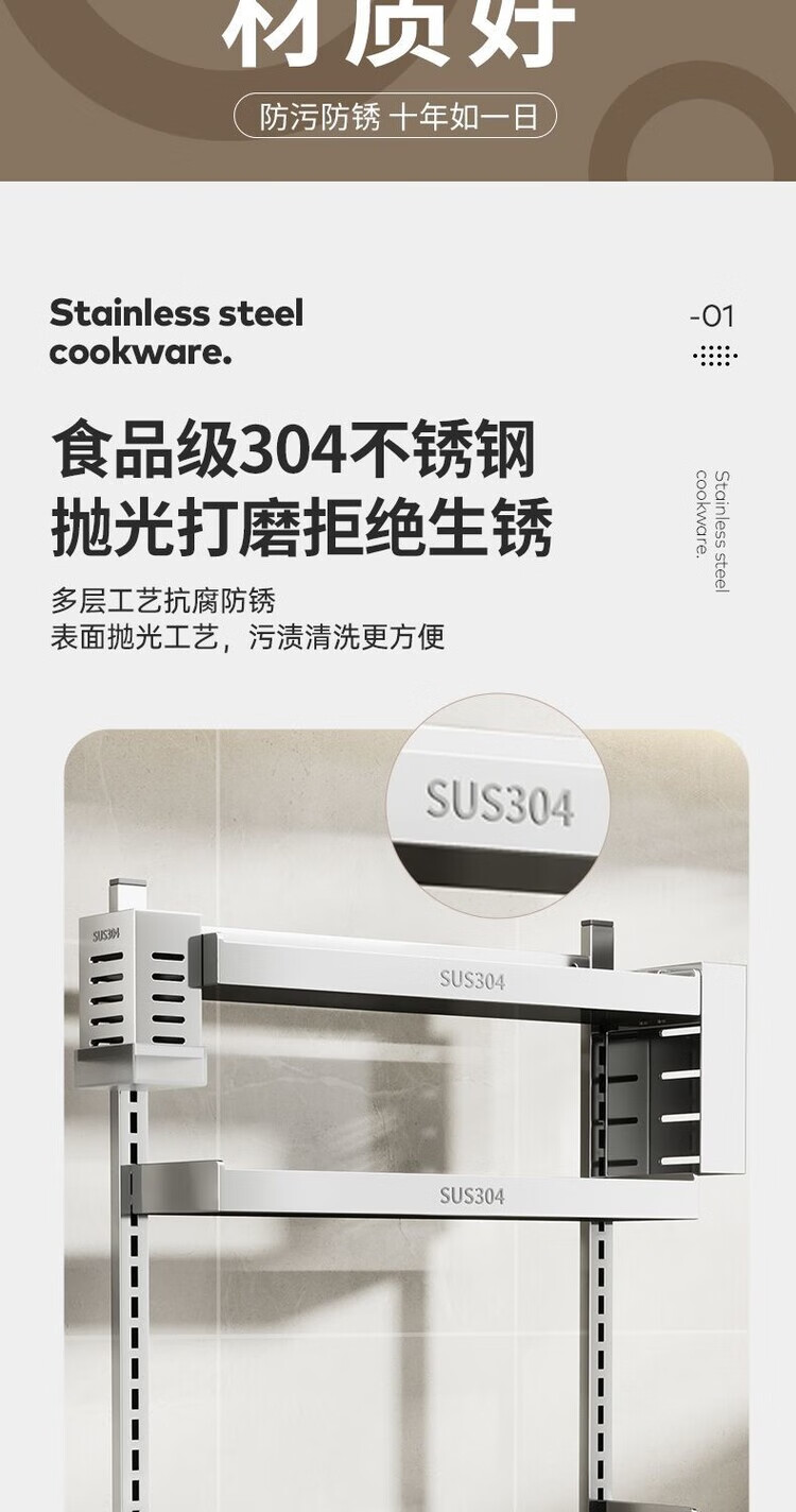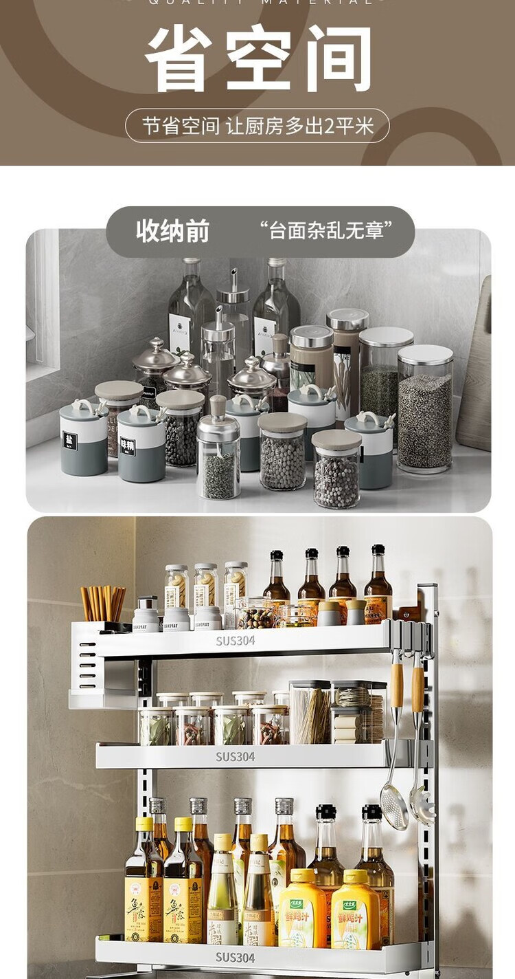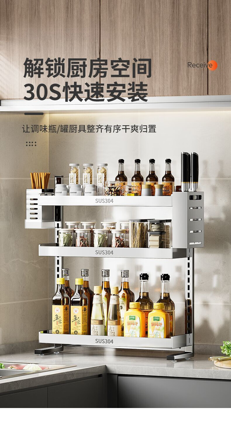 简漾新品304加粗不锈钢厨房调料置物架多功能油盐酱醋收纳壁挂免打孔 两层32+送4勾