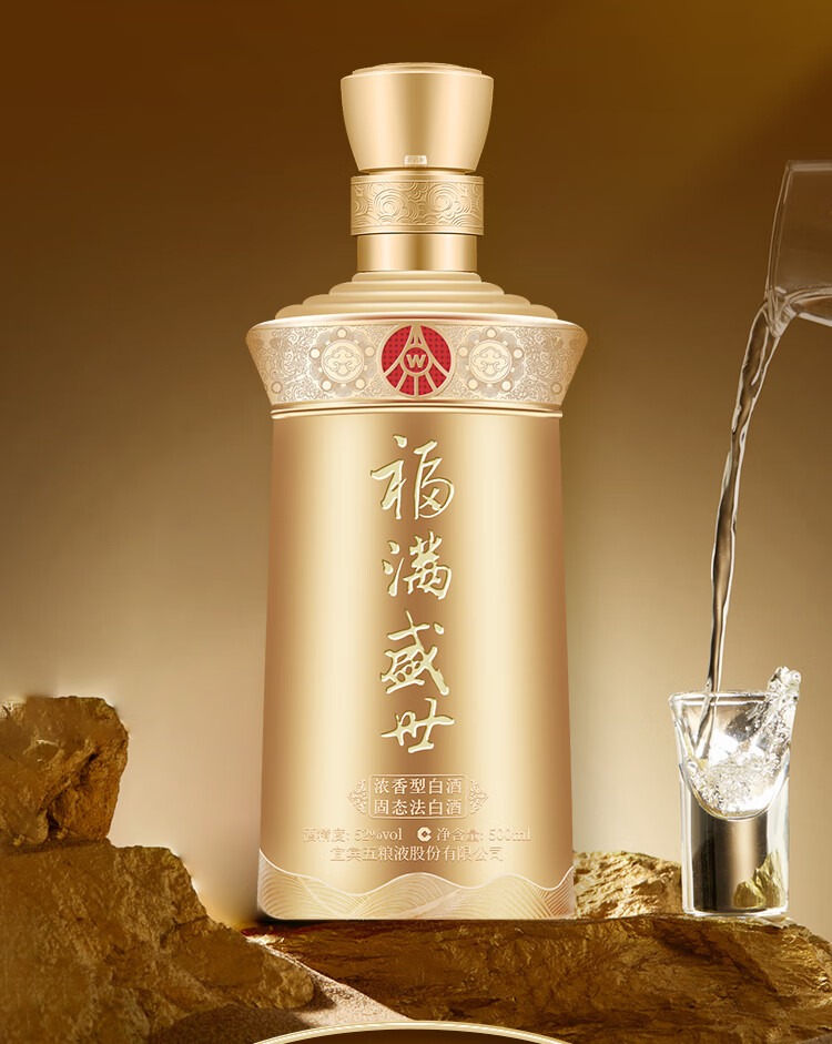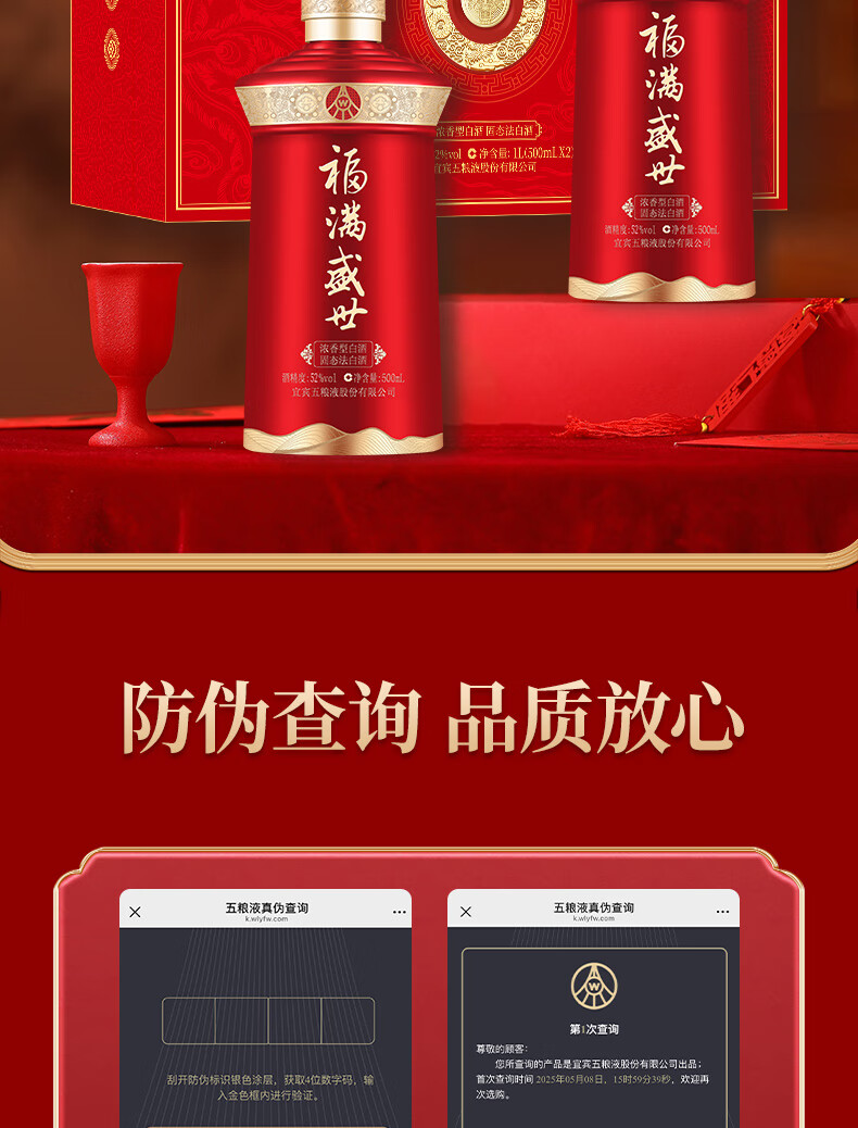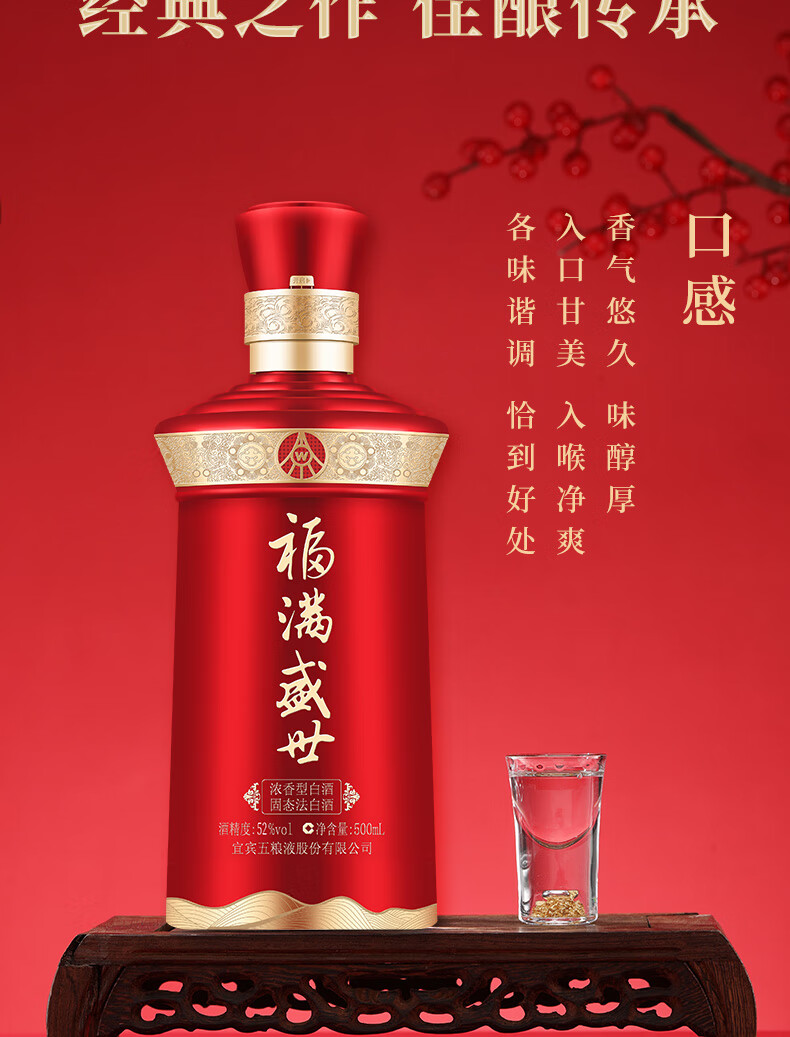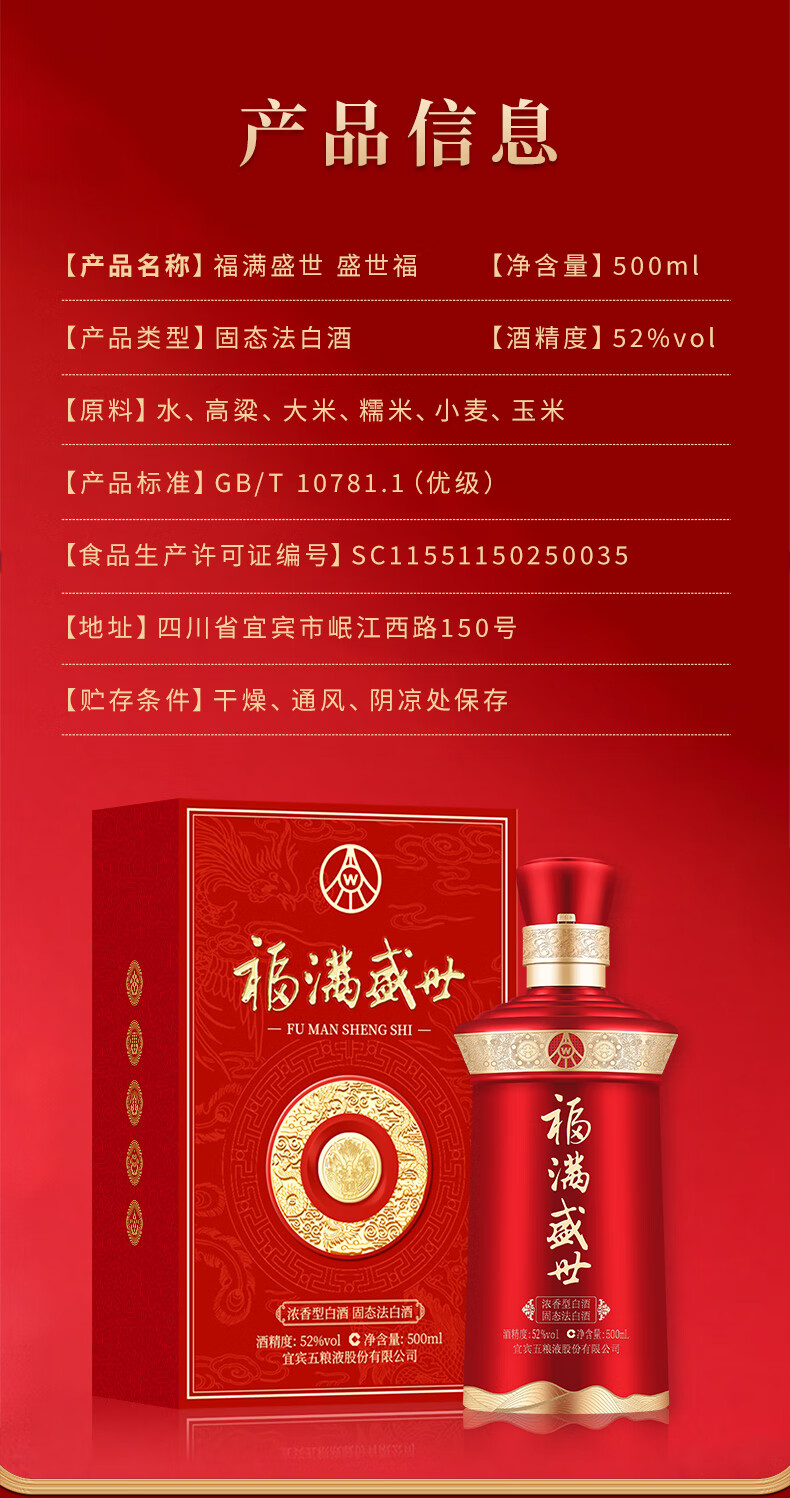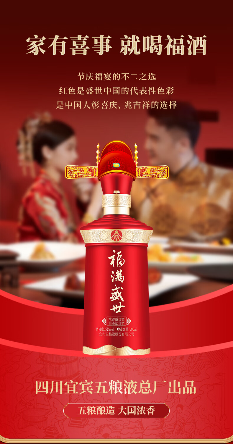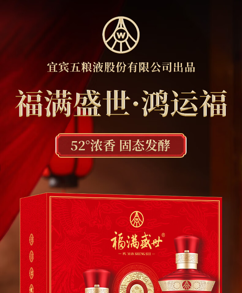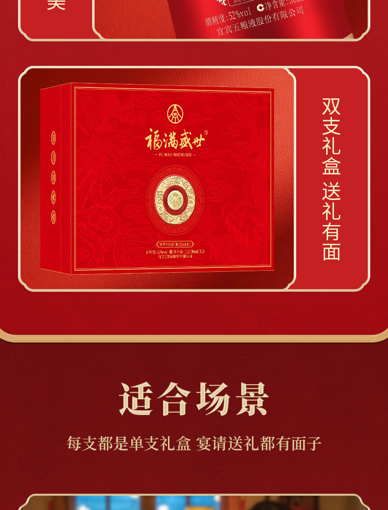 五粮液股份总厂生产 福满盛世酒 52度浓香型白酒 婚宴宴请 送礼礼品 52度 500mL 2瓶 礼盒装(鸿运福)