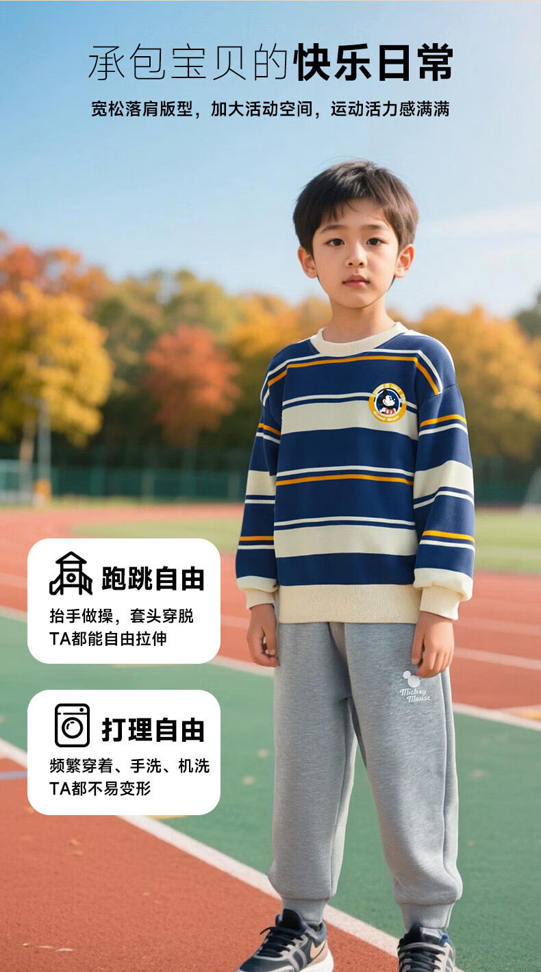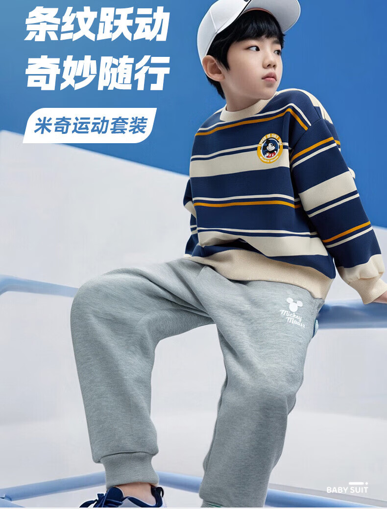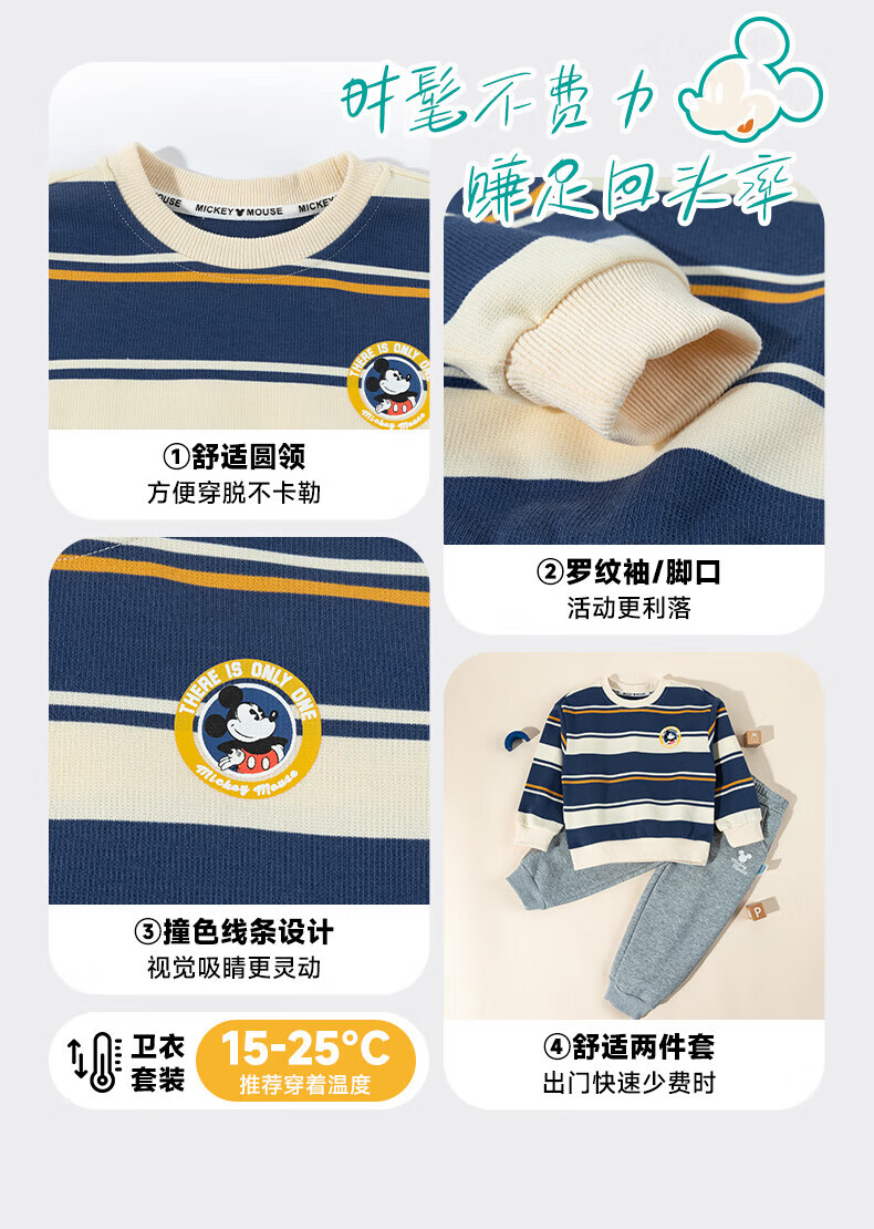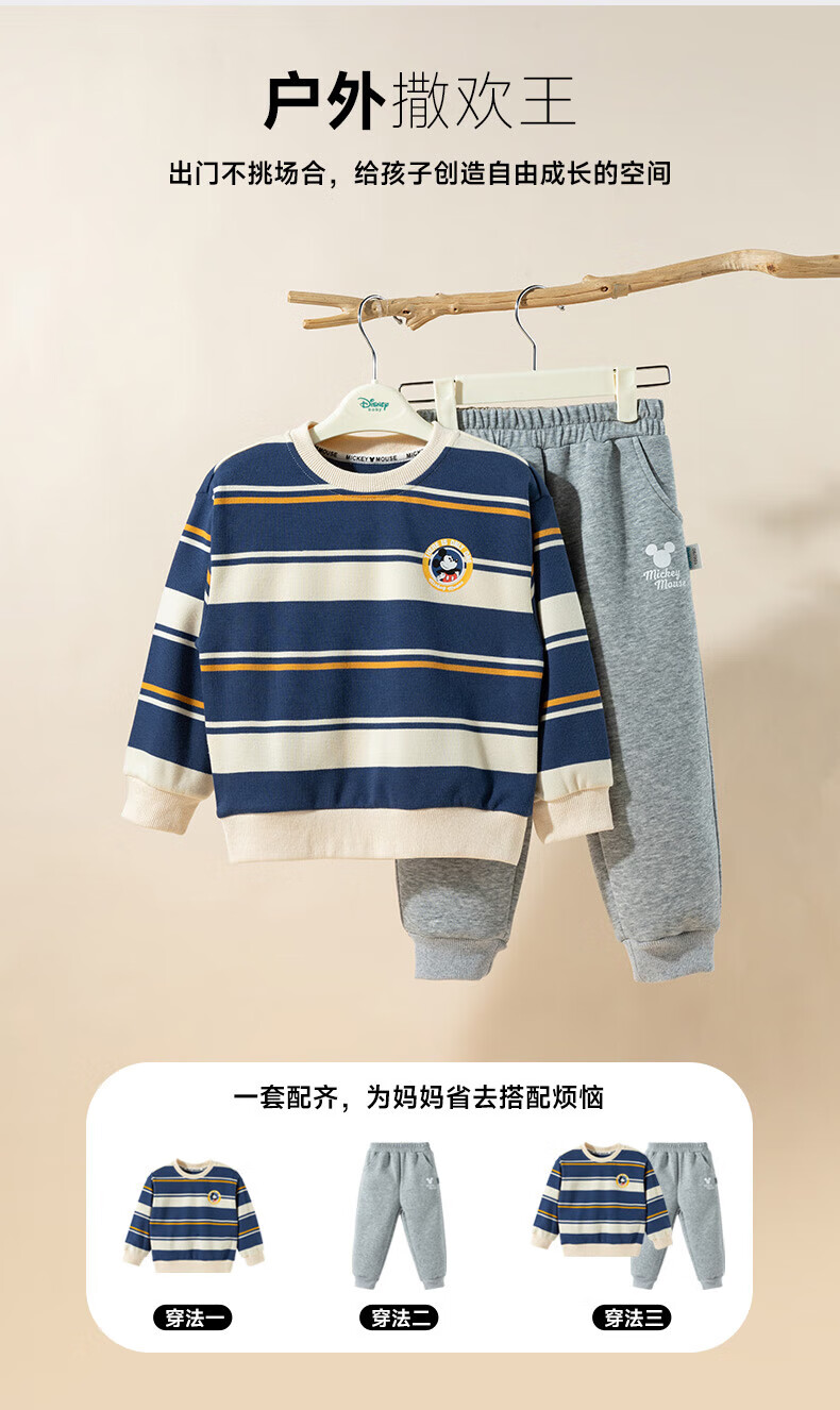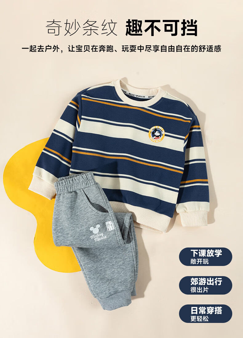 迪士尼(Disney)秋季男女儿童米奇时尚百搭休闲纯棉耐磨亲肤舒适保暖新款卫衣套装 ZD3ET002杏白灰蓝 120