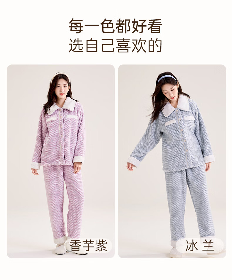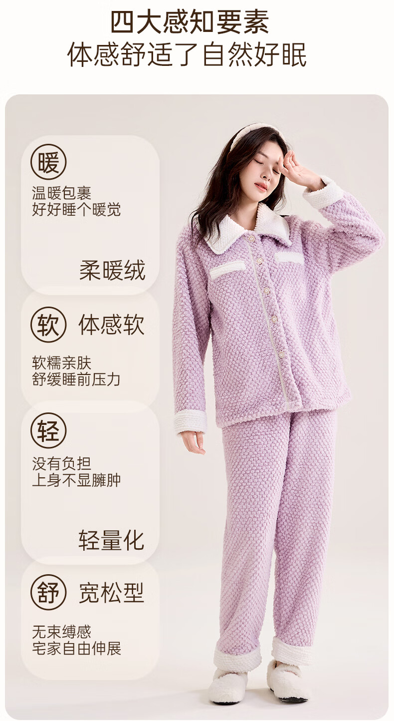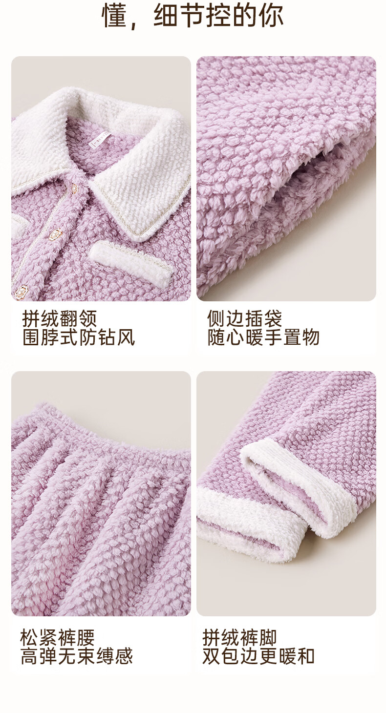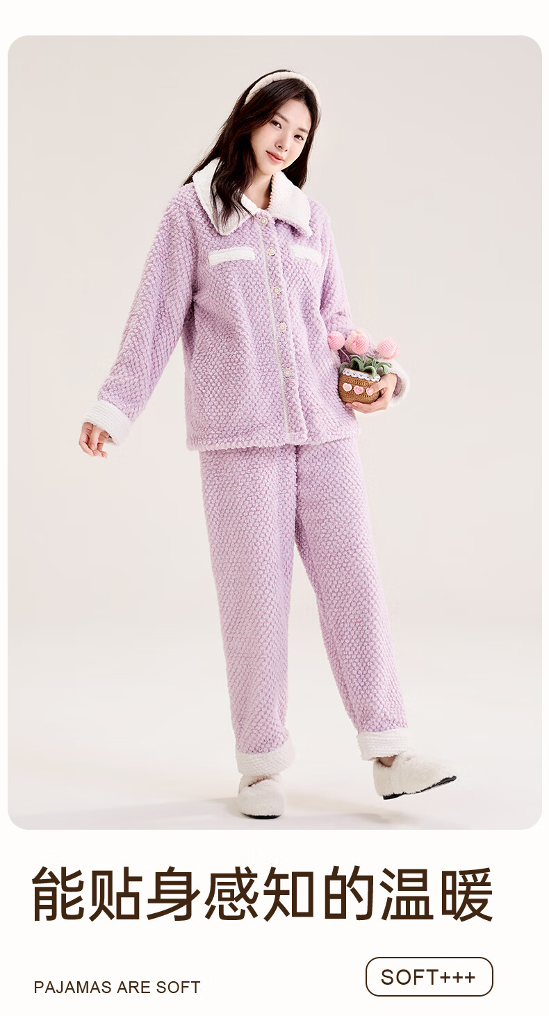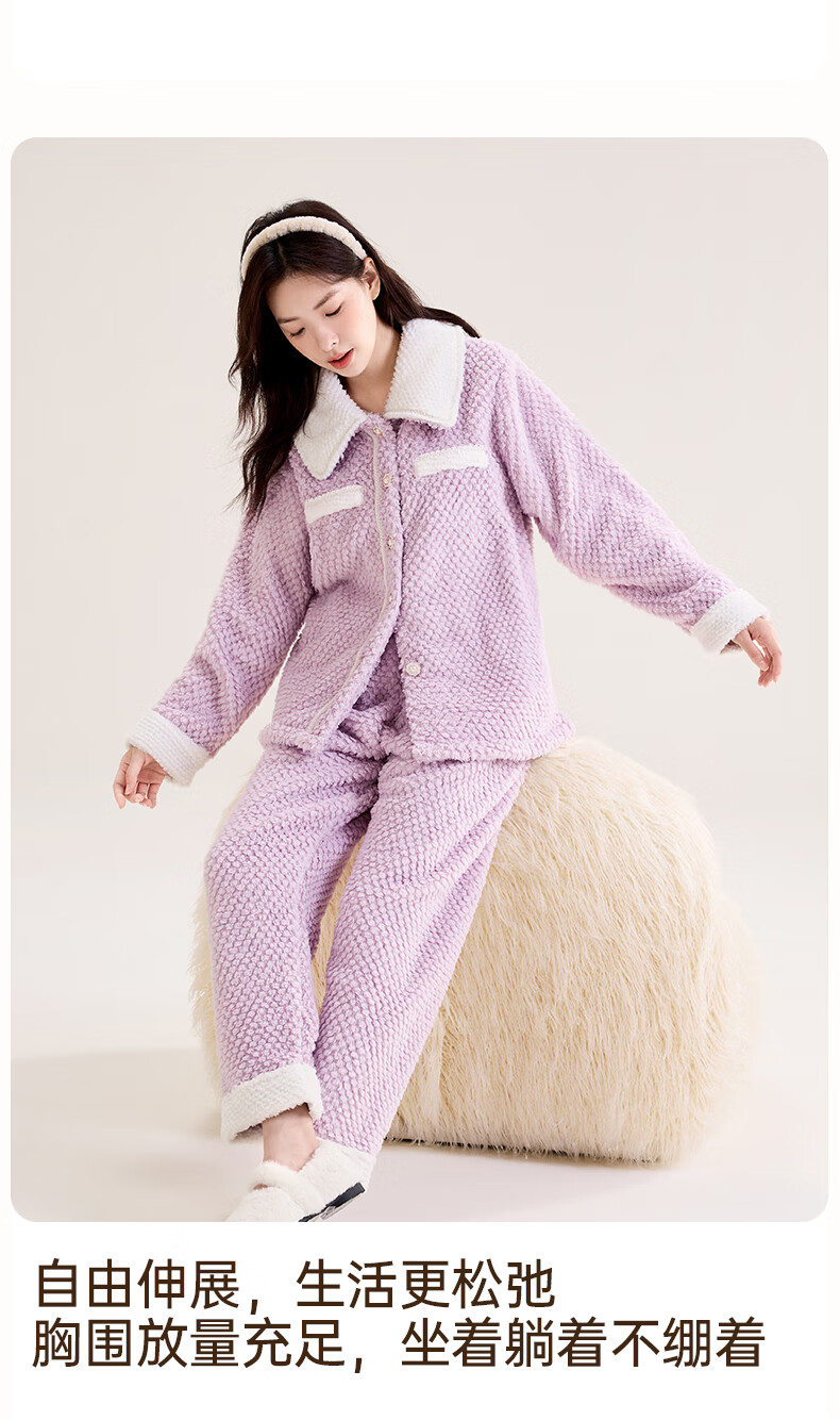 玛伦萨(manza)珊瑚绒睡衣女秋冬季加绒加厚保暖可外穿长袖长裤女士家居服套装 香芋紫 L
