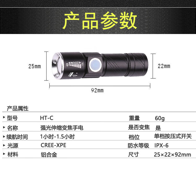 HNTOOLIGHT医用手电筒单档调焦HT-C充电口腔检查小电筒老人幼儿园晨检手电筒 白光