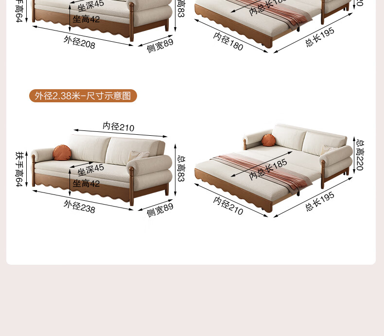 莘联多功能新款中古风实木沙发床两用小户型客厅高端可折叠雪尼尔沙发 外径:1.78m(带储物)白蜡木沙发床 舒适乳胶款(加厚雪尼尔)