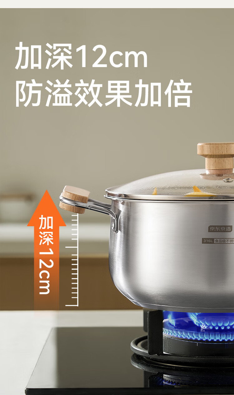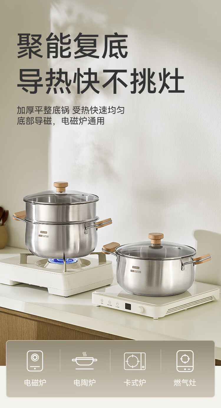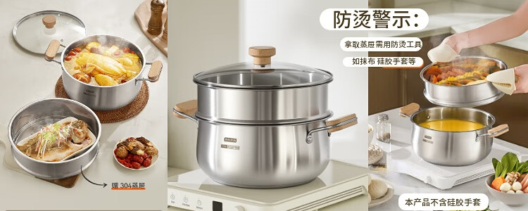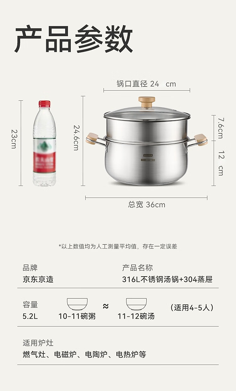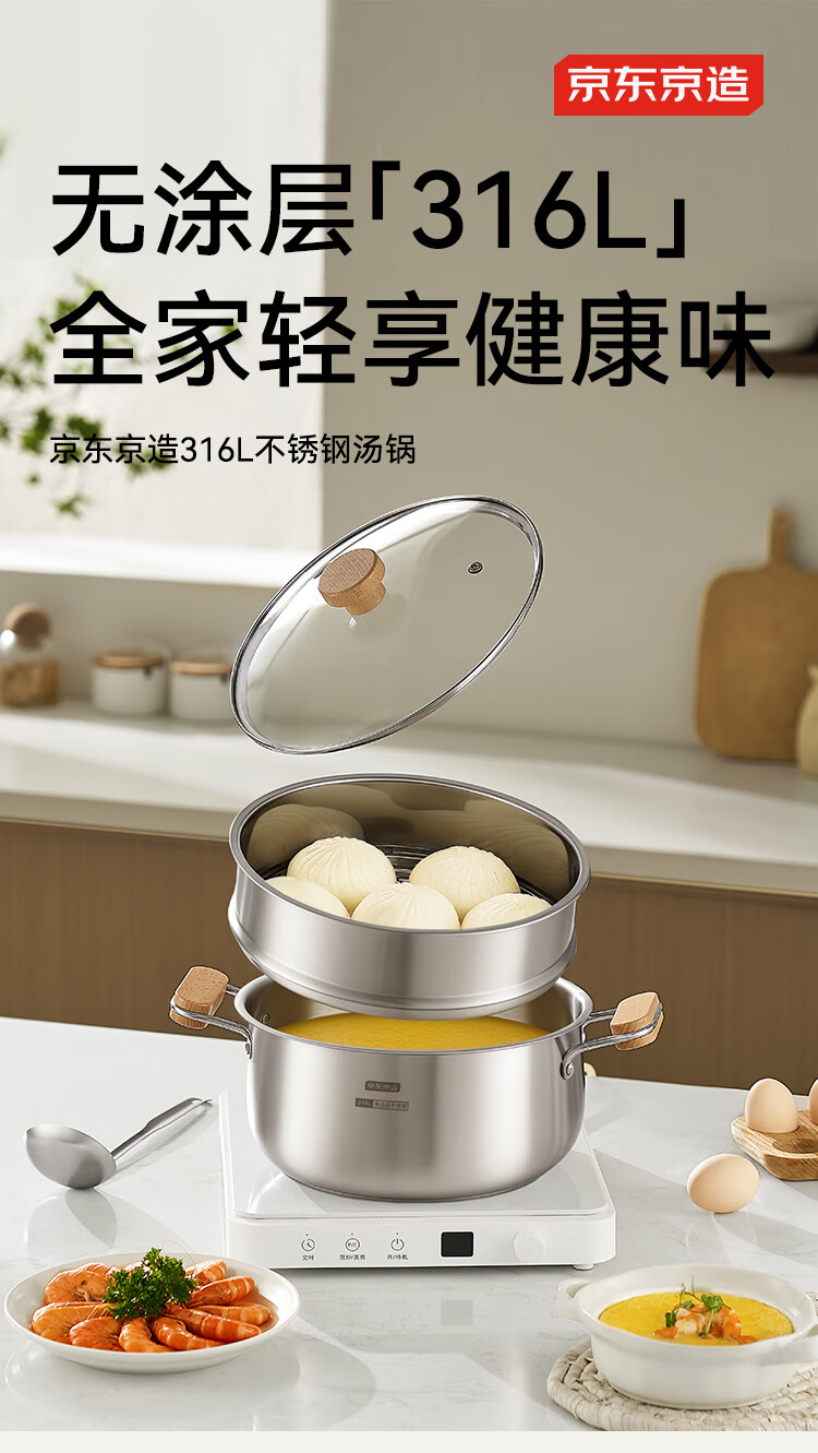 京东京造【316L不锈钢汤锅+蒸屉】无涂层家用双层多功能两用汤蒸锅24cm