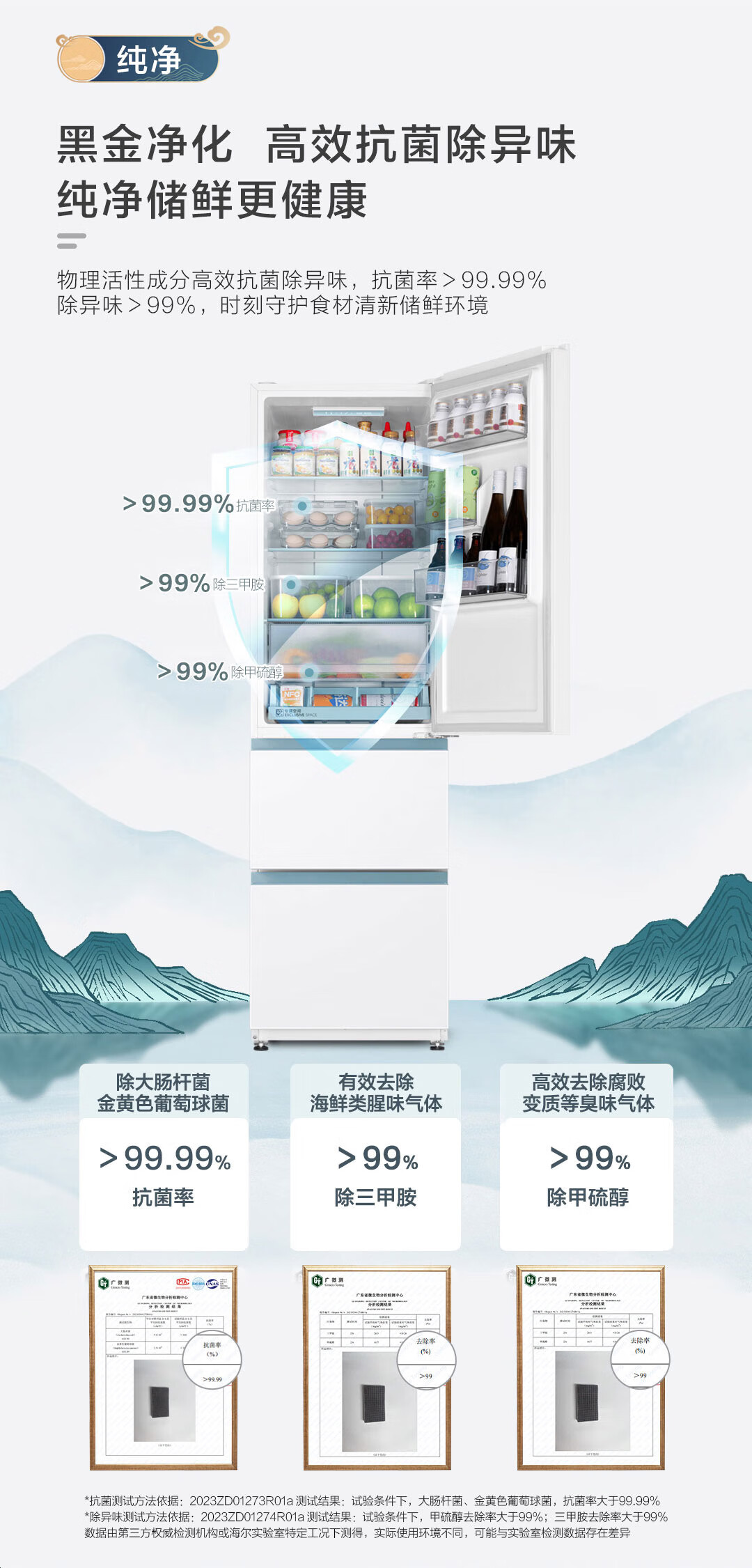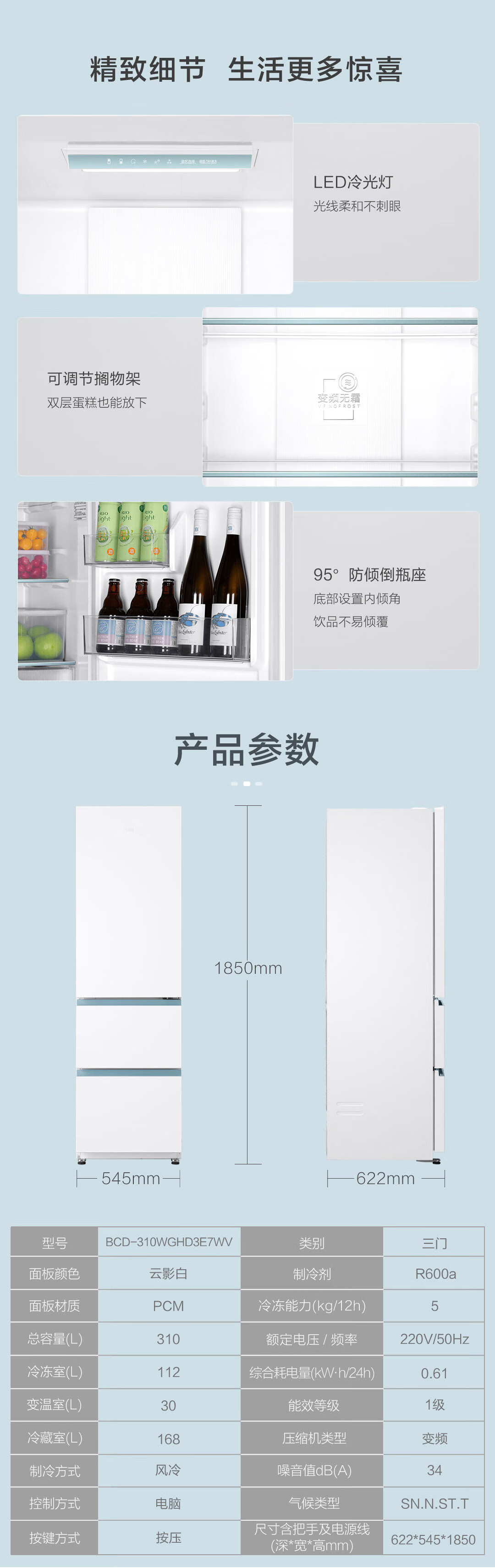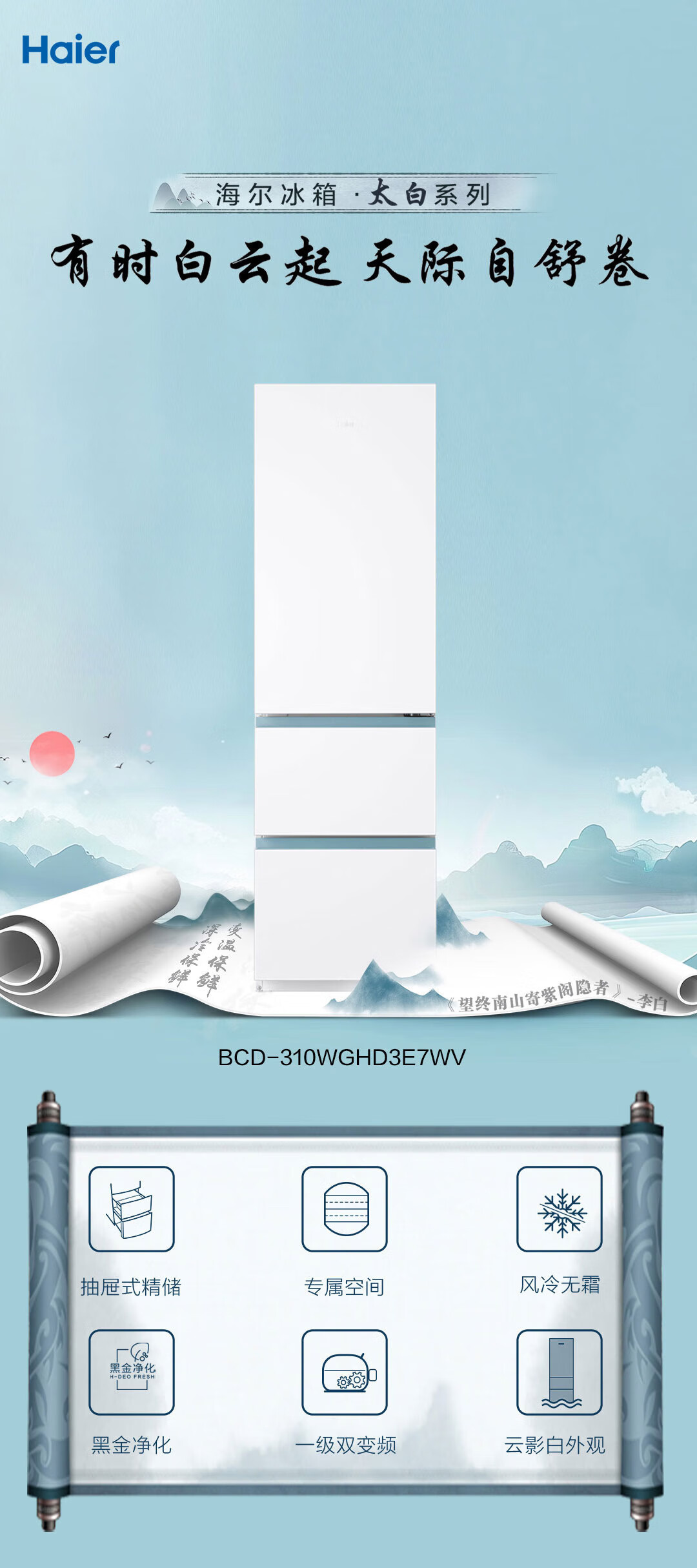 海尔(Haier)国家补贴20%太白310升风冷无霜黑金净化三档变温抽屉式三开门家用电冰箱一级能效节能变温以旧换新 【咨询领补贴】BCD-310WGHD3E7WV
