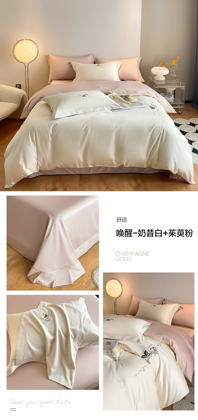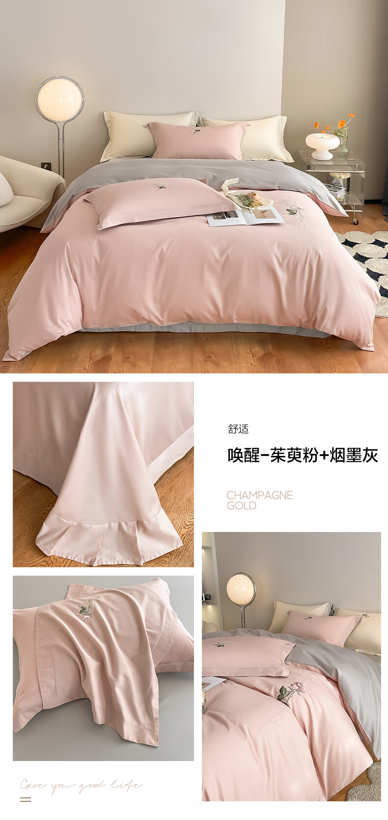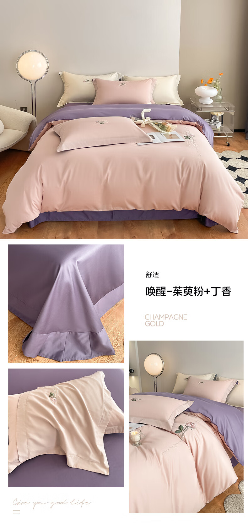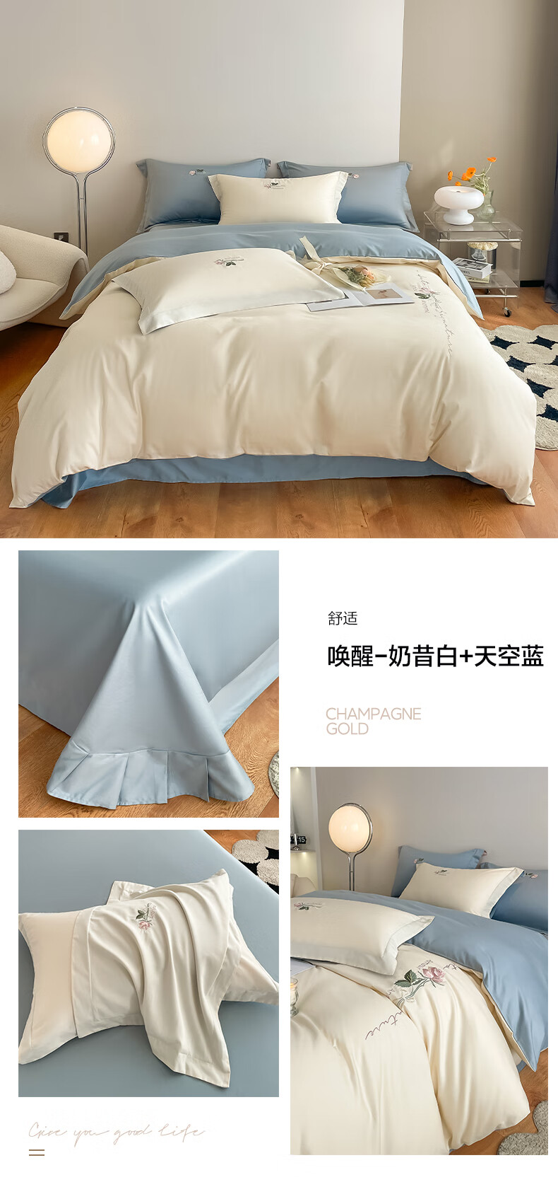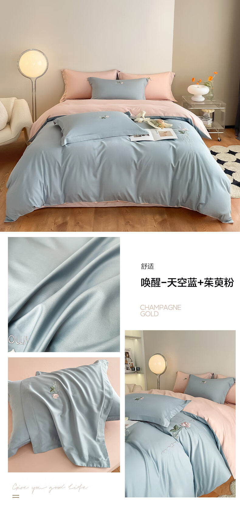 元族2025新款A类纯棉四件套轻奢刺绣全棉被套简约纯色四件套-唤醒 唤醒-天空蓝+茱萸粉 床单款 1.8m四件套