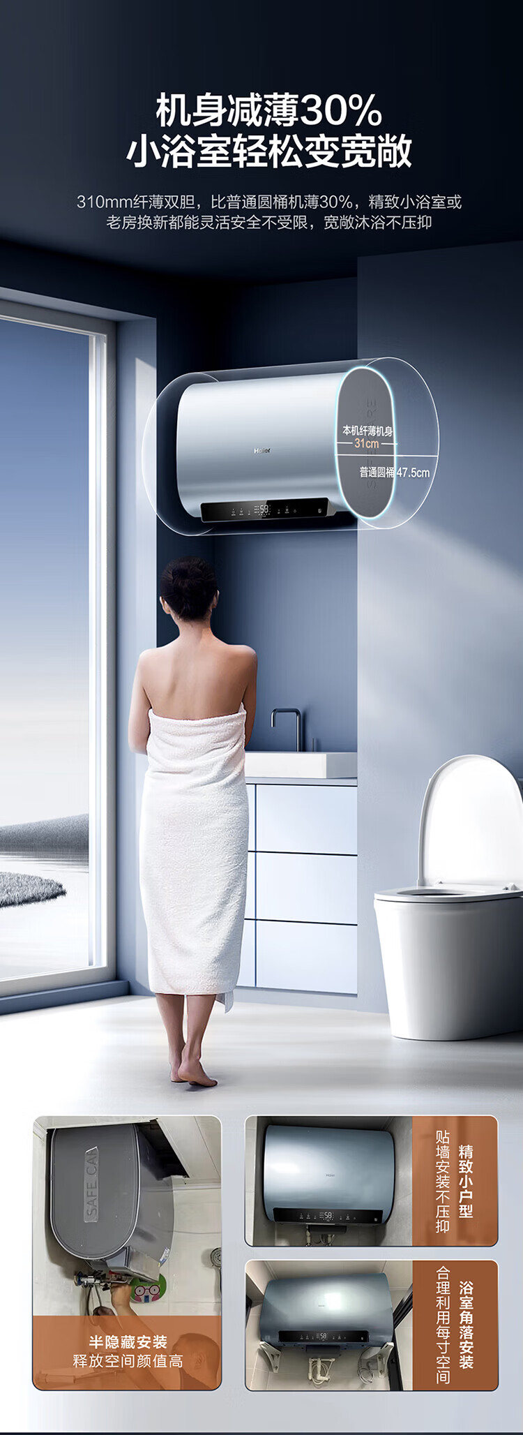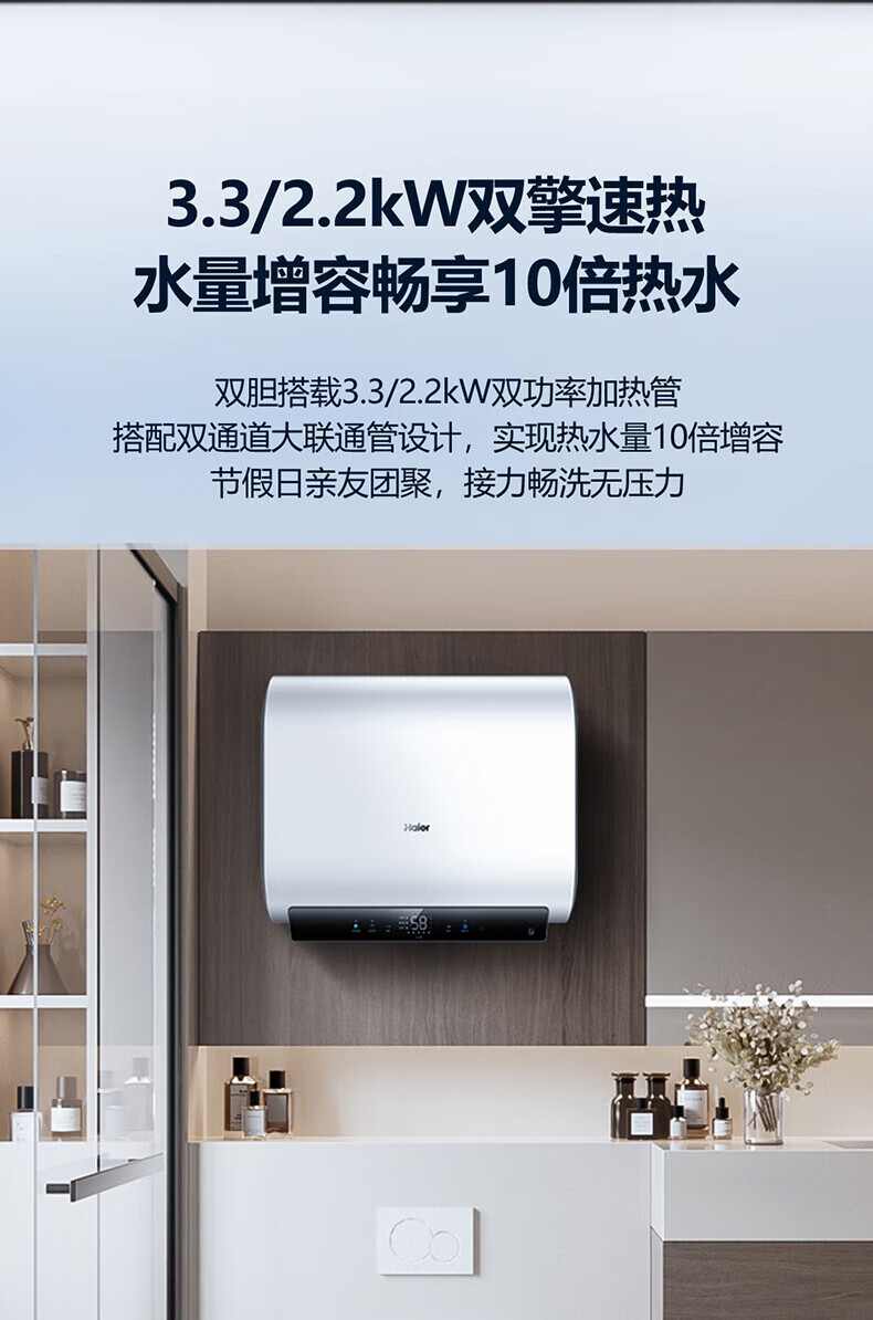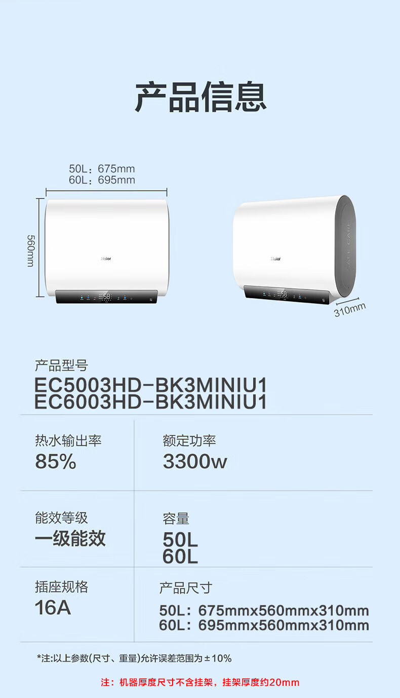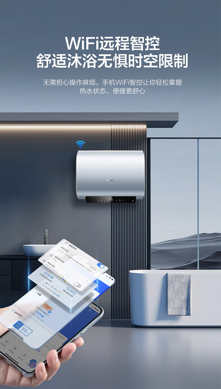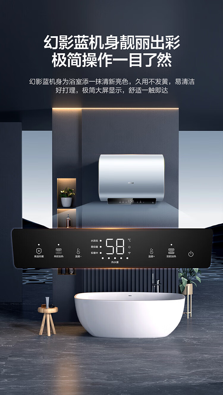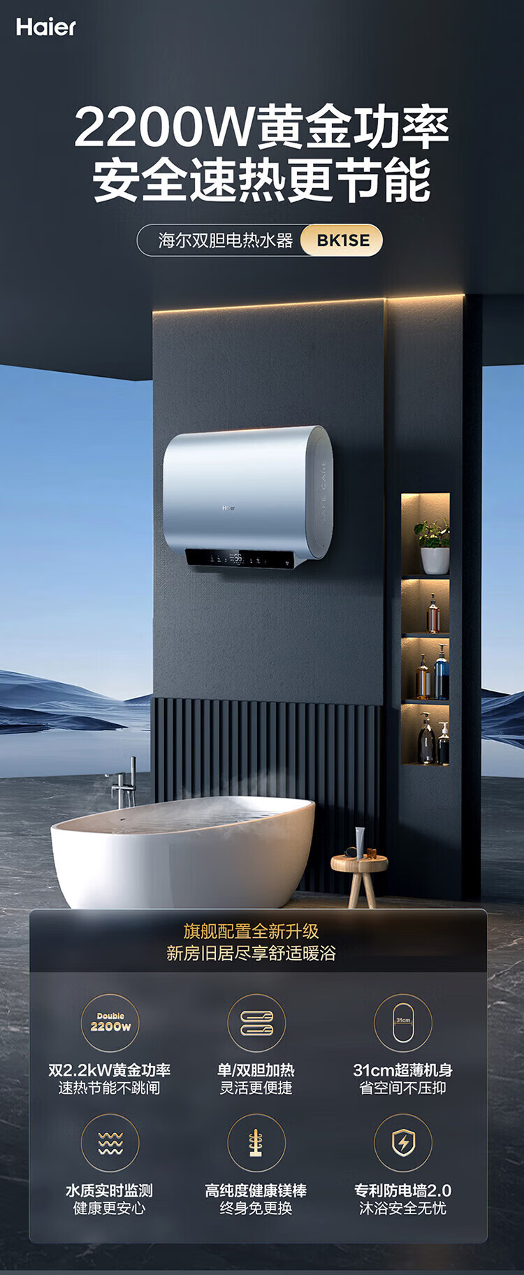海尔(Haier)热水器 超薄双胆 电热水器60升 一级能效扁桶储水式BK1SE/BK3MINI 镁棒免更换WIFI智控 60L 2200W BK1SE升级款