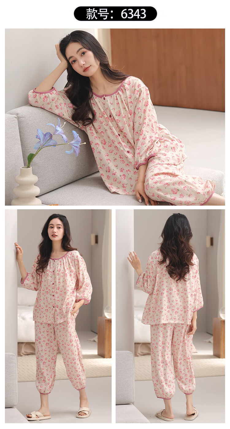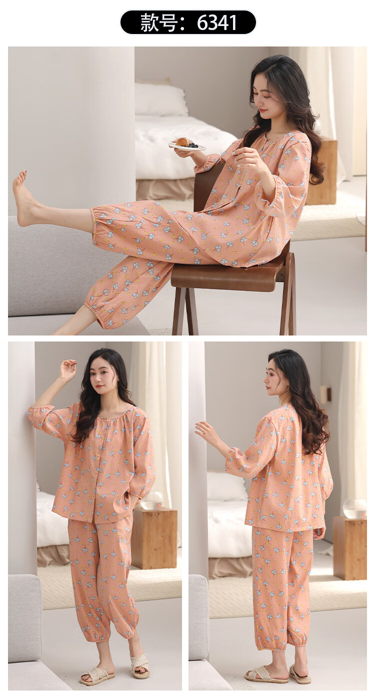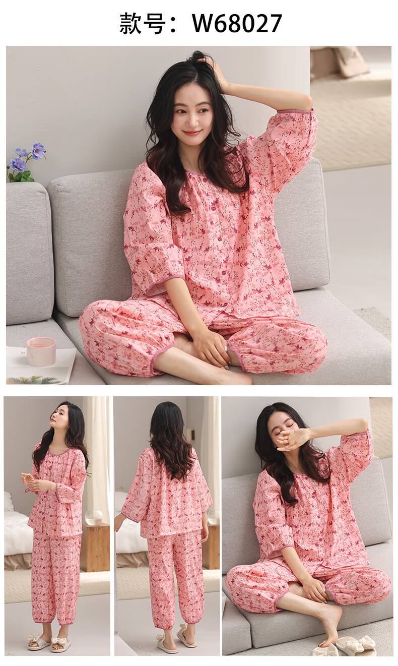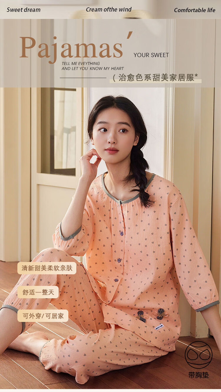 【现货现发】韩版睡衣女夏季春秋带胸垫七分袖两件套装薄款甜美家 自带胸垫A2337 M 女【80-95斤】
