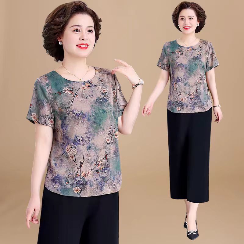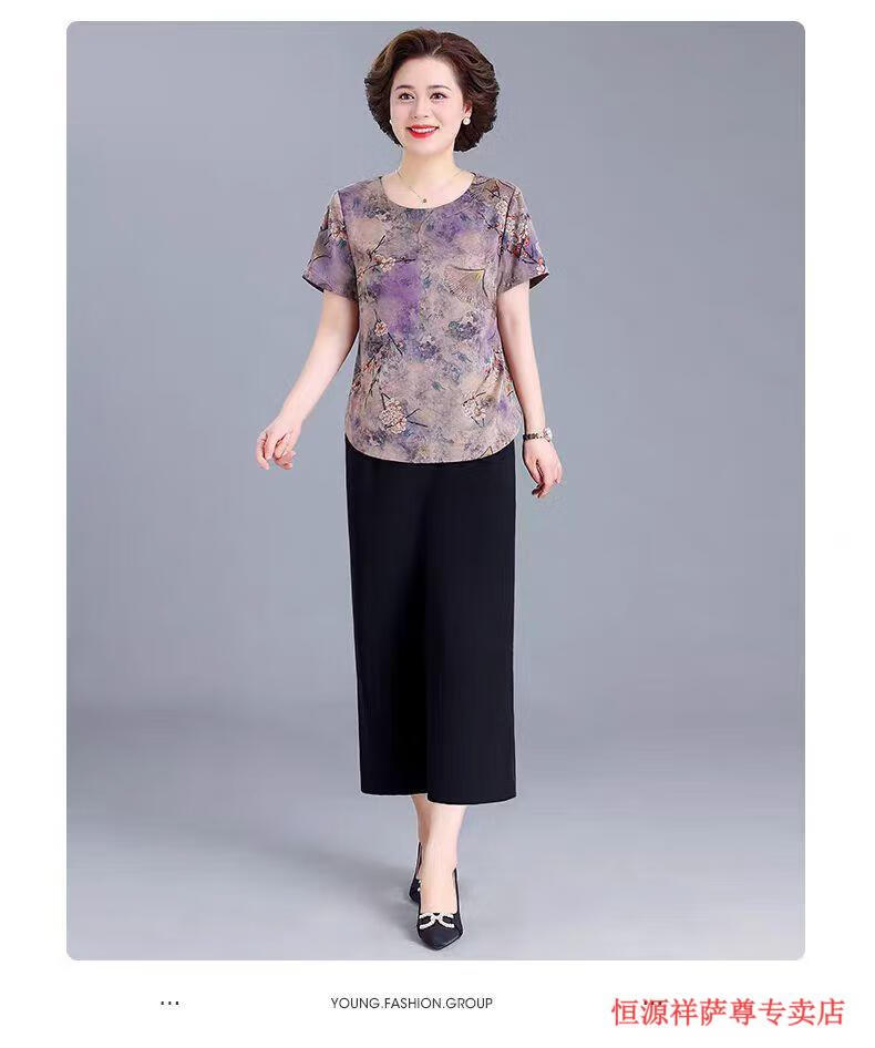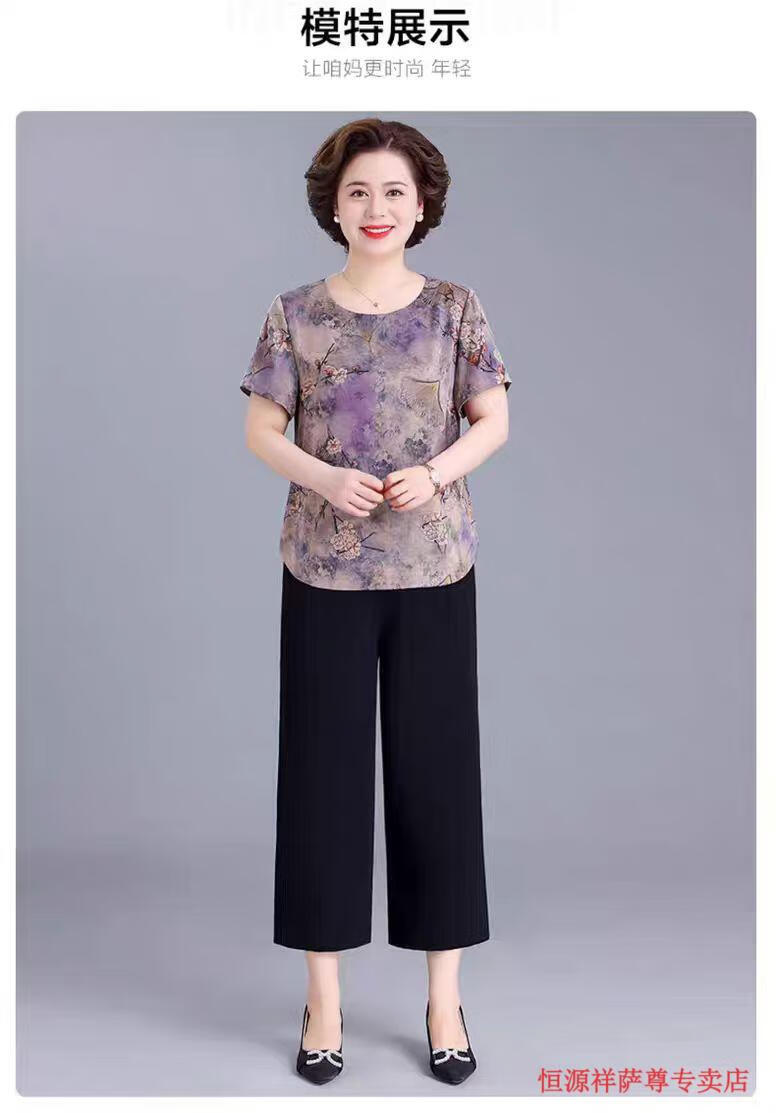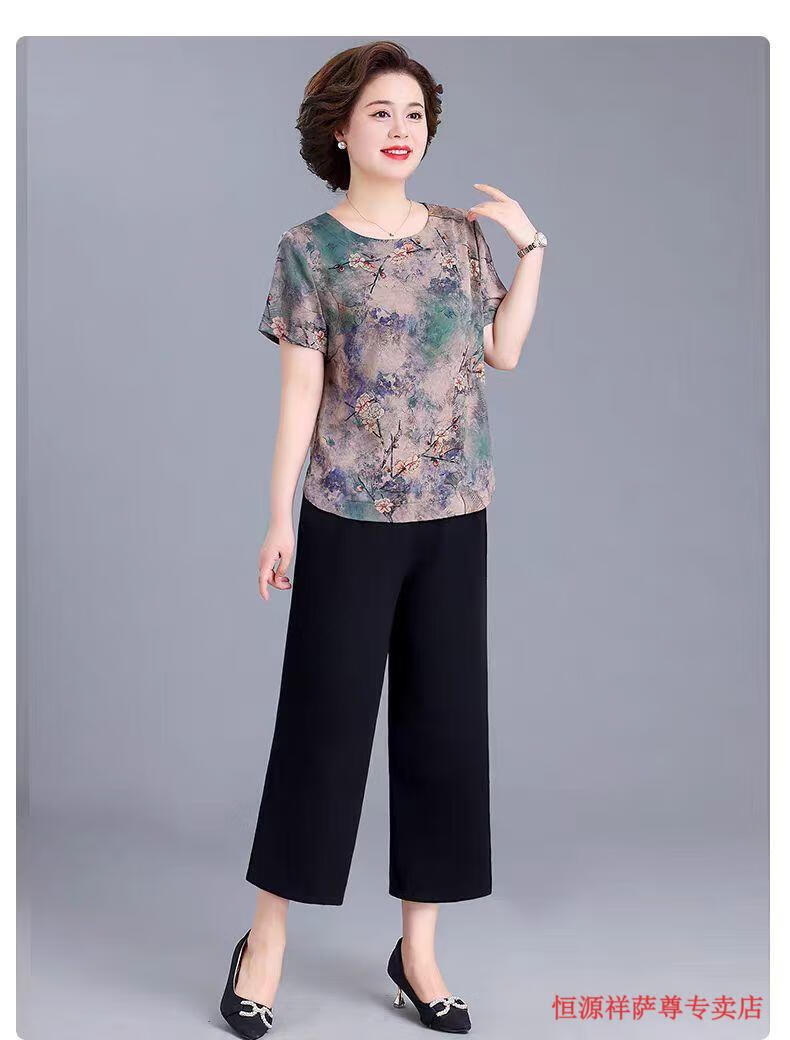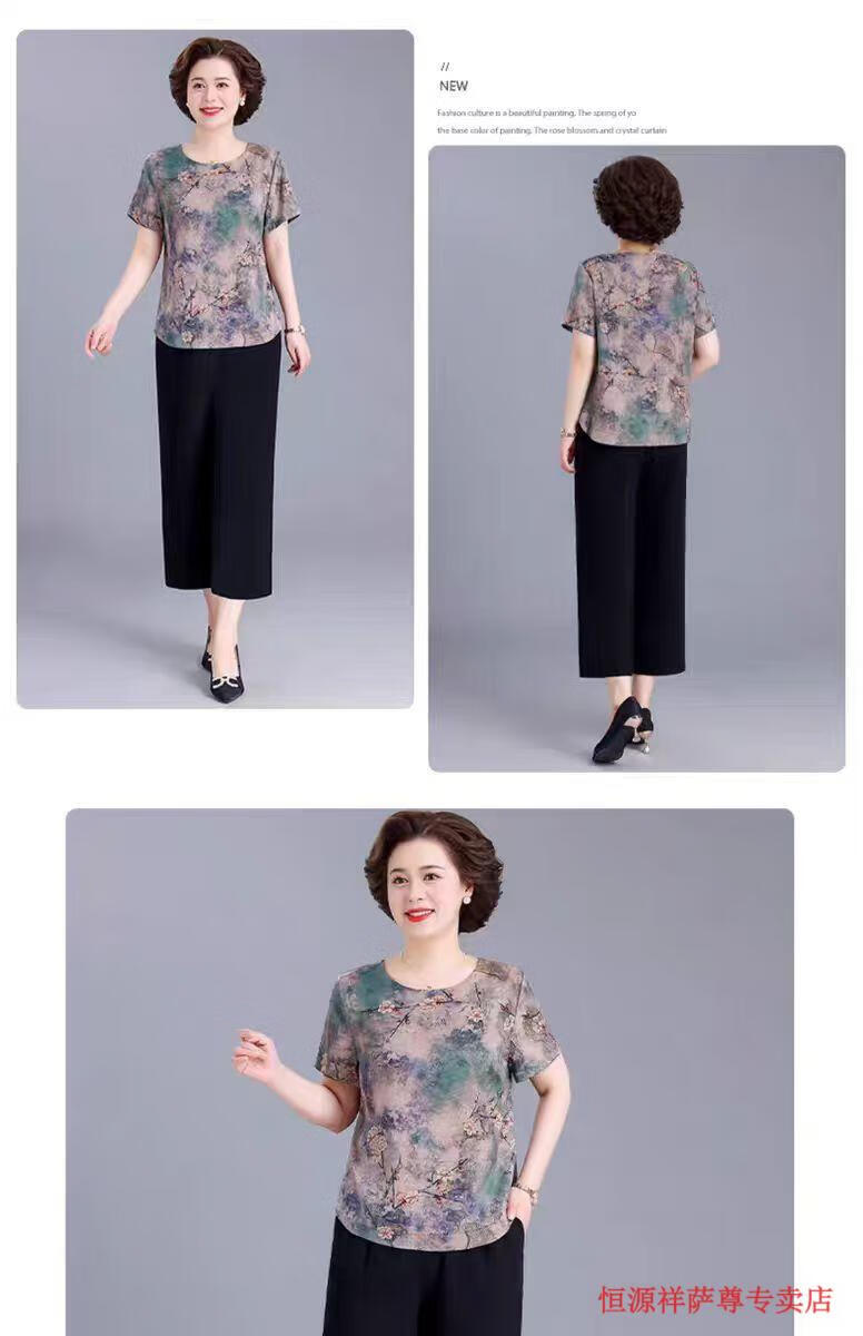 恒源祥冰丝妈M妈装印花夏季透气短袖t恤中年老年宽松大尺码凉爽女装洋气 绿色上衣 【单上衣】 L 建议105-120斤