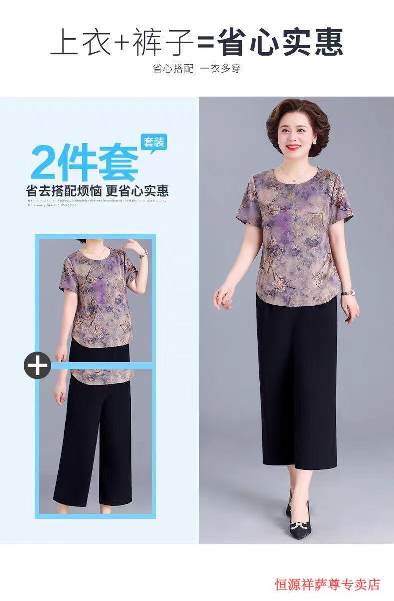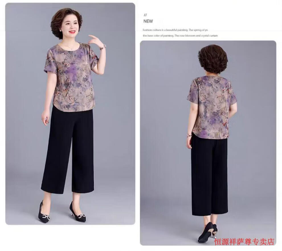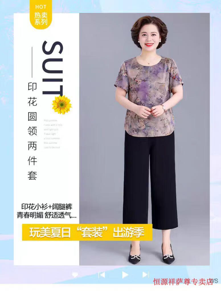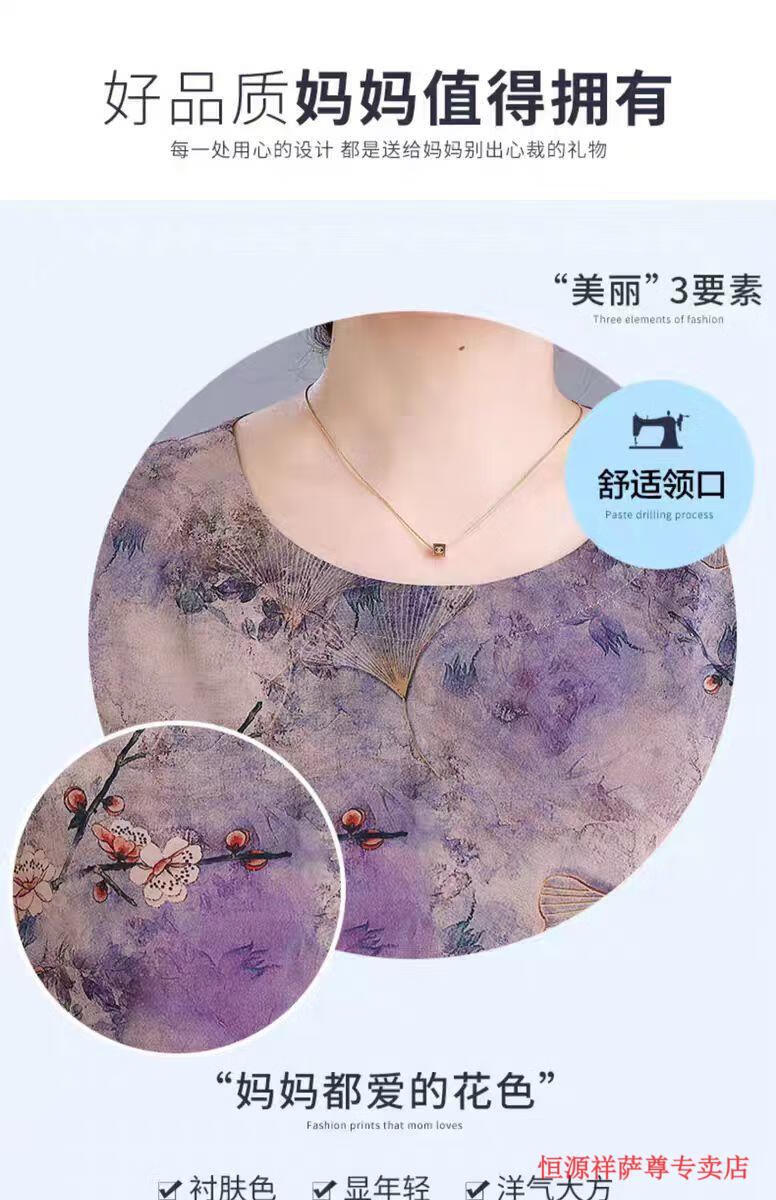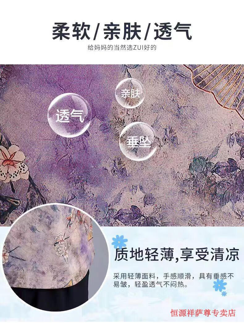 恒源祥冰丝妈M妈装印花夏季透气短袖t恤中年老年宽松大尺码凉爽女装洋气 绿色上衣 【单上衣】 L 建议105-120斤