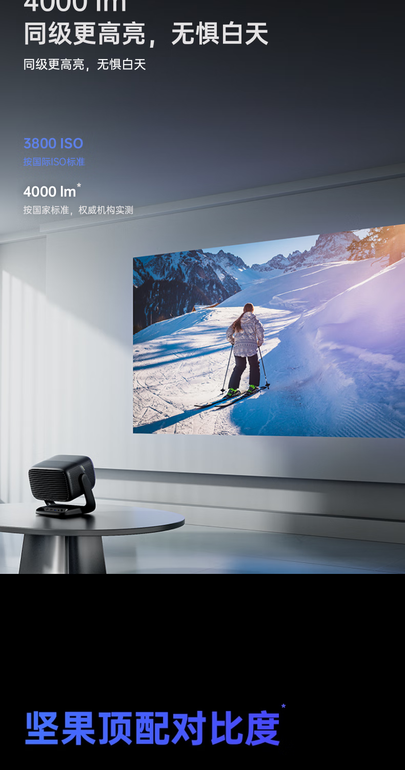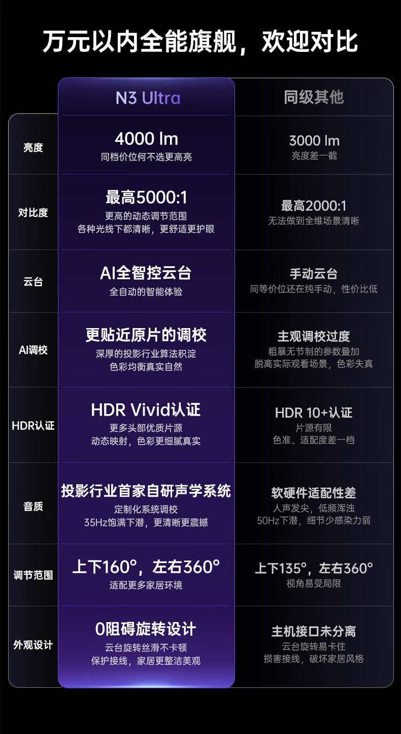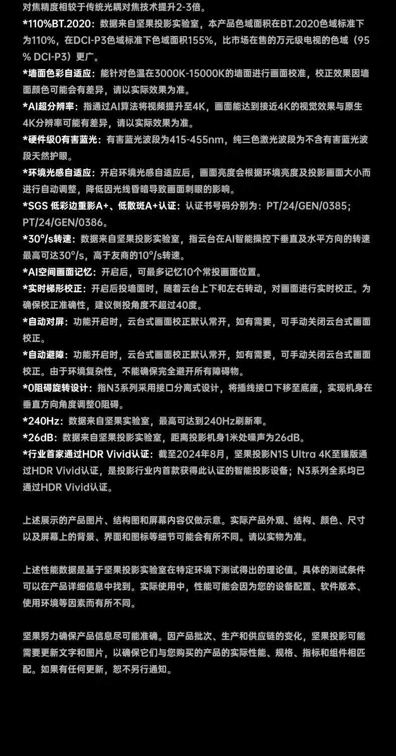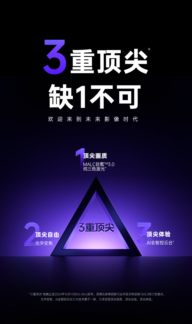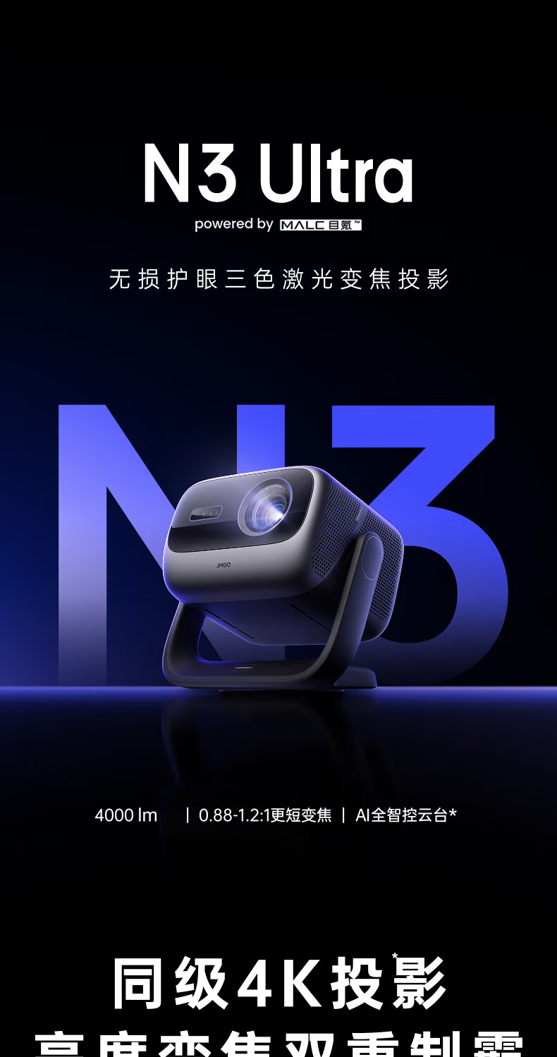 坚果投影(JMGO)N3 Ultra 纯三色激光变焦投影4000lm+AI全智控电动云台 4K超高清投影仪家庭影院国家补贴20%