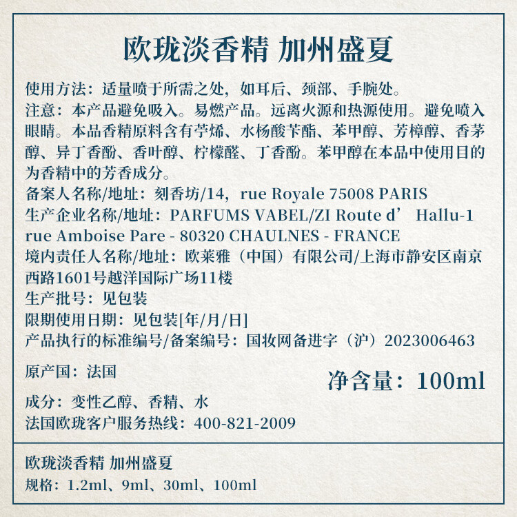 欧珑加州盛夏香水30ml 香水礼盒生日礼物节日送女友