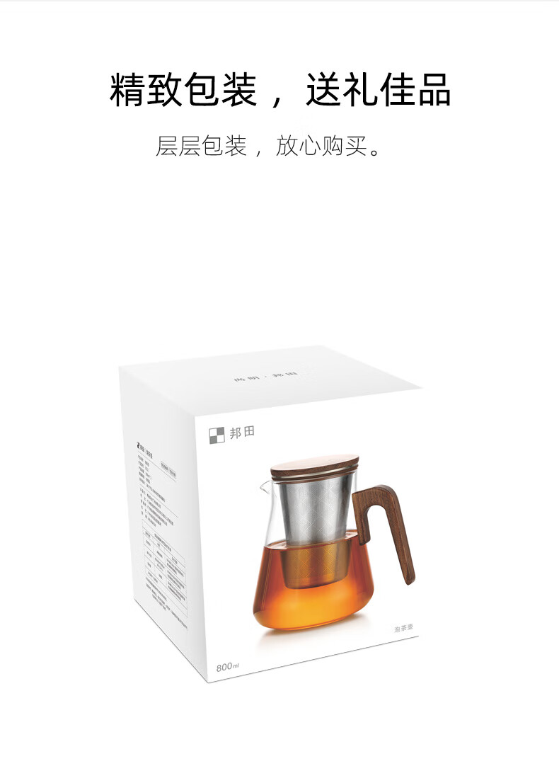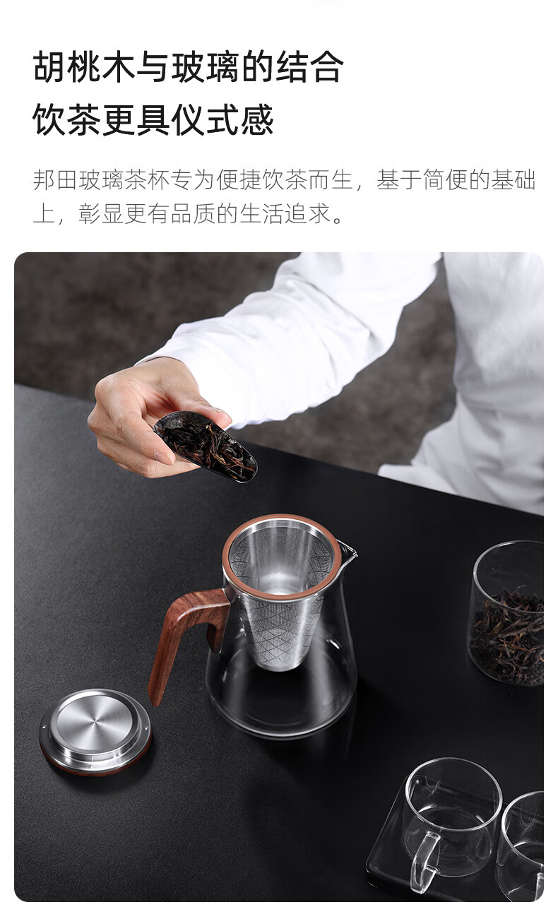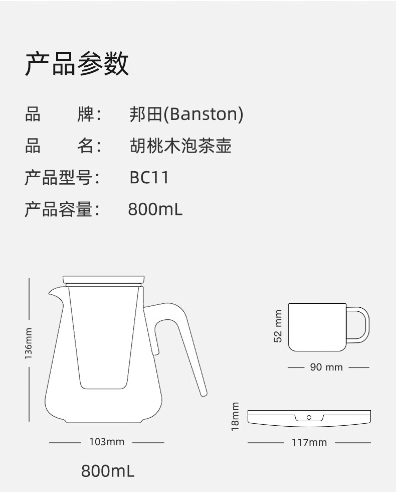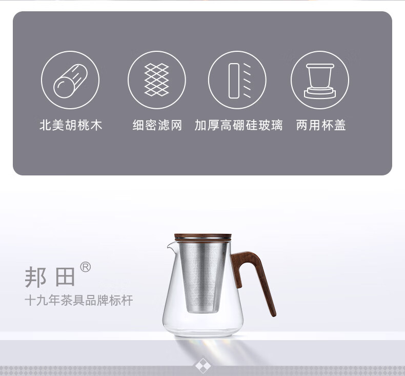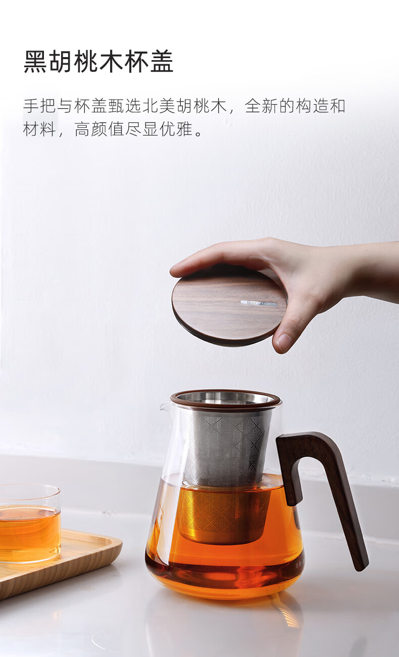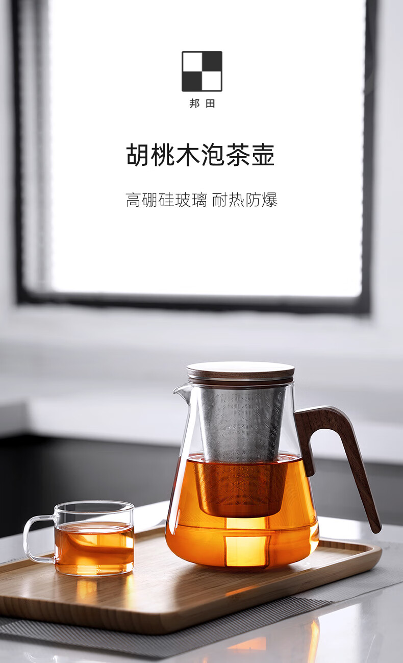 邦田(Bonston)办公室懒人泡茶壶胡桃木把大容量玻璃茶壶不锈钢内胆茶水分离茶具 800ML单壶