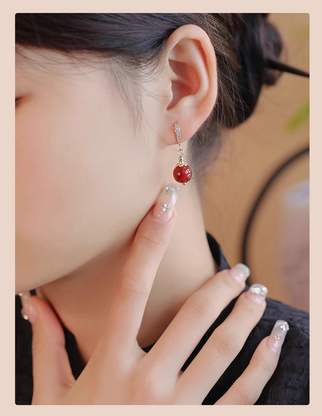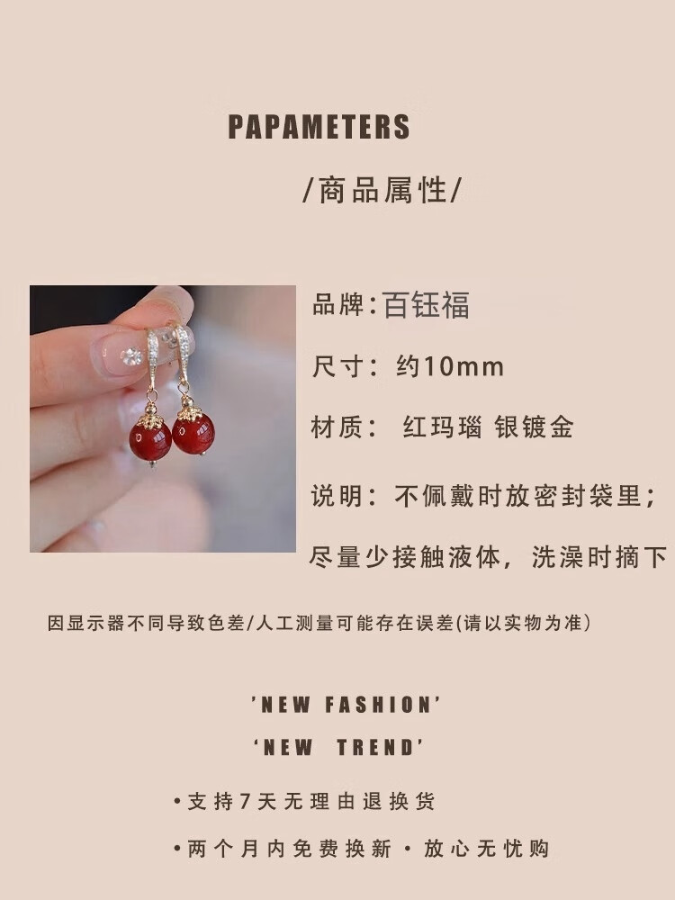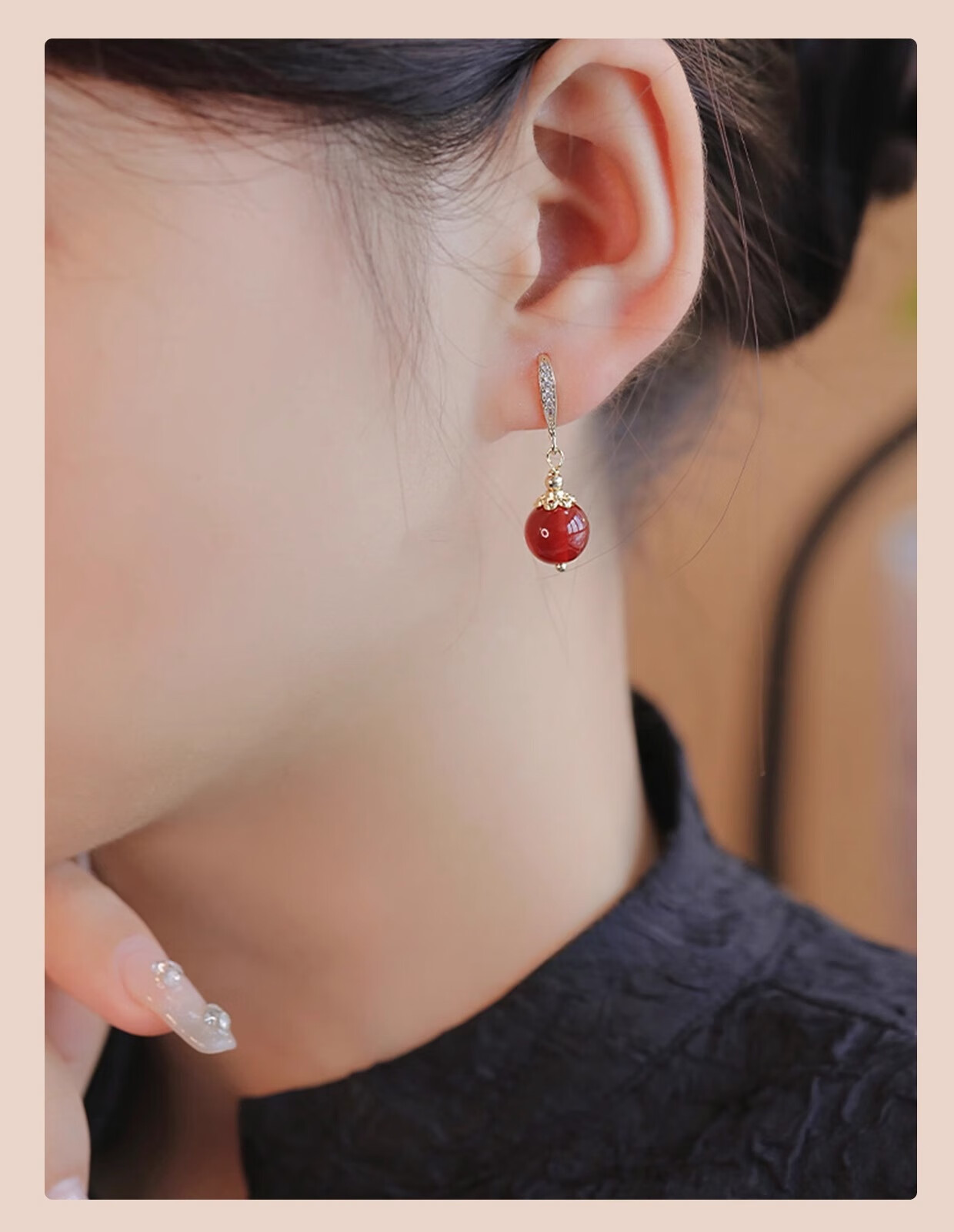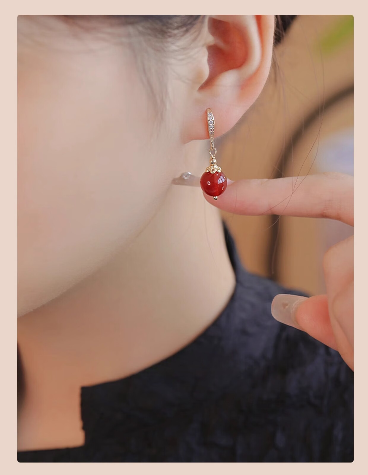 百钰福红色玛瑙耳环女轻奢复古气质耳坠高级感耳饰情人节礼物送女友老婆 红玛瑙耳环 精美礼盒