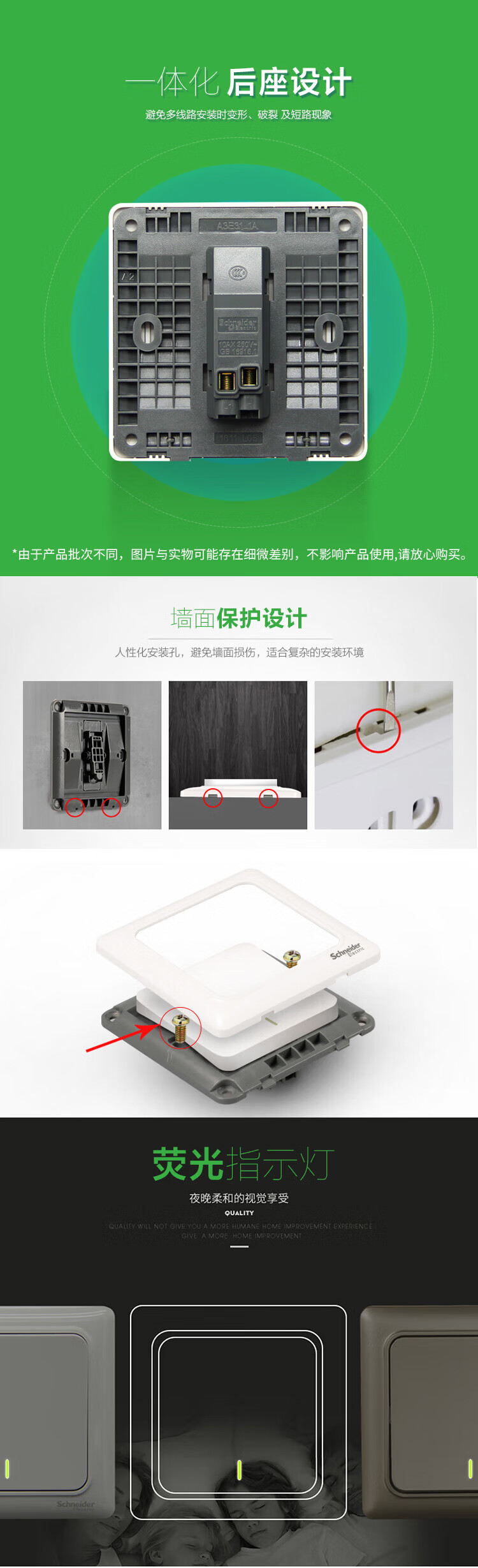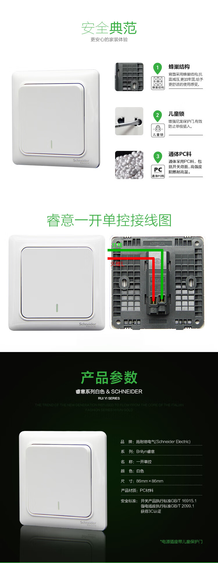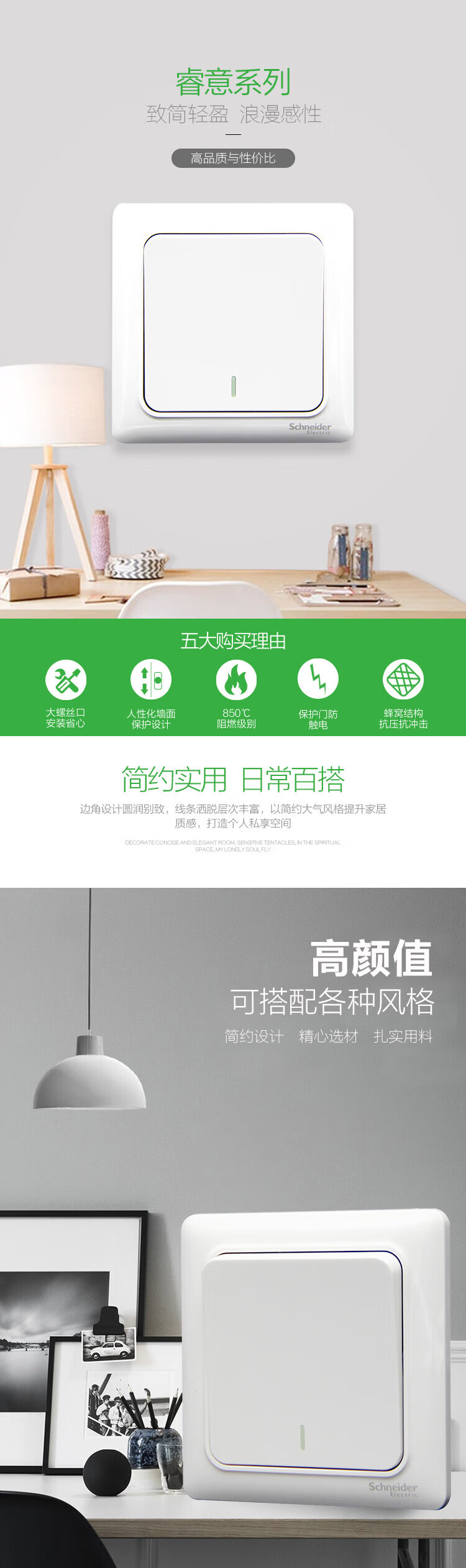 施耐德电气 一开单控开关 86型单开开关插座面板单联开关面板 睿意系列 白色