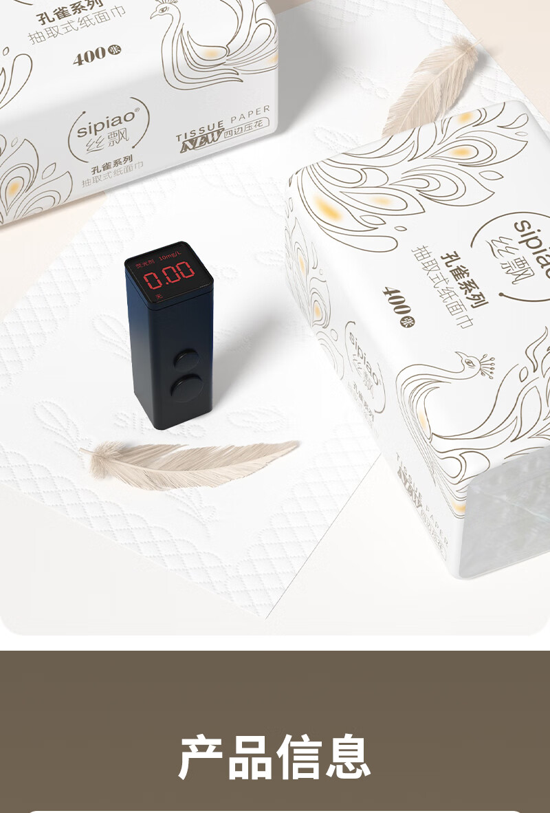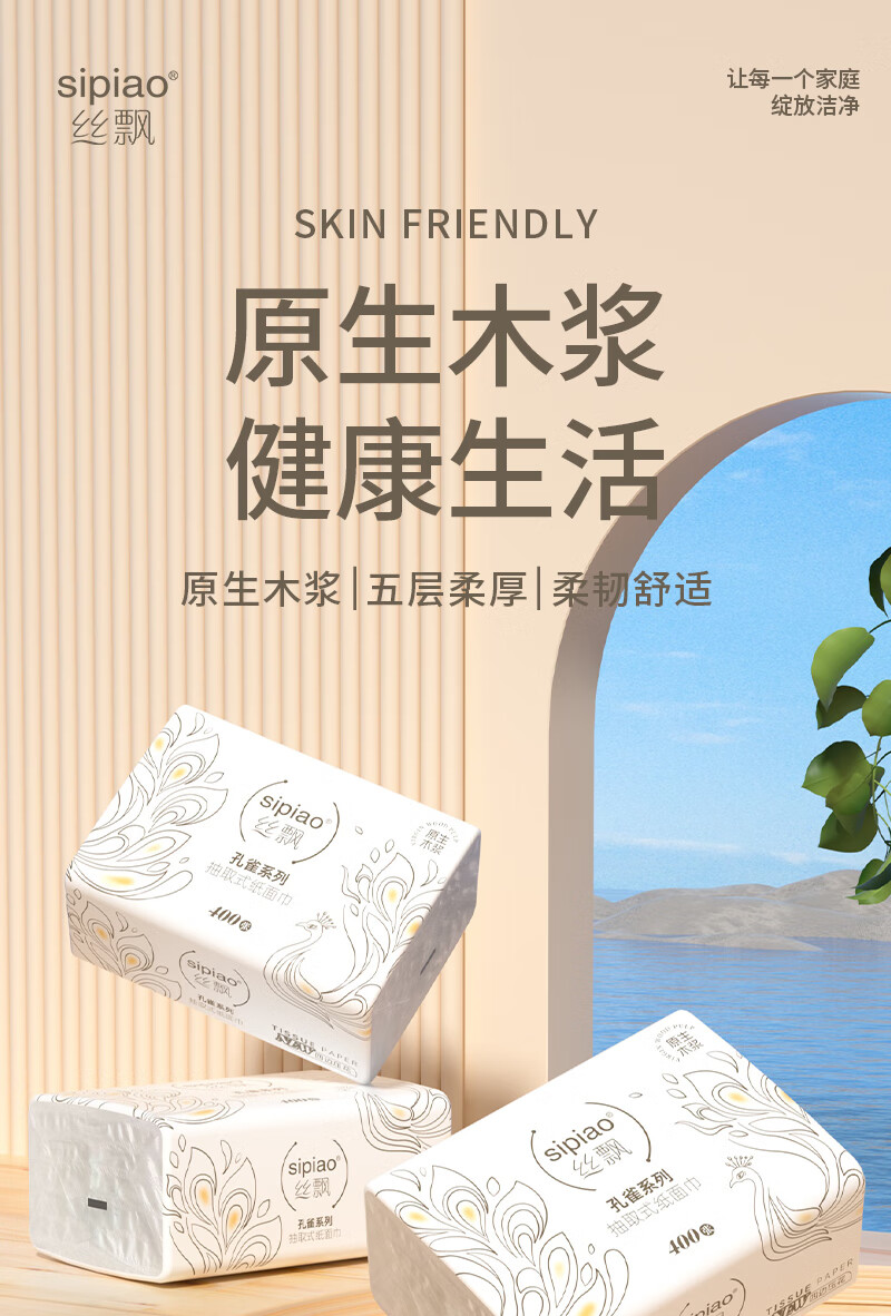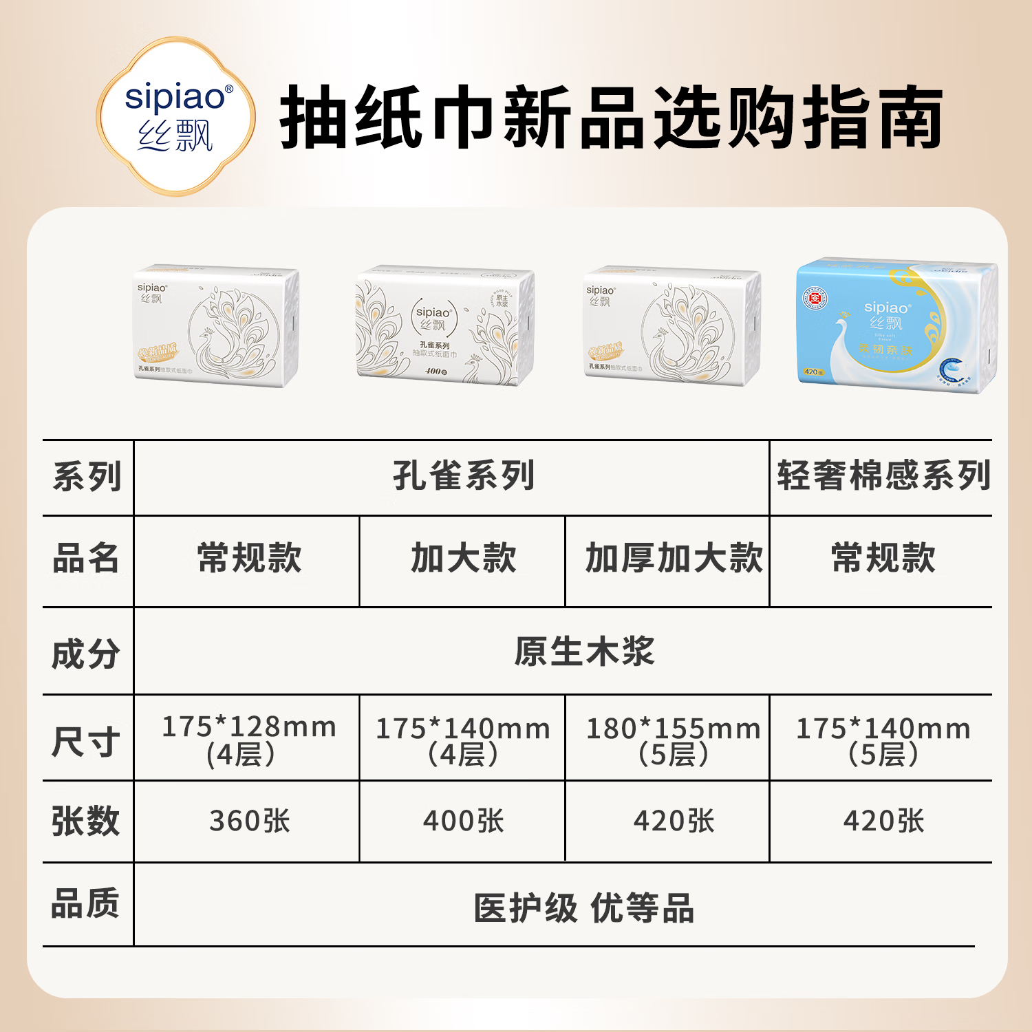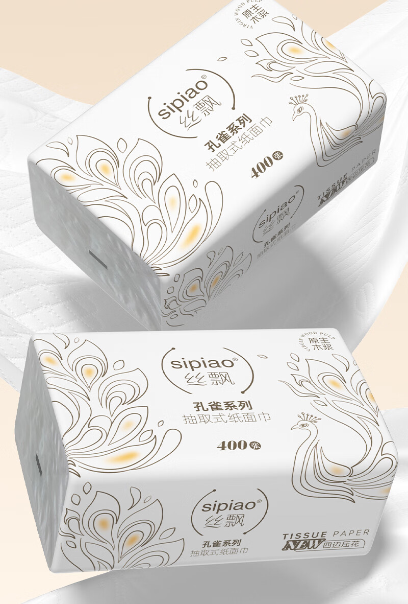 丝飘(SIPIAO)孔雀系列抽取式面巾4层柔厚400张*20包软抽餐巾纸面巾卫生纸整箱