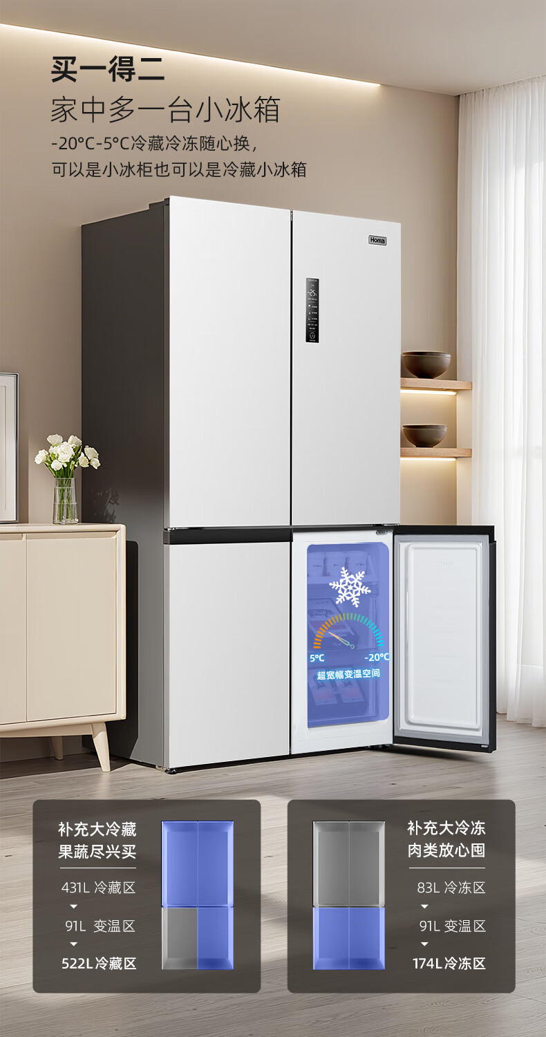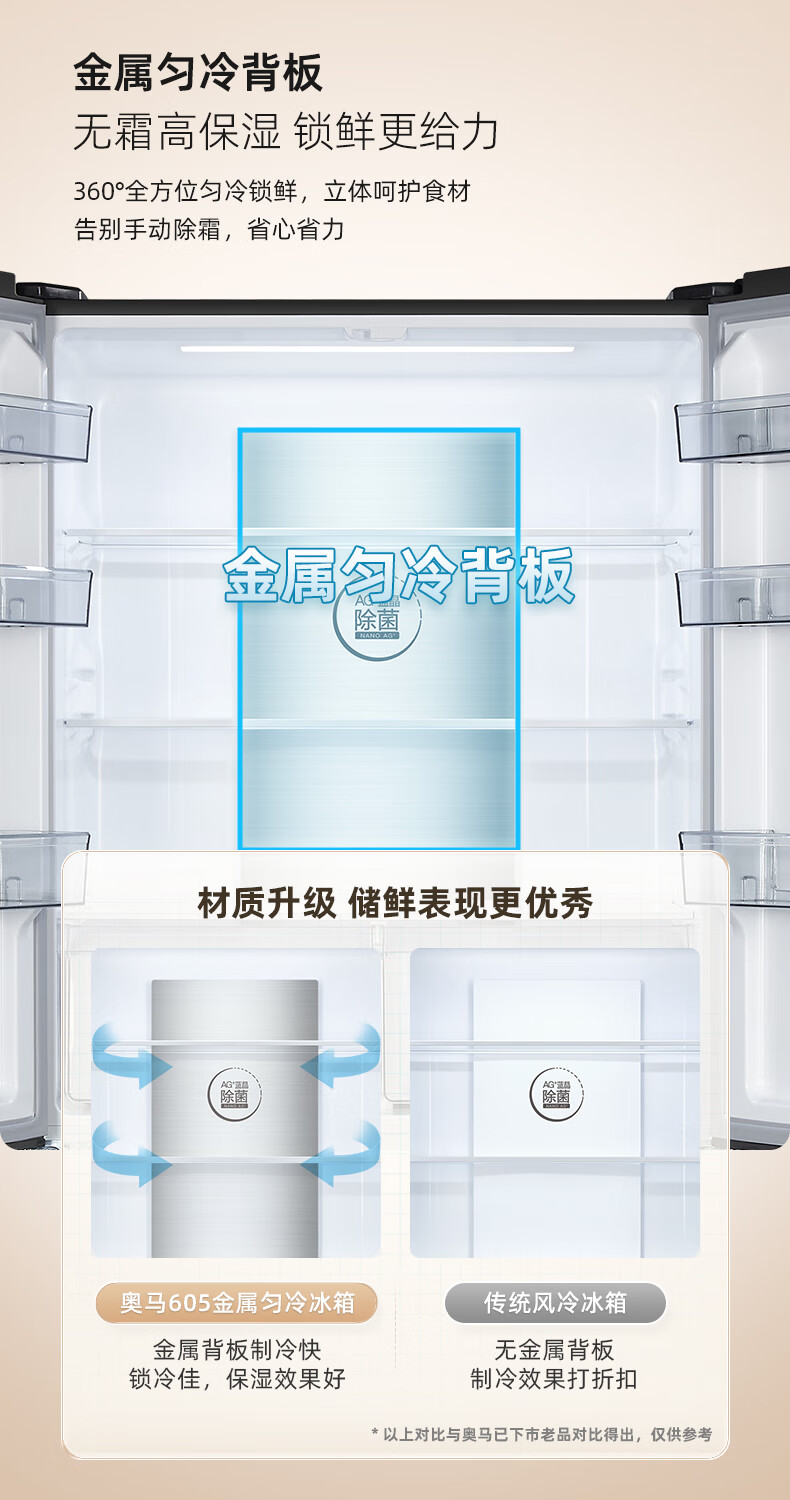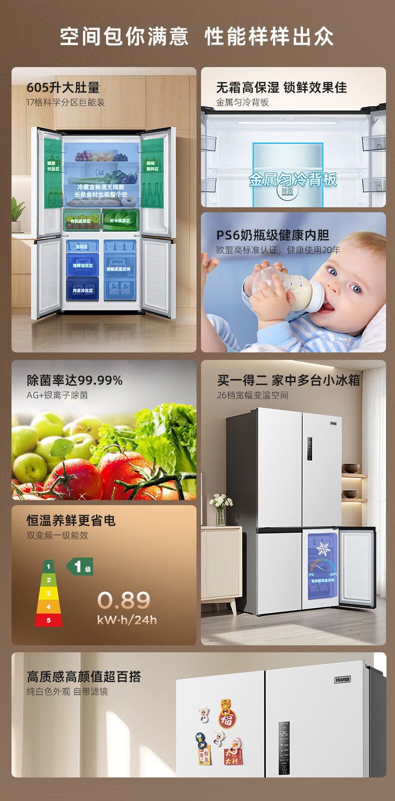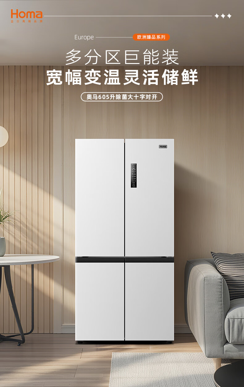 奥马(Homa) 605升超大容量一级能效双变频风冷无霜十字对开门四门双开门家用电冰箱 99.99%除菌率 605WDH/B