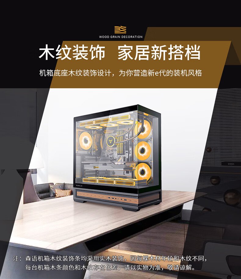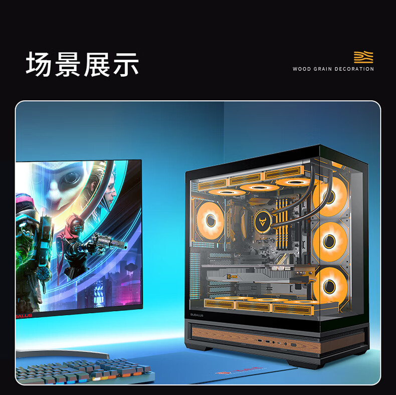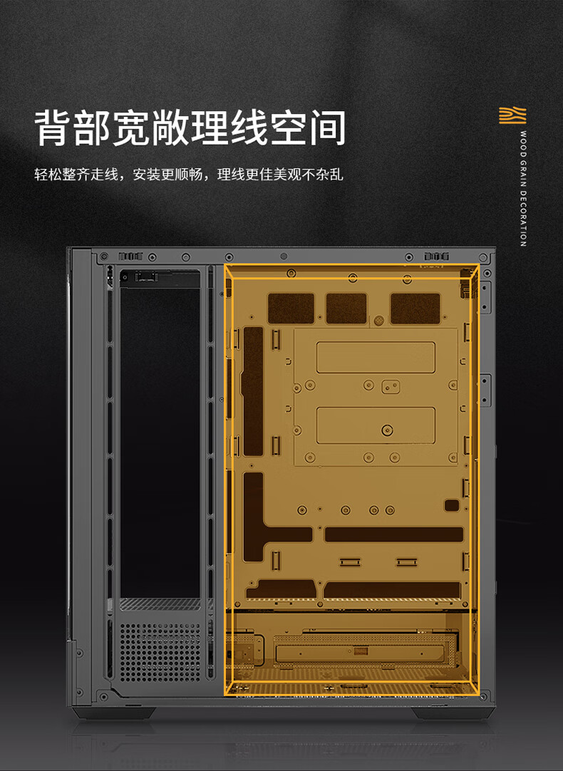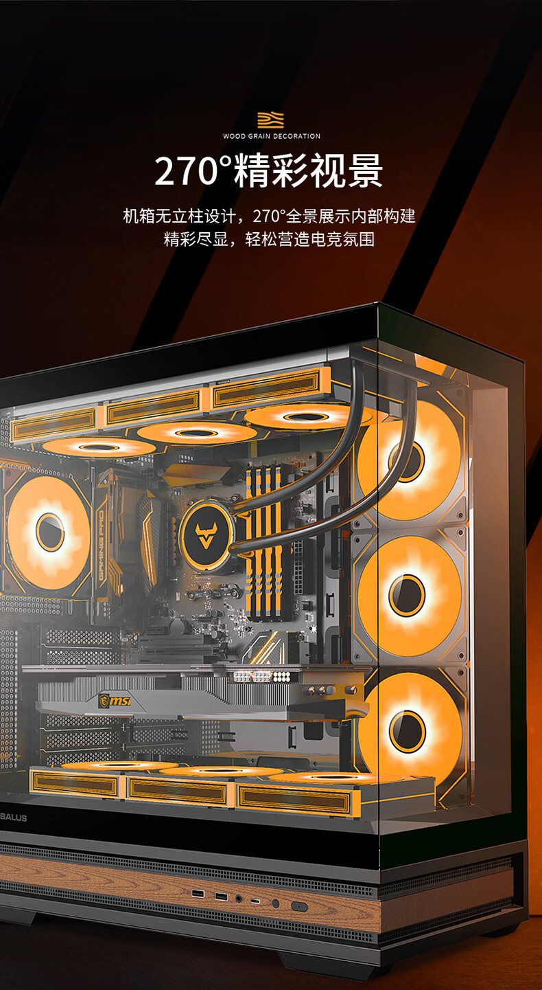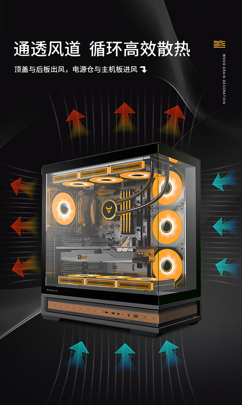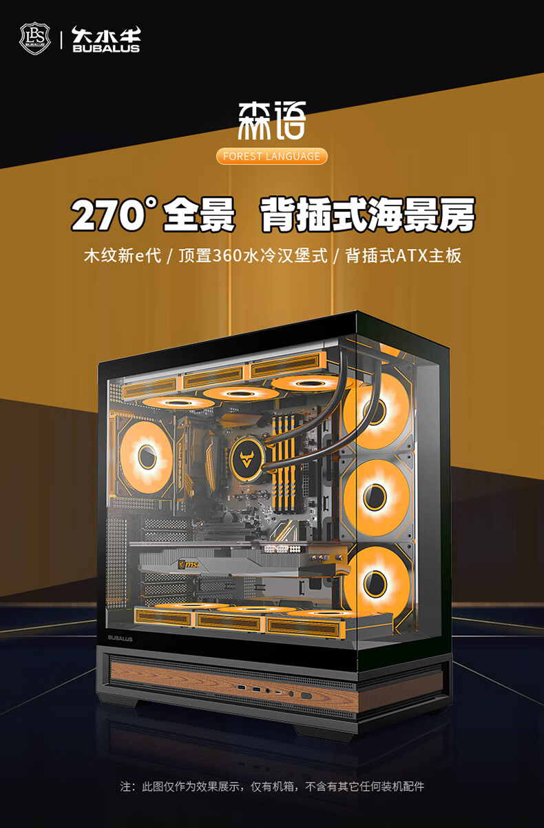 大水牛(BUBALUS)森语 木纹黑色 背插式游戏电脑台式主机箱/360水冷排夹汉堡/Type-C/270°海景房/ATX/免工具快拆