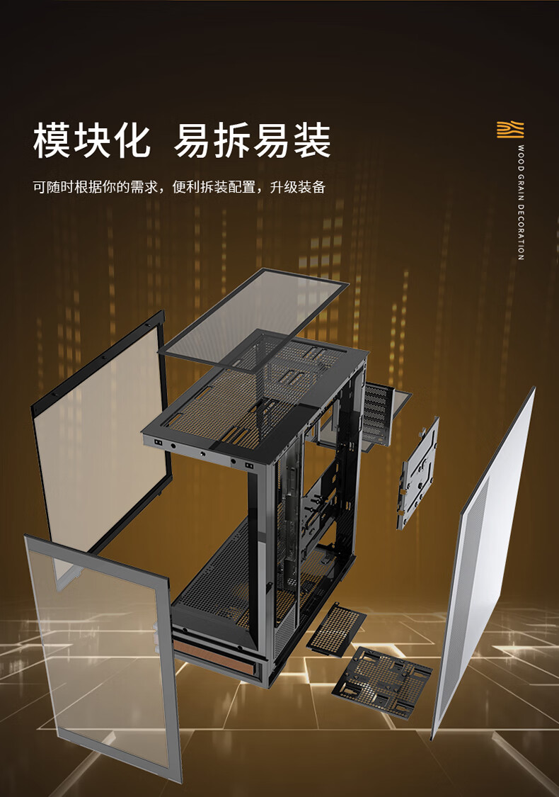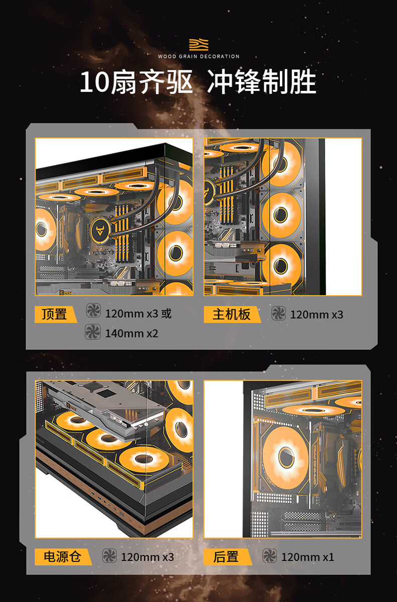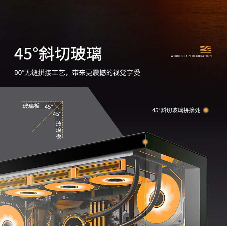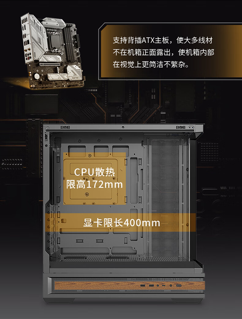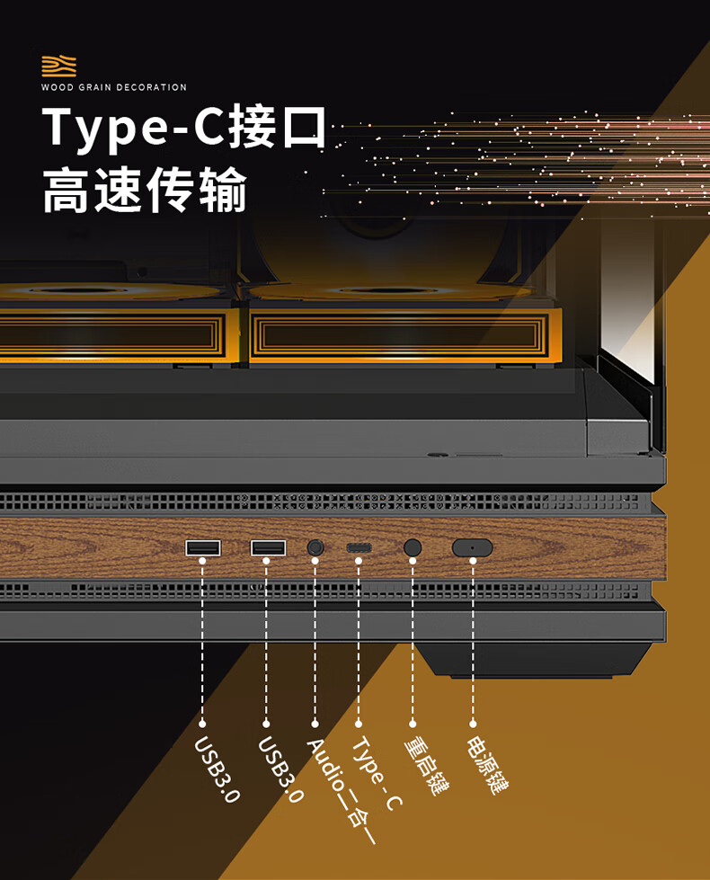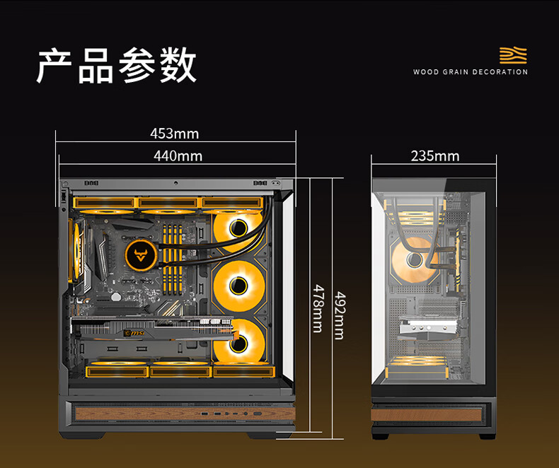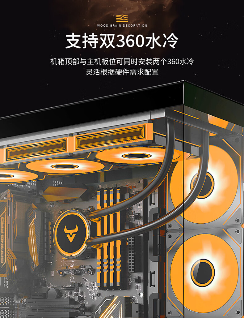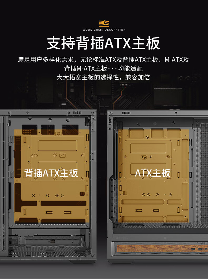 大水牛(BUBALUS)森语 木纹黑色 背插式游戏电脑台式主机箱/360水冷排夹汉堡/Type-C/270°海景房/ATX/免工具快拆