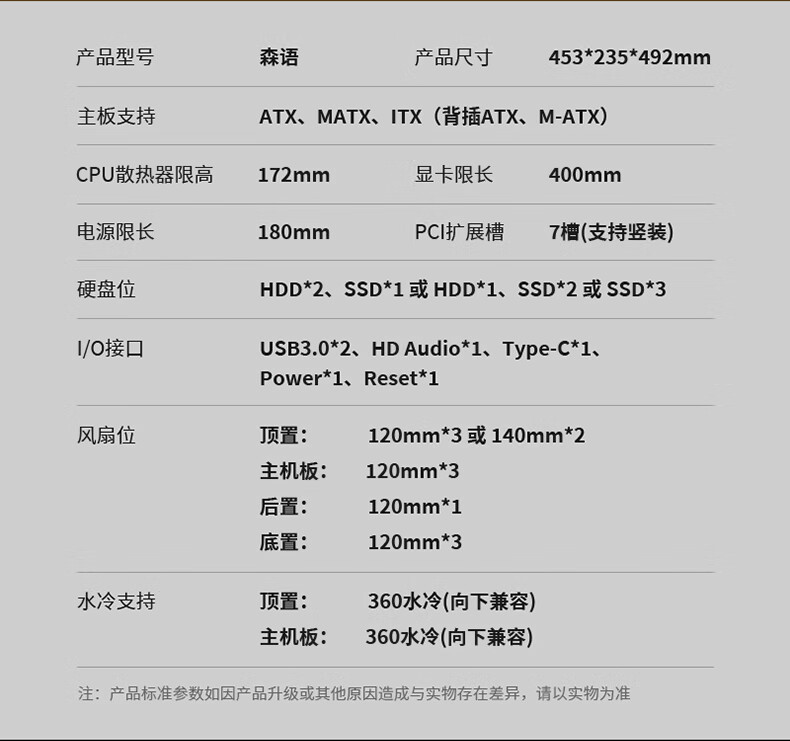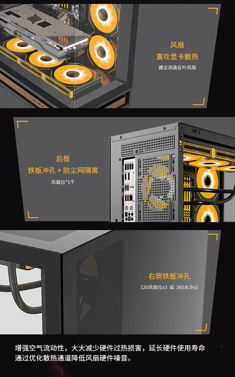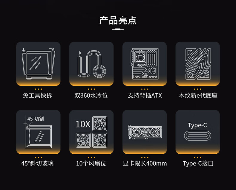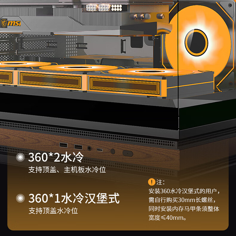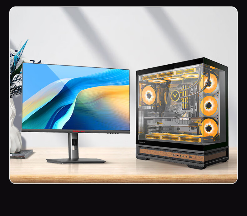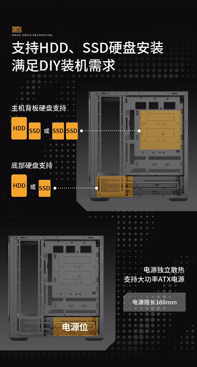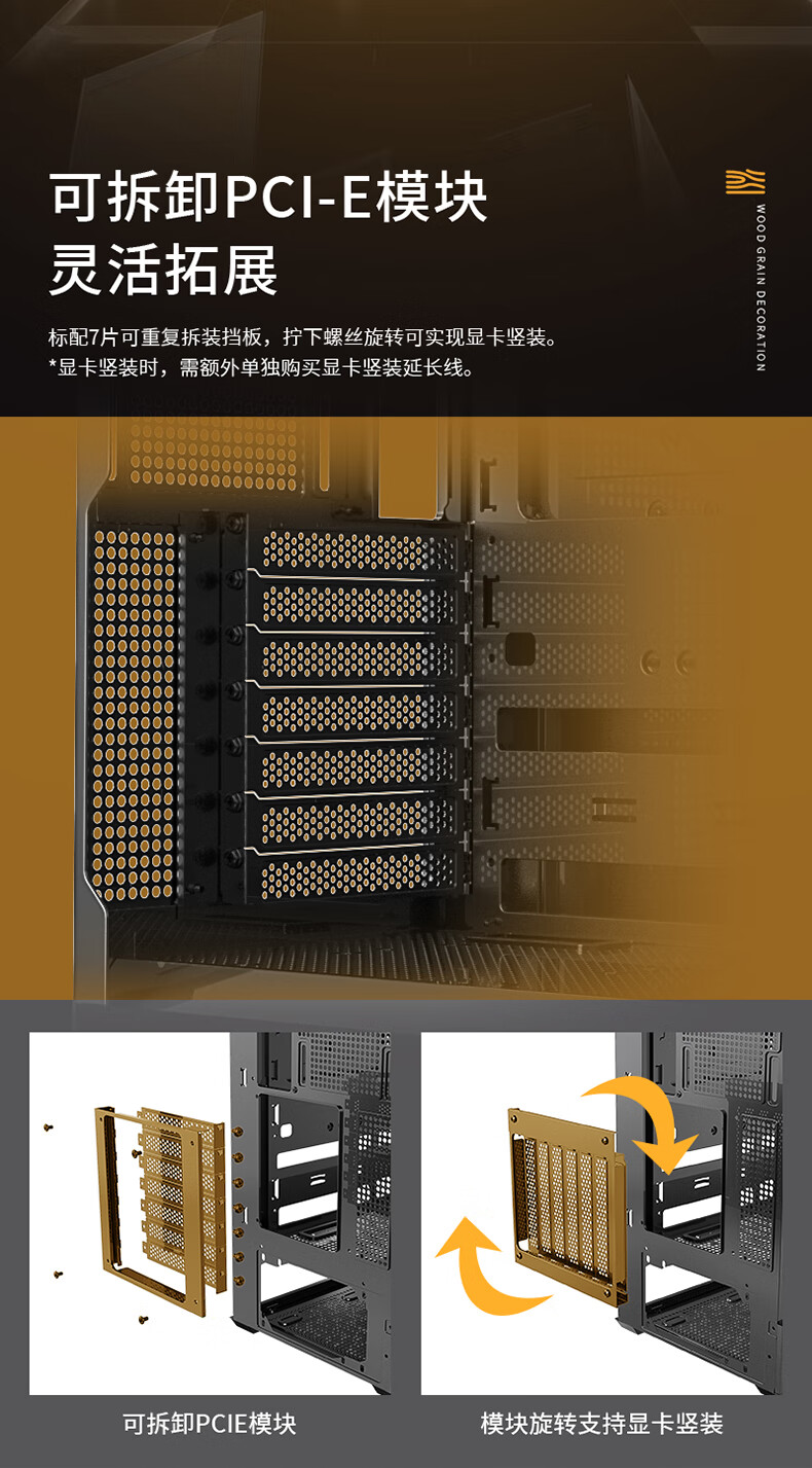 大水牛(BUBALUS)森语 木纹黑色 背插式游戏电脑台式主机箱/360水冷排夹汉堡/Type-C/270°海景房/ATX/免工具快拆