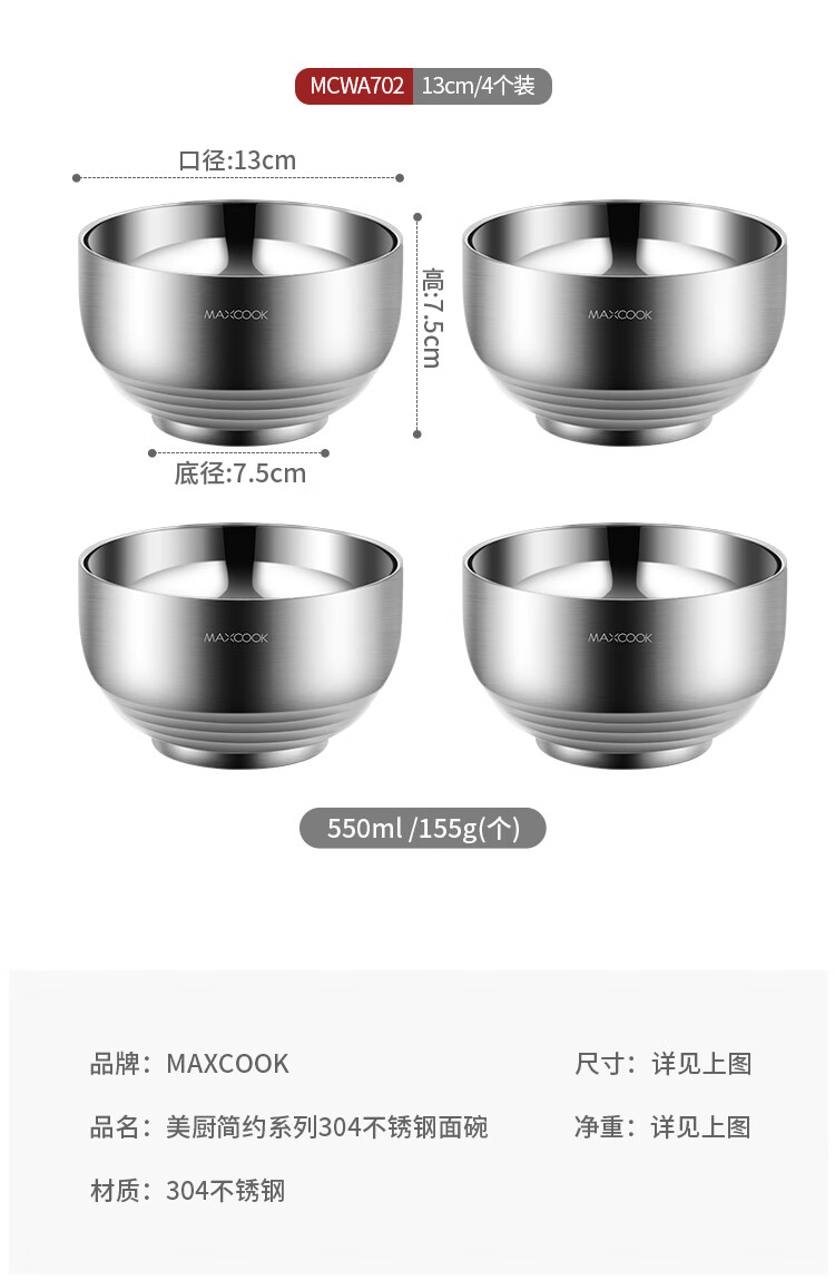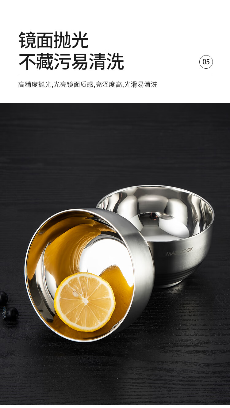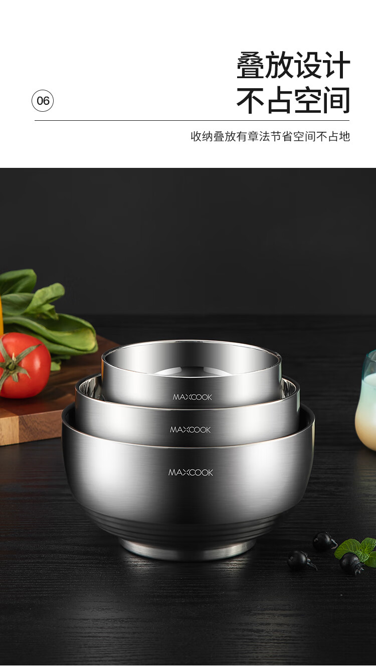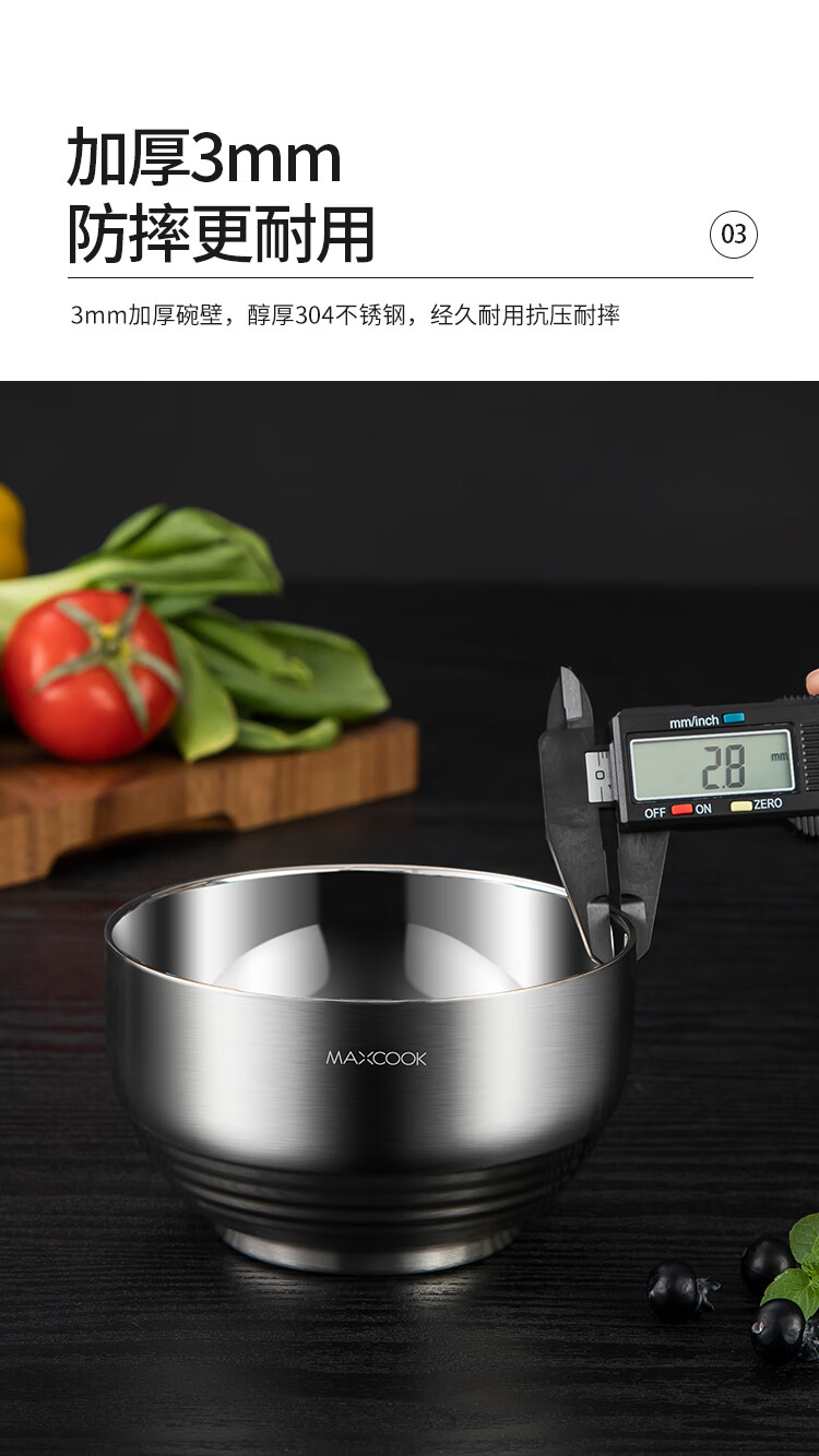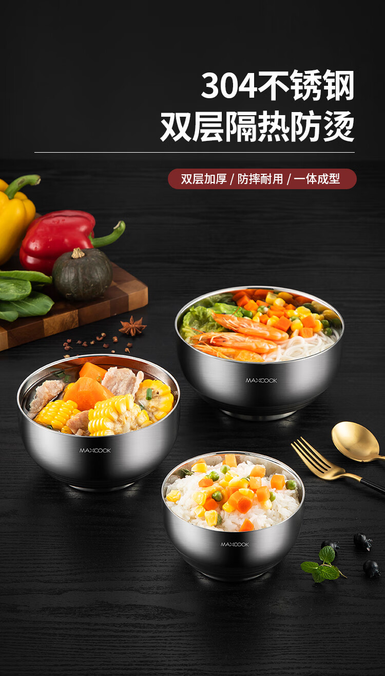 美厨(MAXCOOK)304不锈钢碗 汤碗双层隔热餐具面碗16CM MCWA107
