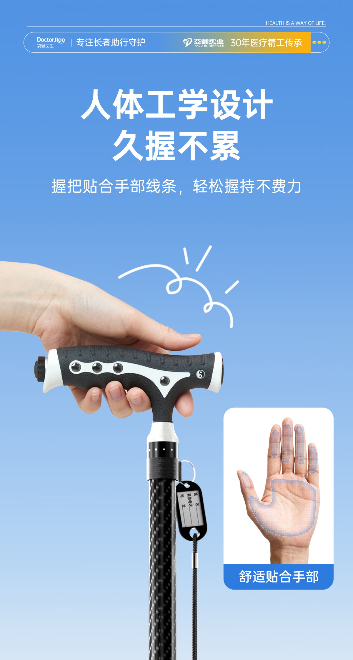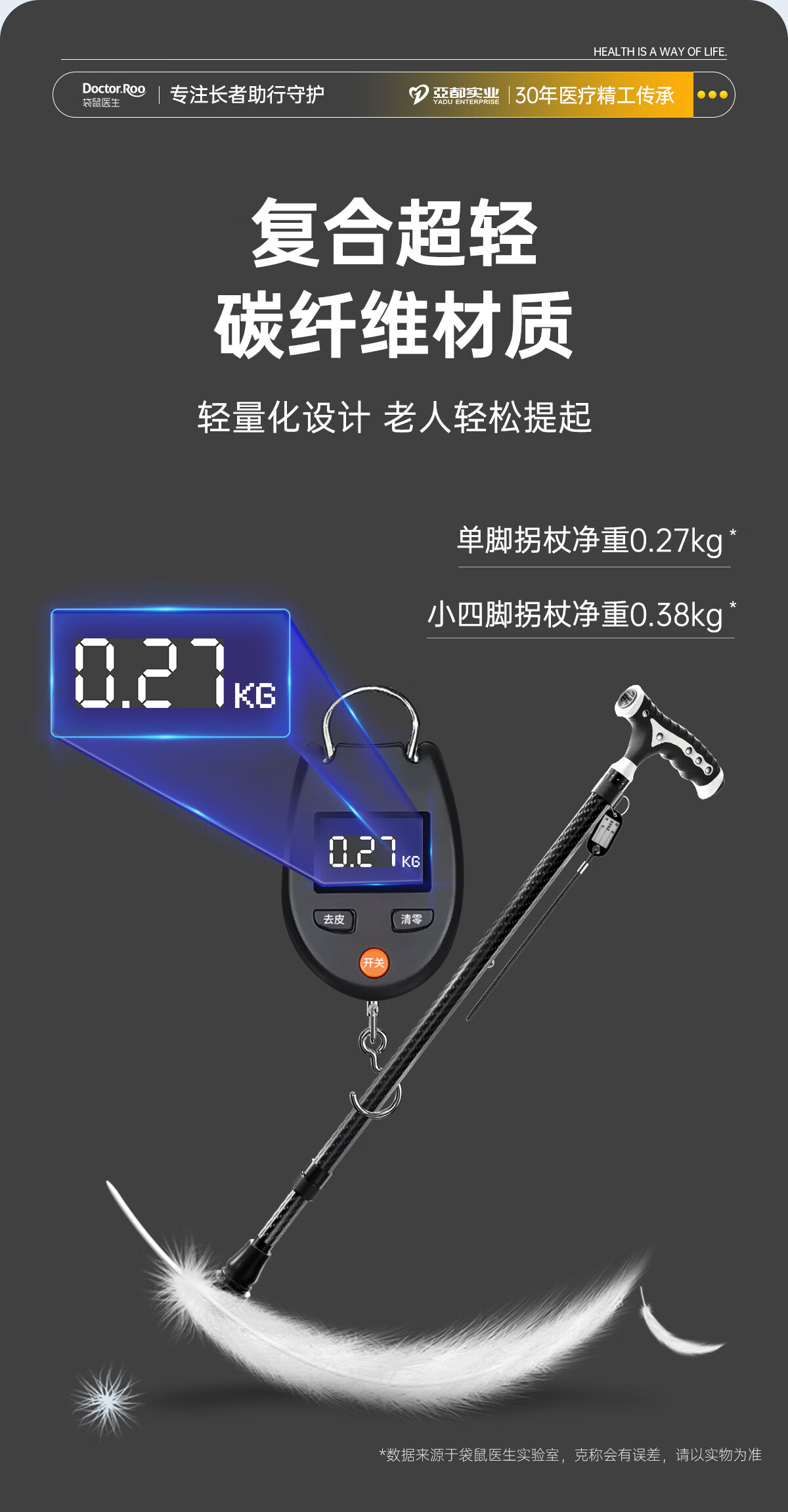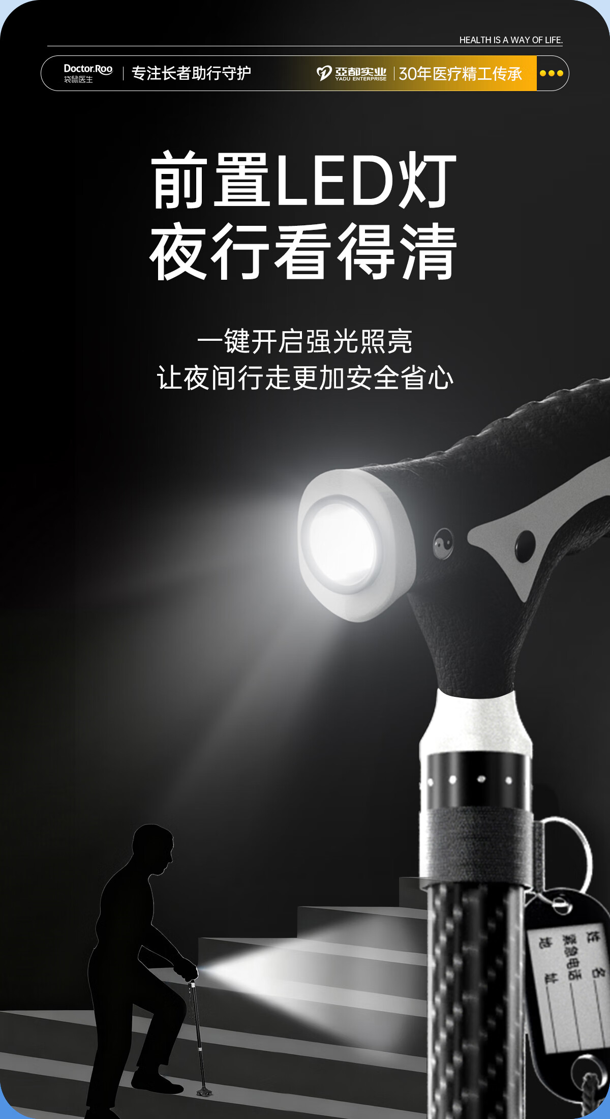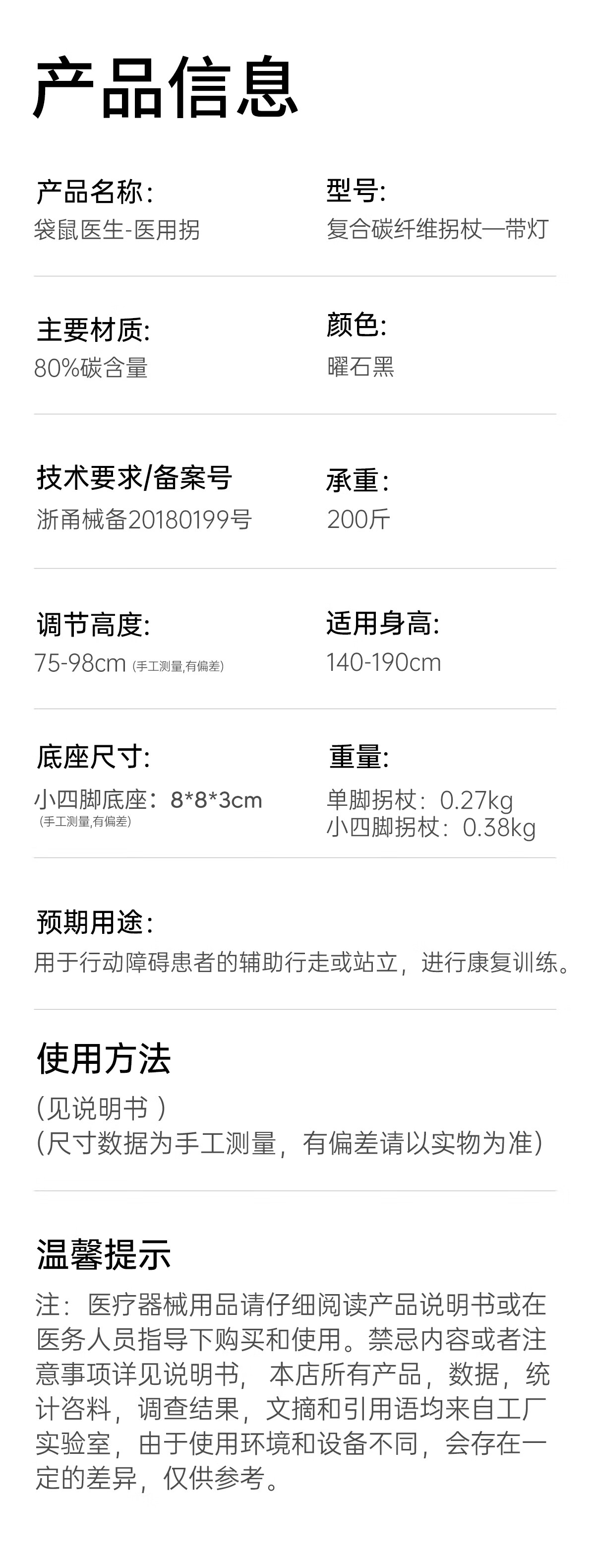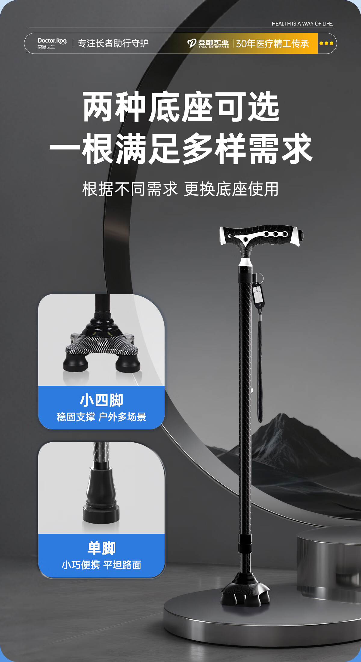 袋鼠医生 拐杖老人专用碳纤维拐棍骨折医用防摔防滑四脚手杖 带灯 双底座