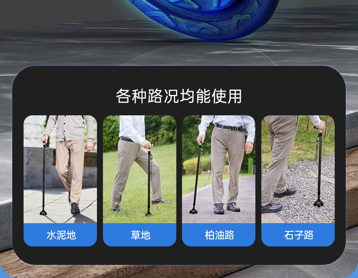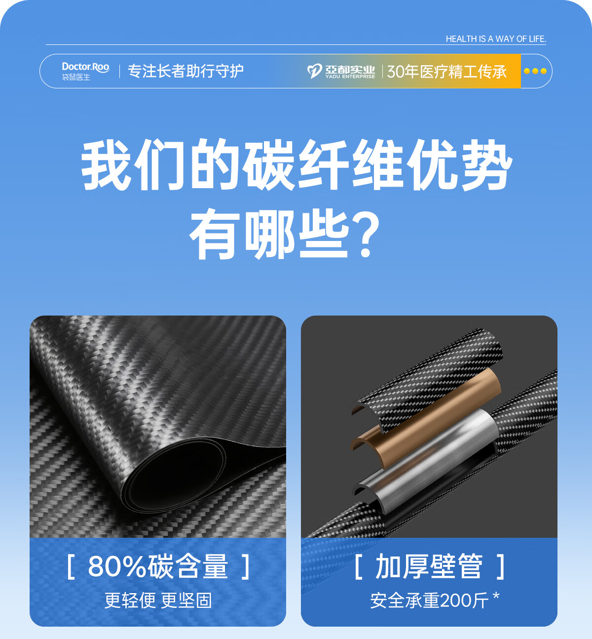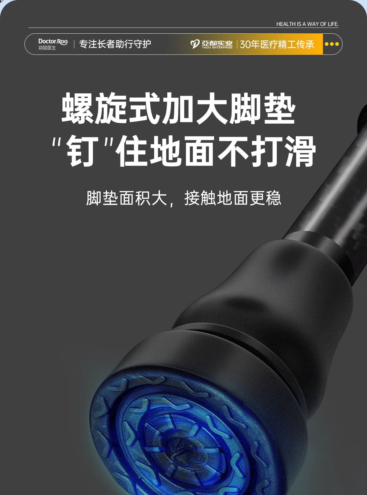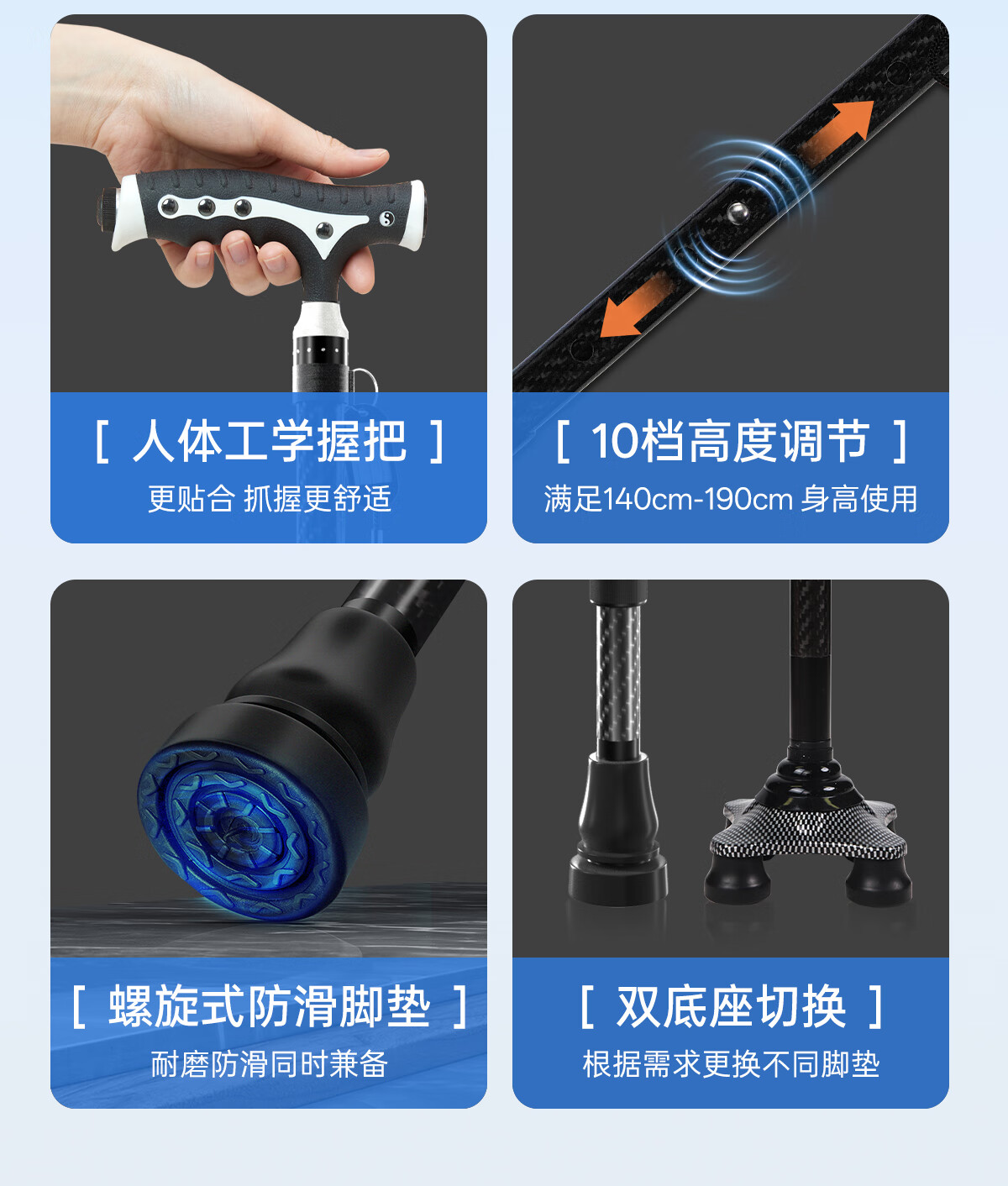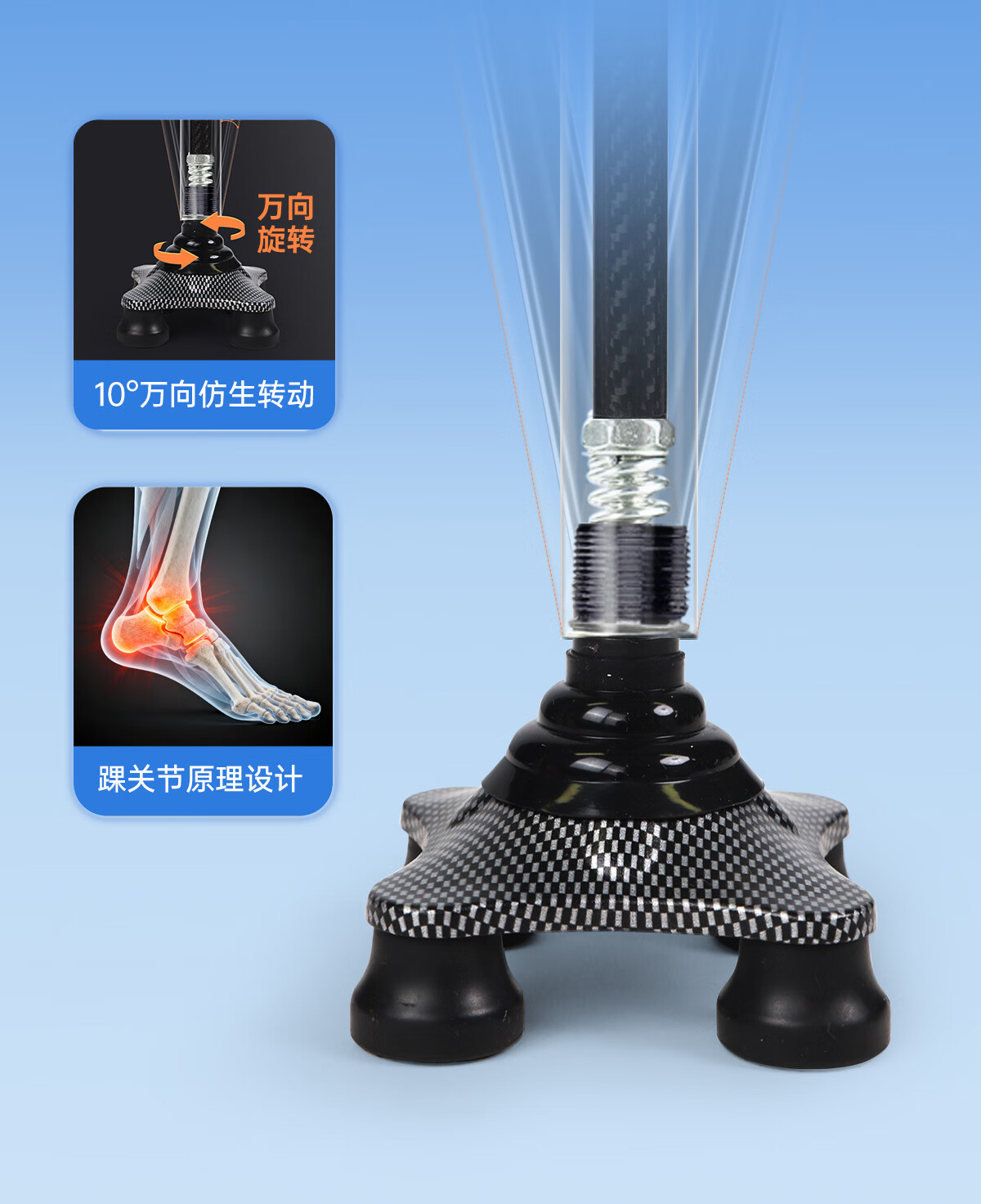 袋鼠医生 拐杖老人专用碳纤维拐棍骨折医用防摔防滑四脚手杖 带灯 双底座