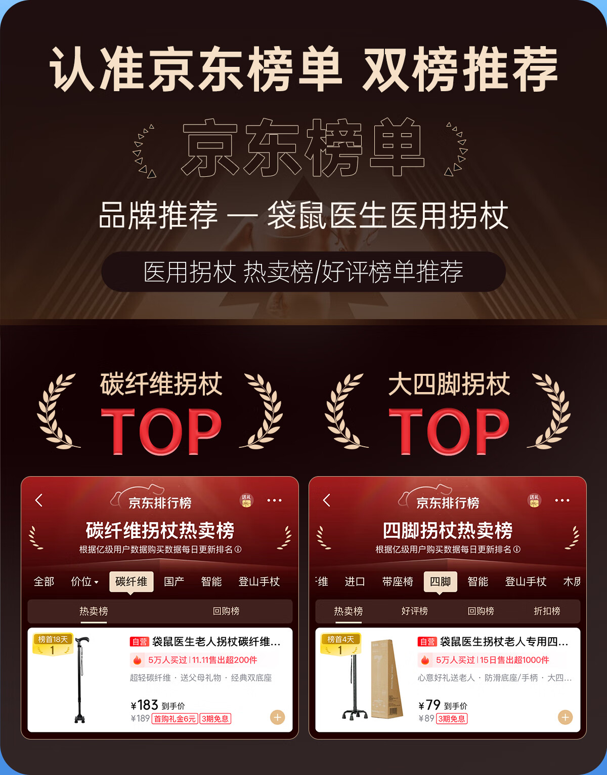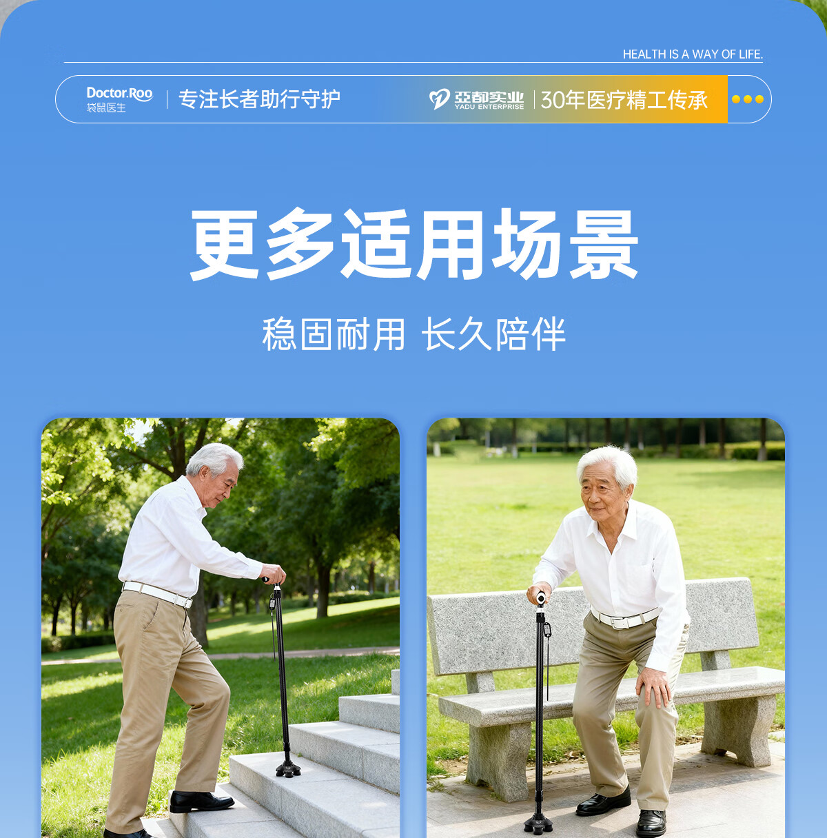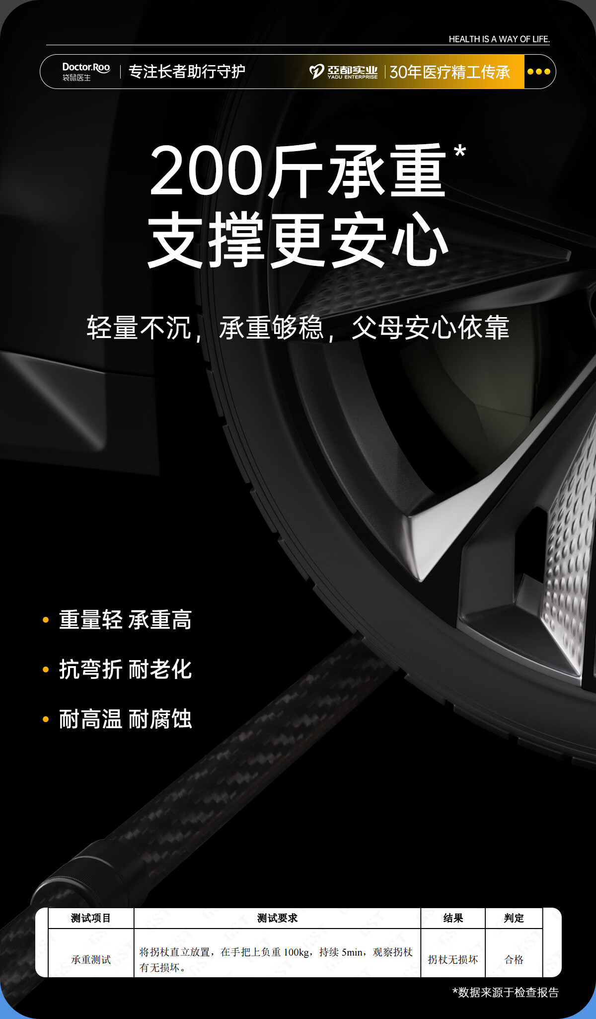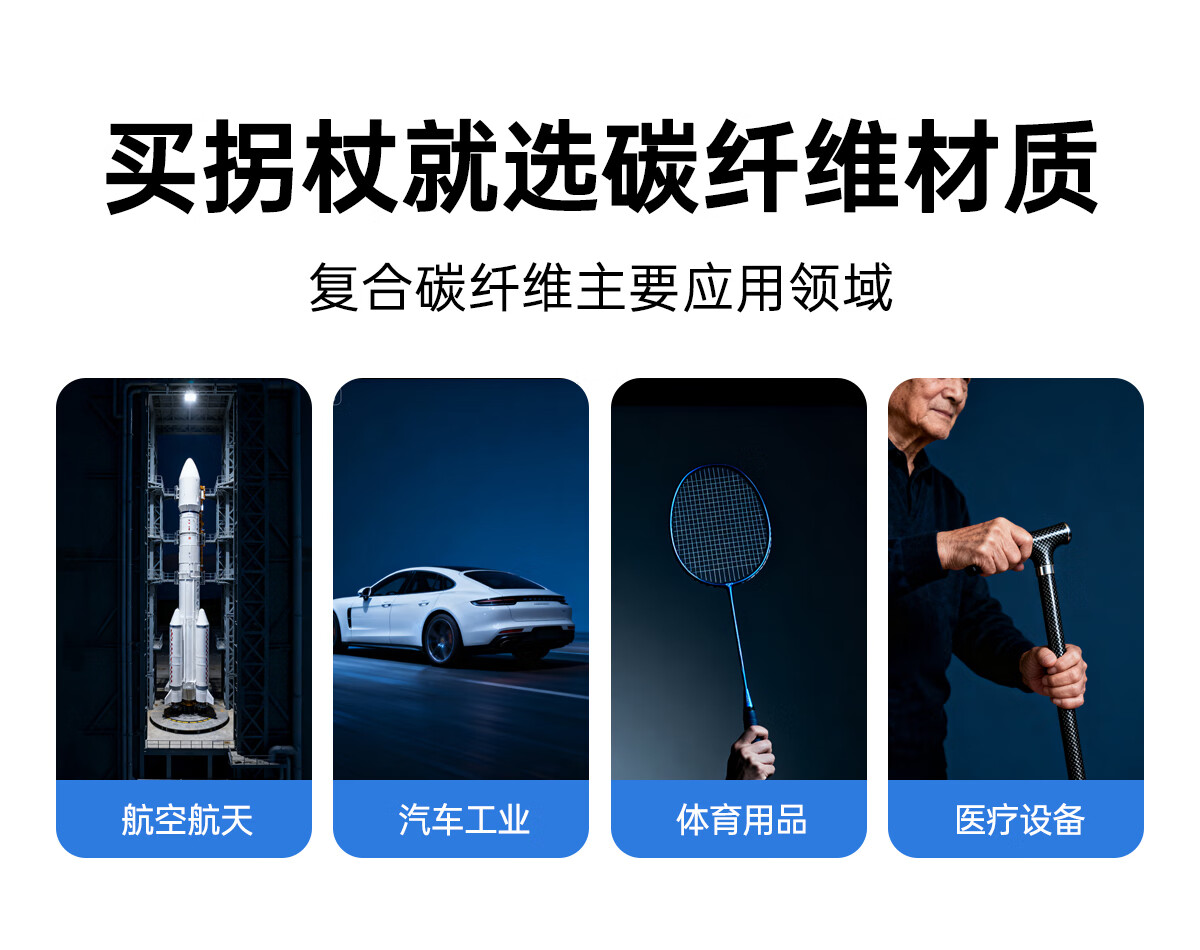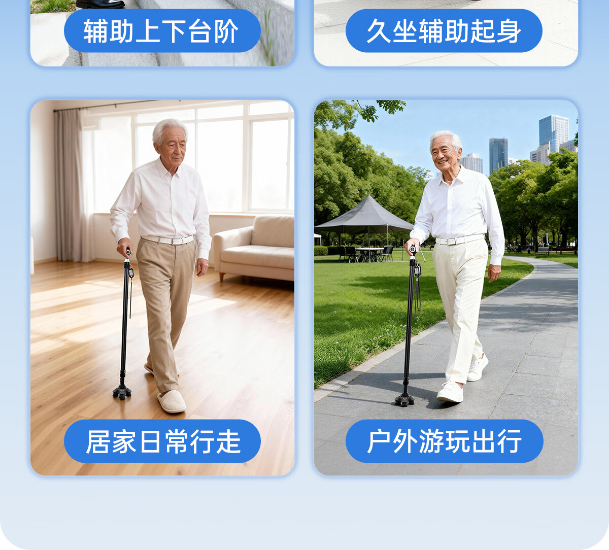 袋鼠医生 拐杖老人专用碳纤维拐棍骨折医用防摔防滑四脚手杖 带灯 双底座