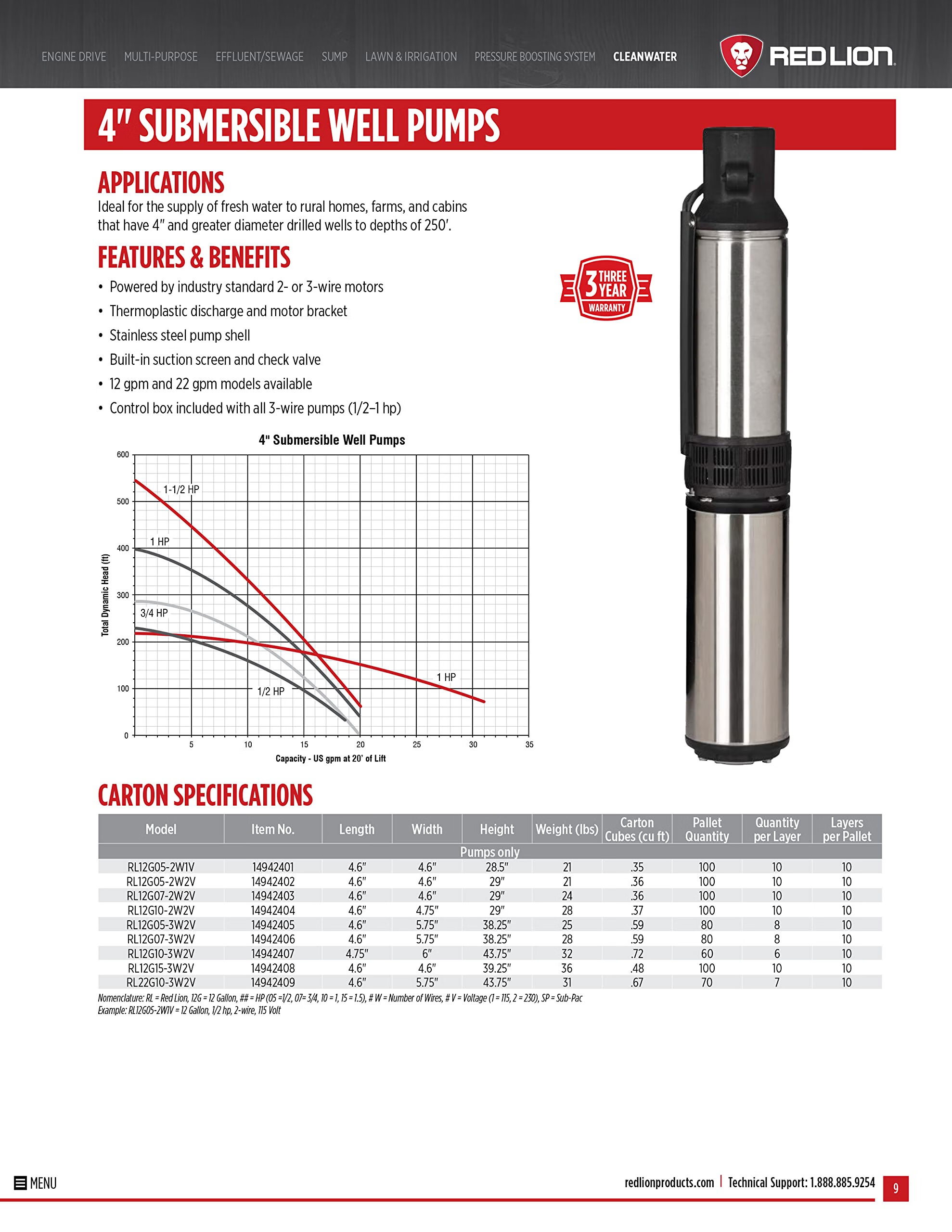 Red Lion RL12G053W2V 1/2HP 12GPM 3Wire 230V 潜水深井泵