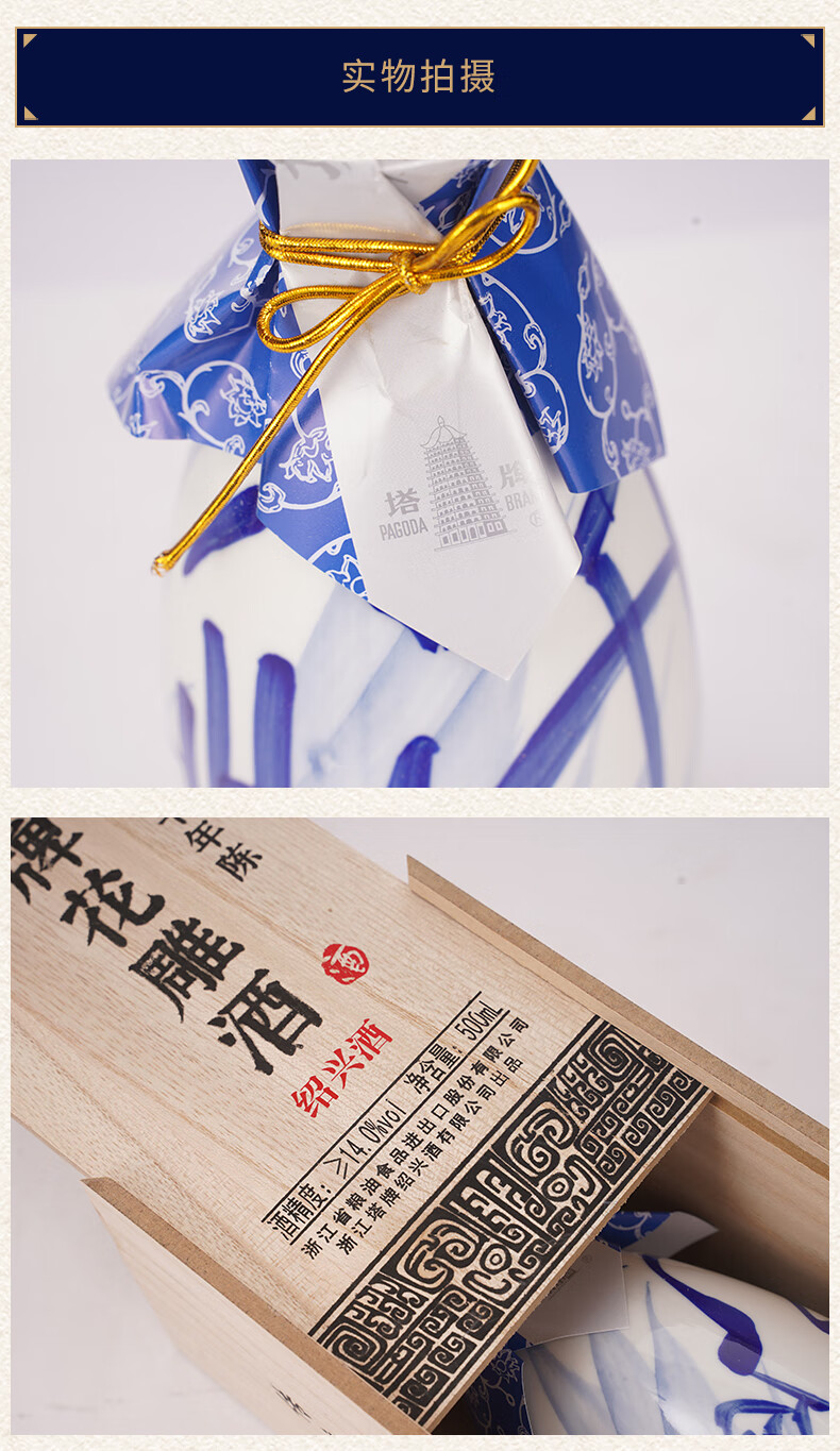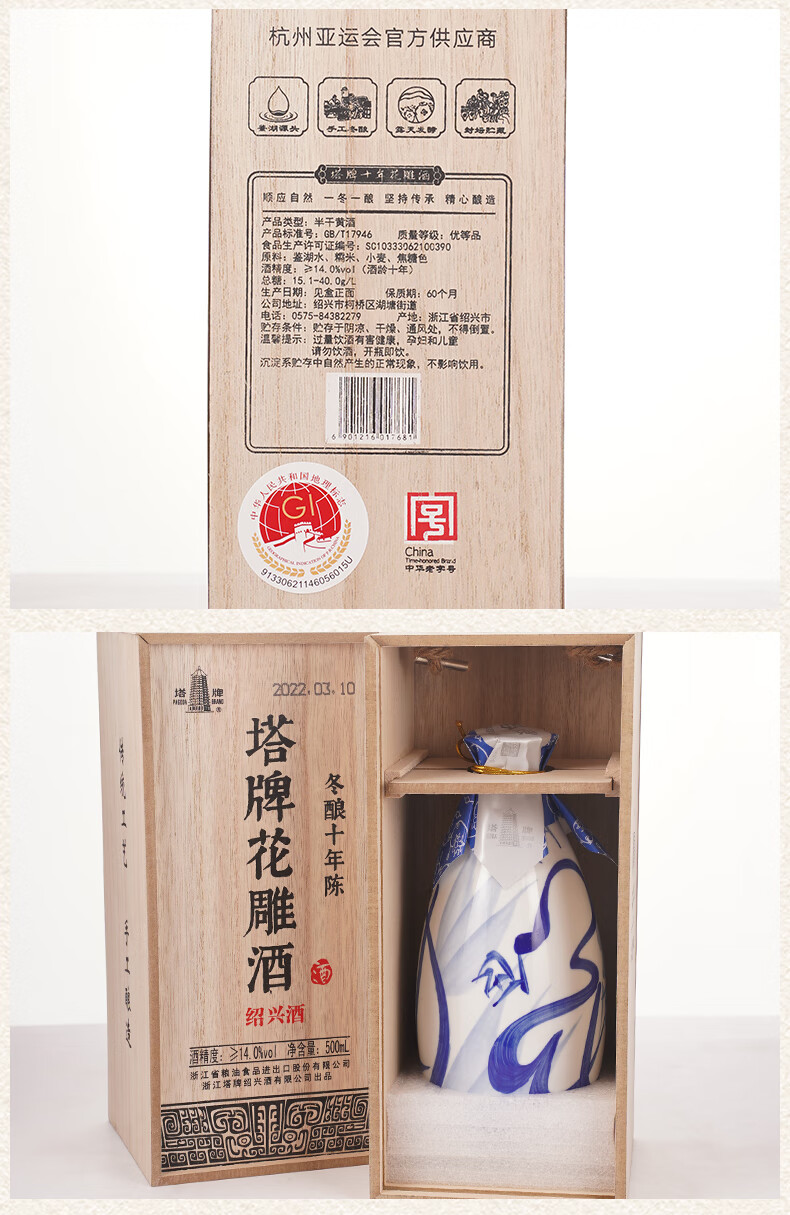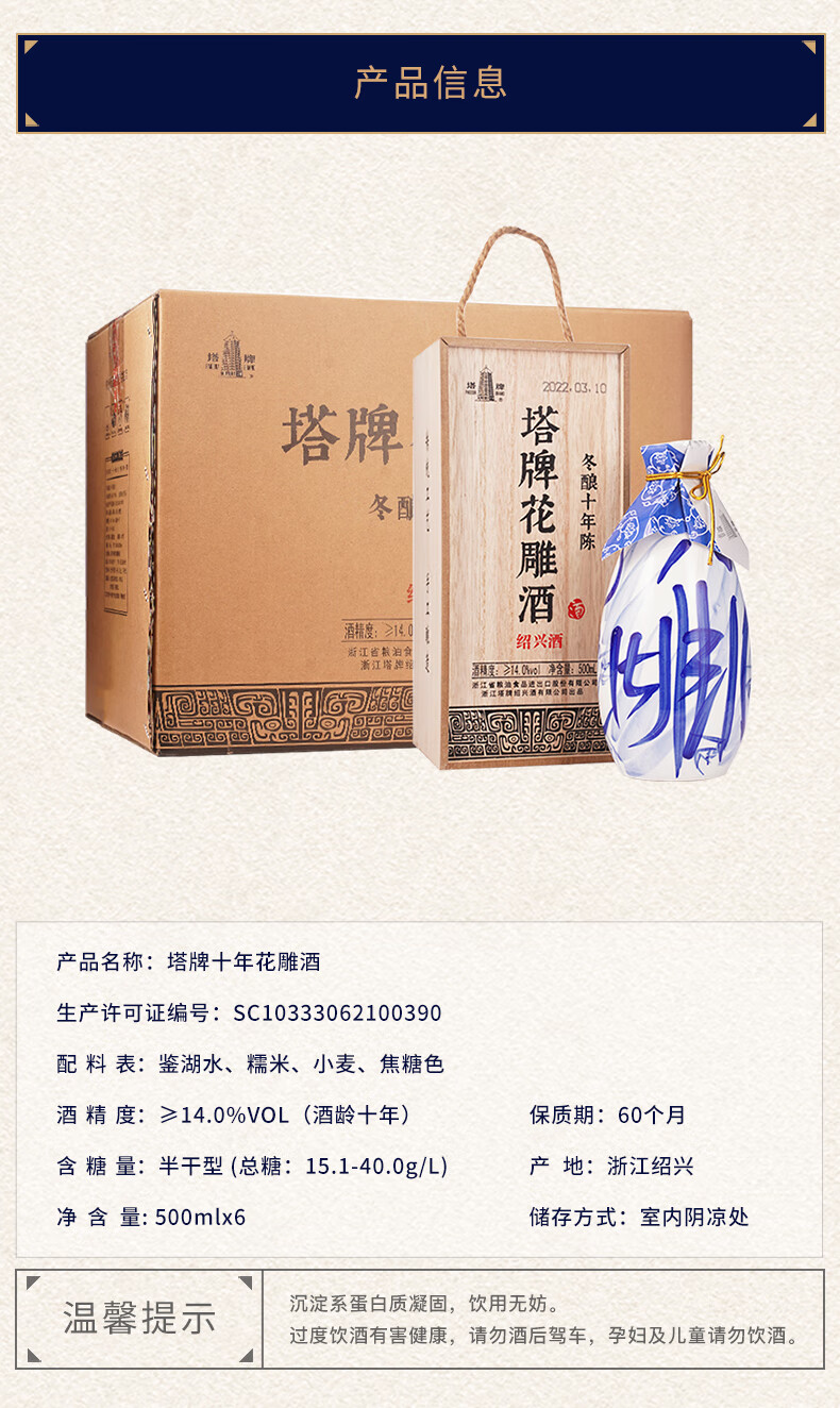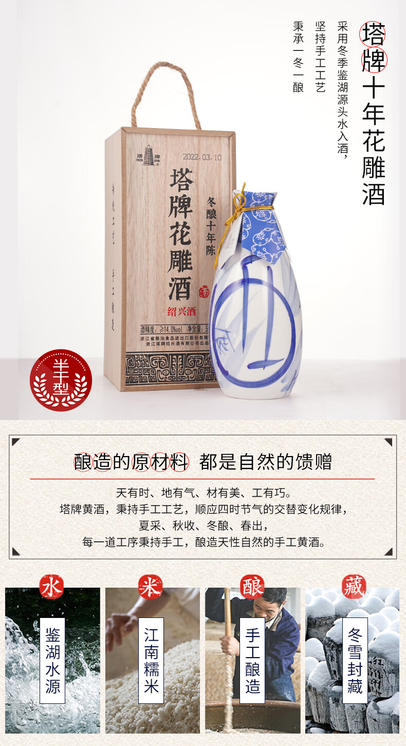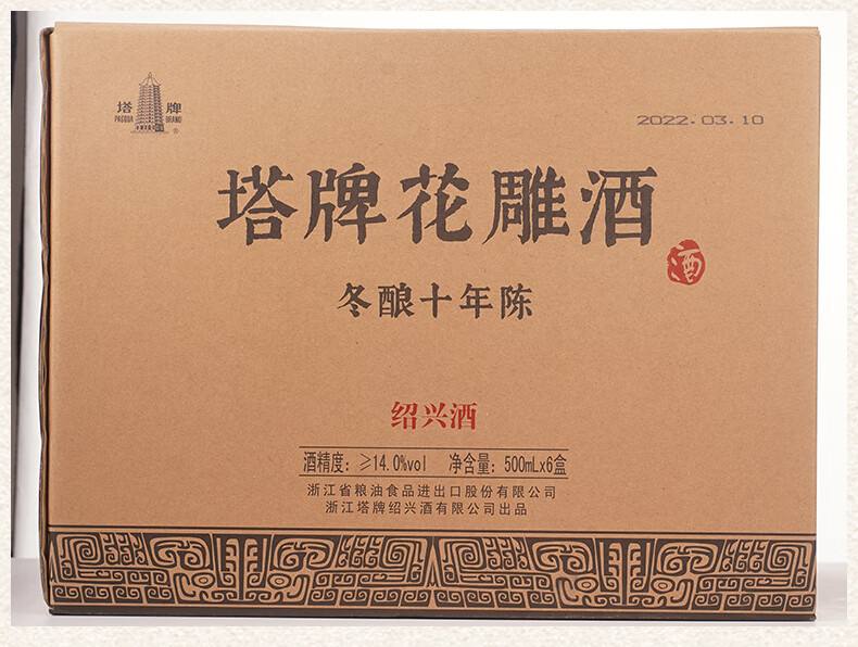 塔牌十年花雕酒 绍兴黄酒 半干型花雕酒 手工冬酿礼盒 500mL 6瓶 整箱装