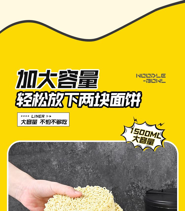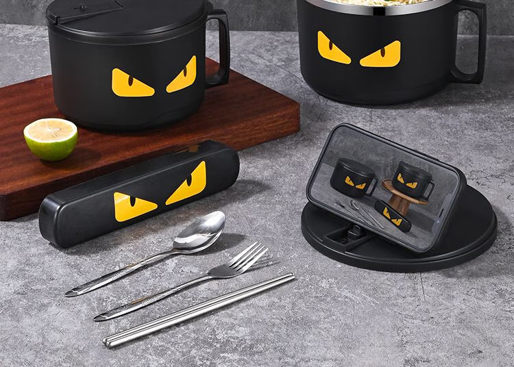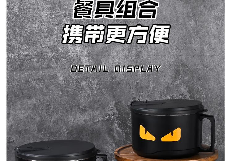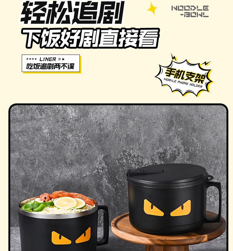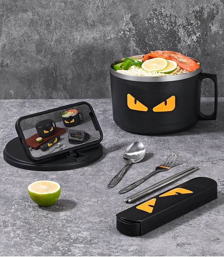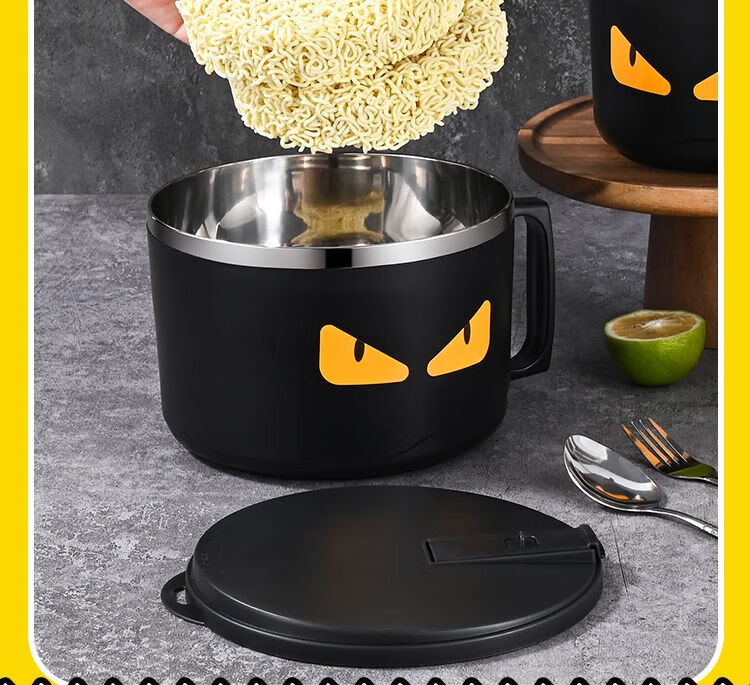 DEATKN德国泡面碗带盖日式304不锈钢ins风可沥水宿舍面碗大容量学生饭盒 全黑-加大号304小恶魔1500ml 泡面碗【配沥水防尘盖】
