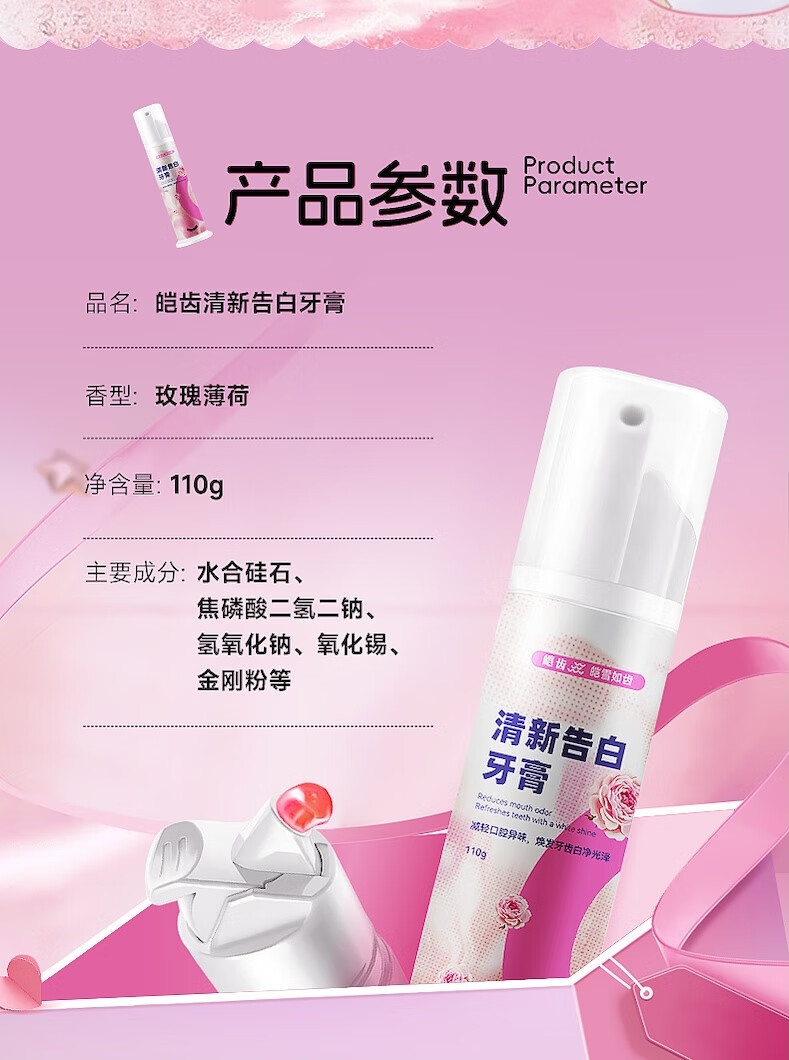 皑齿清新告白牙膏 玫瑰薄荷温和清洁牙齿 含氟呵护牙釉质按压式直立式 益生菌牙膏100g