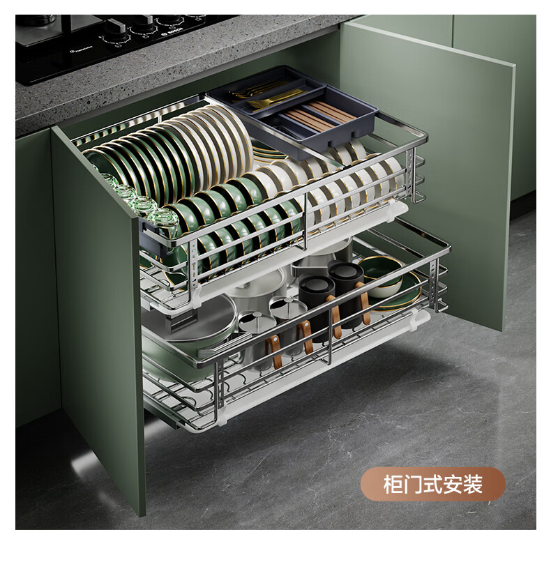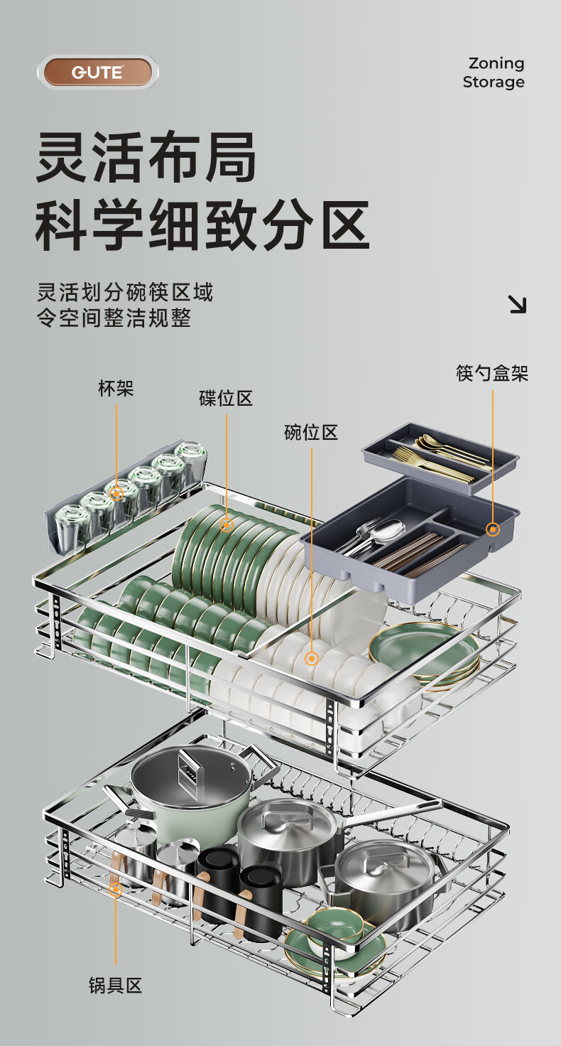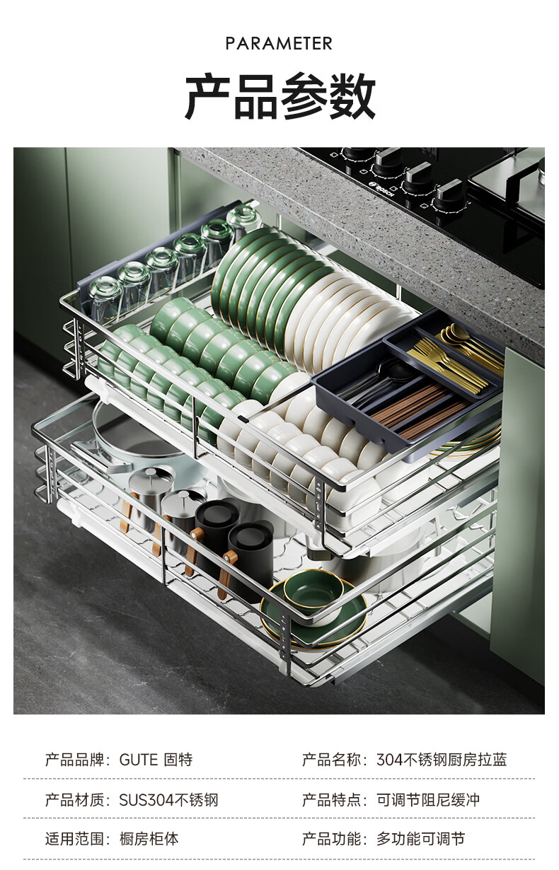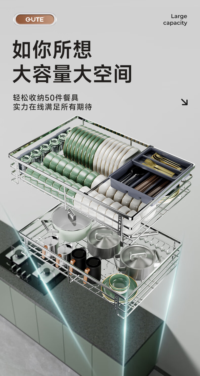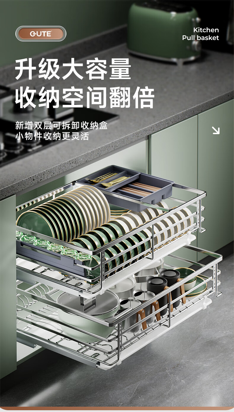固特(GUTE)拉篮厨房橱柜抽屉式不锈钢厨房拉篮碗碟碗架碗柜调味拉篮 双层星空灰【600柜】不锈钢