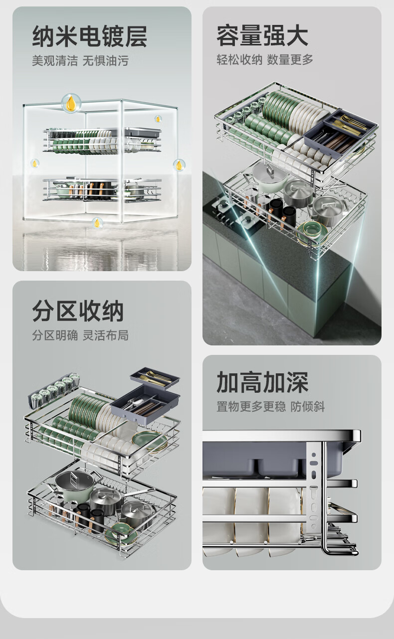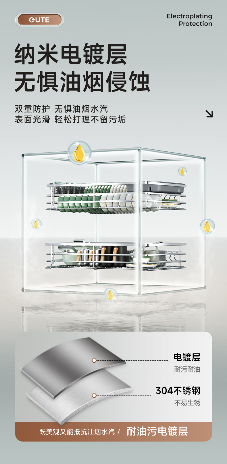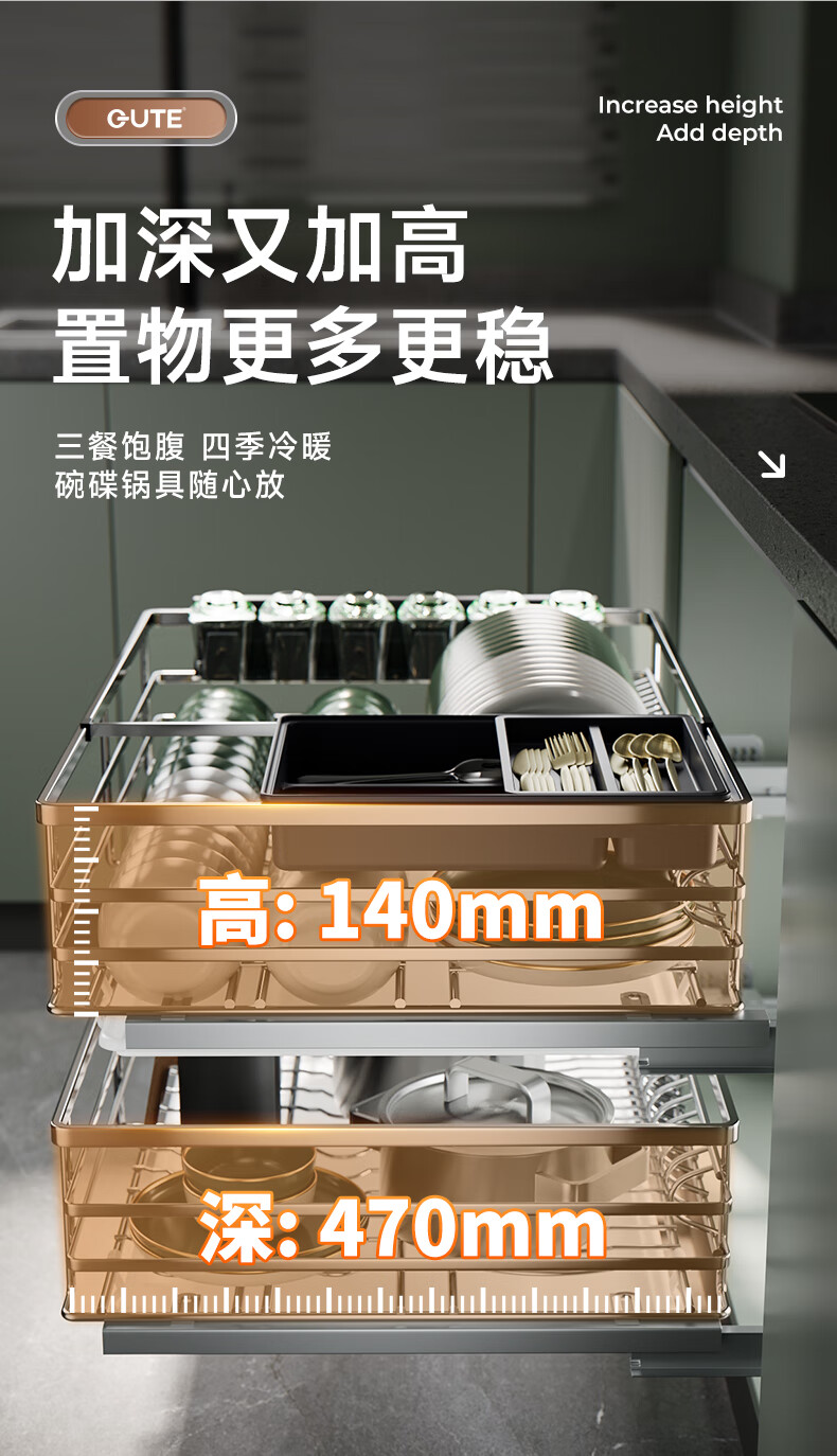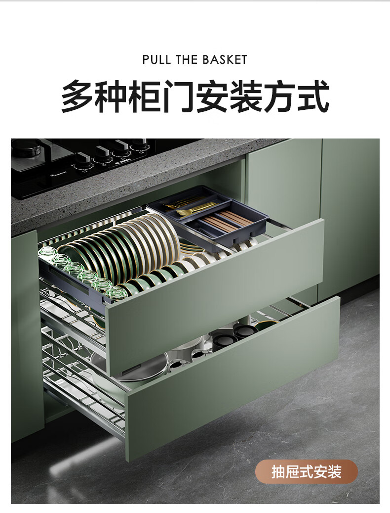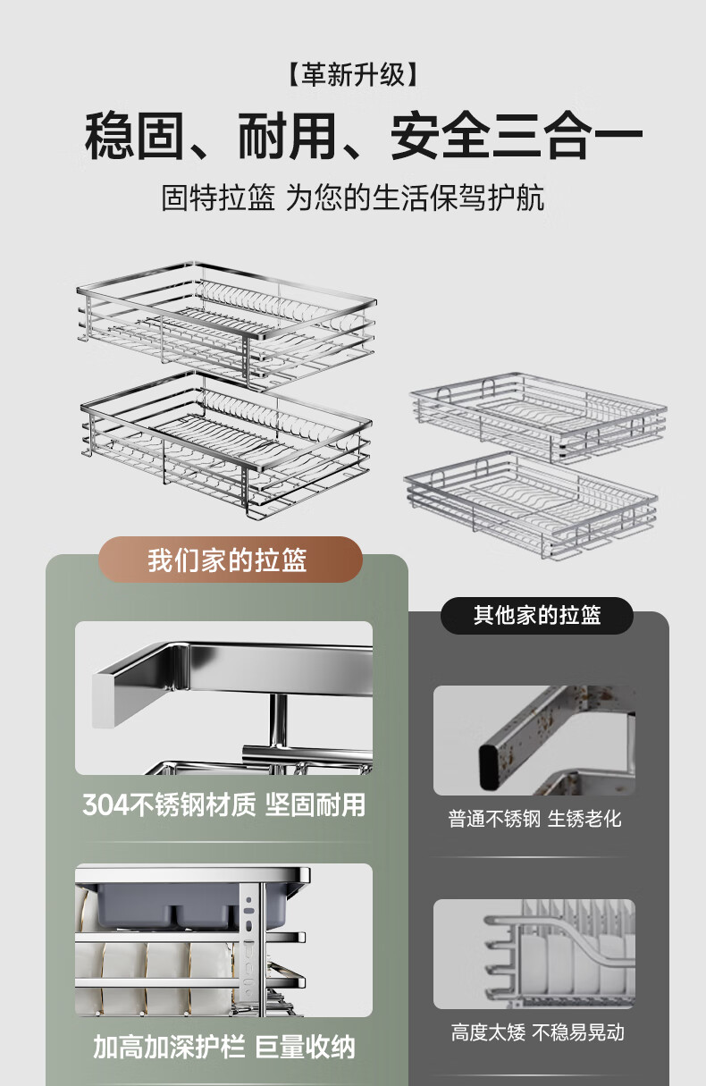 固特(GUTE)拉篮厨房橱柜抽屉式不锈钢厨房拉篮碗碟碗架碗柜调味拉篮 双层星空灰【600柜】不锈钢