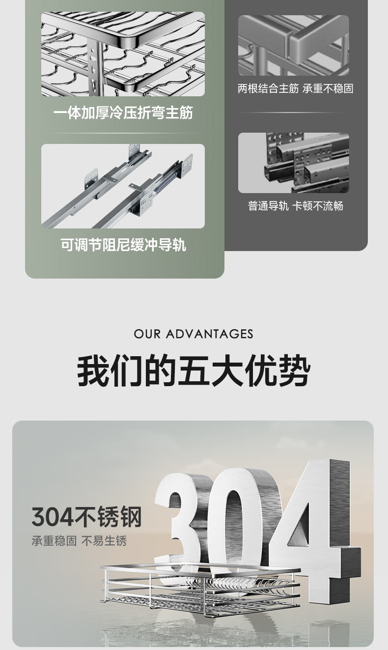 固特304不锈钢大四边厨房碗碟拉篮橱柜抽屉式双层碗篮碗筷收纳置物架 600柜 2层 【304不锈钢】 银色