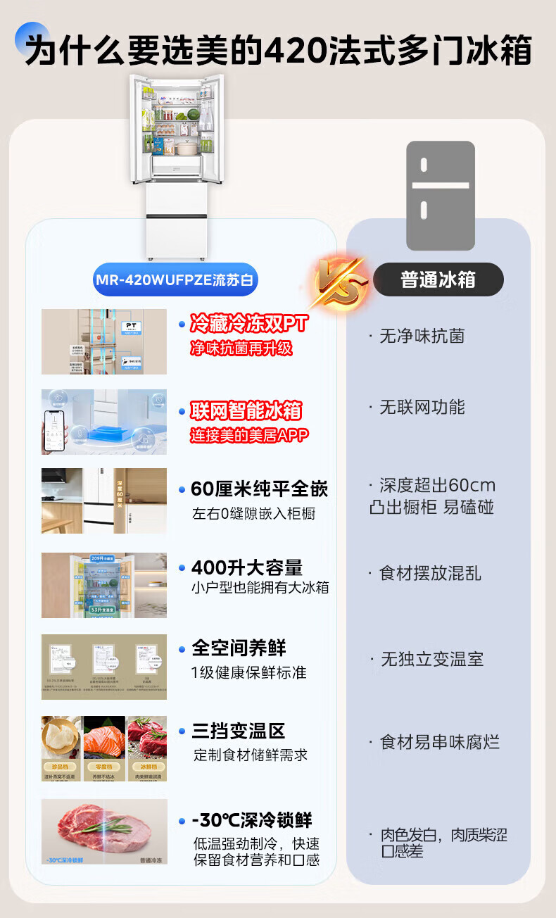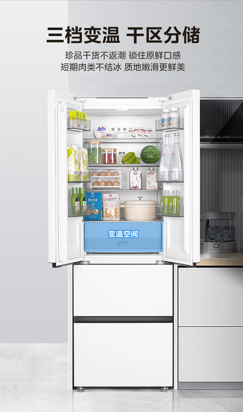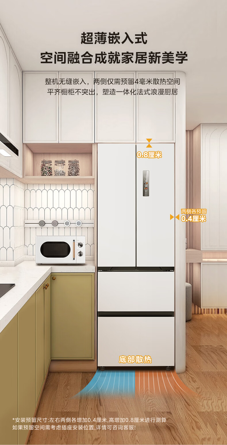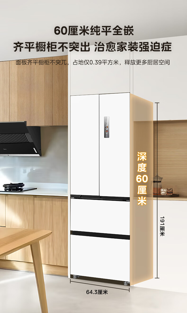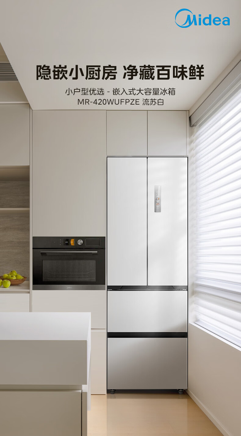 美的(Midea)420法式多门四门超薄纯平全嵌双变频一级大容量底部散热风冷无霜白色冰箱MR-420WUFPZE国家补贴