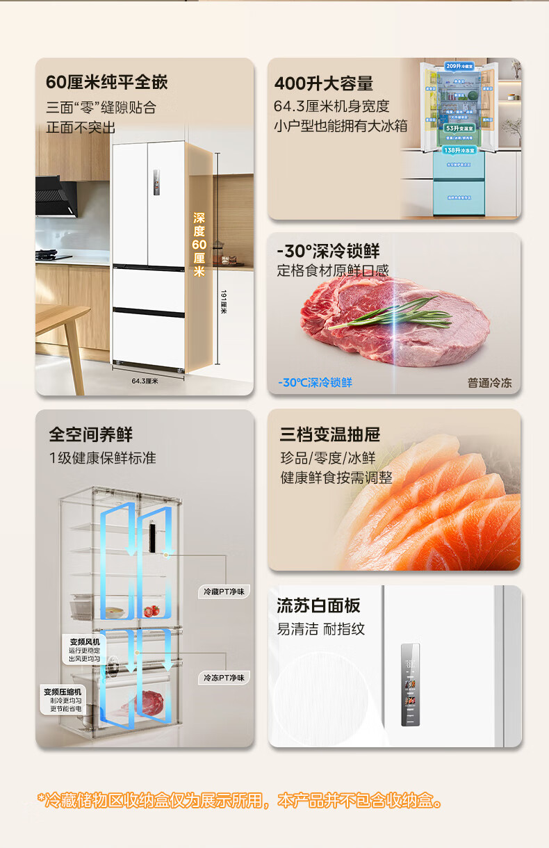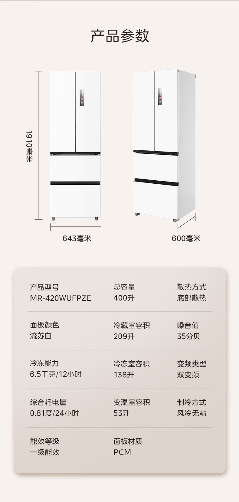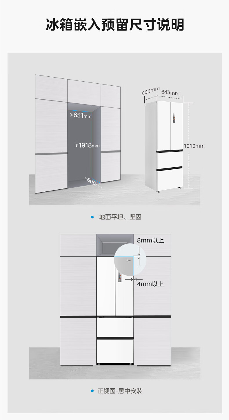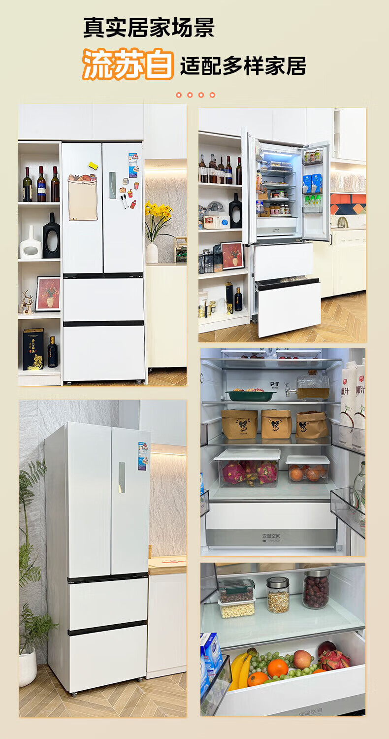 美的(Midea)420法式多门四门超薄纯平全嵌双变频一级大容量底部散热风冷无霜白色冰箱MR-420WUFPZE国家补贴