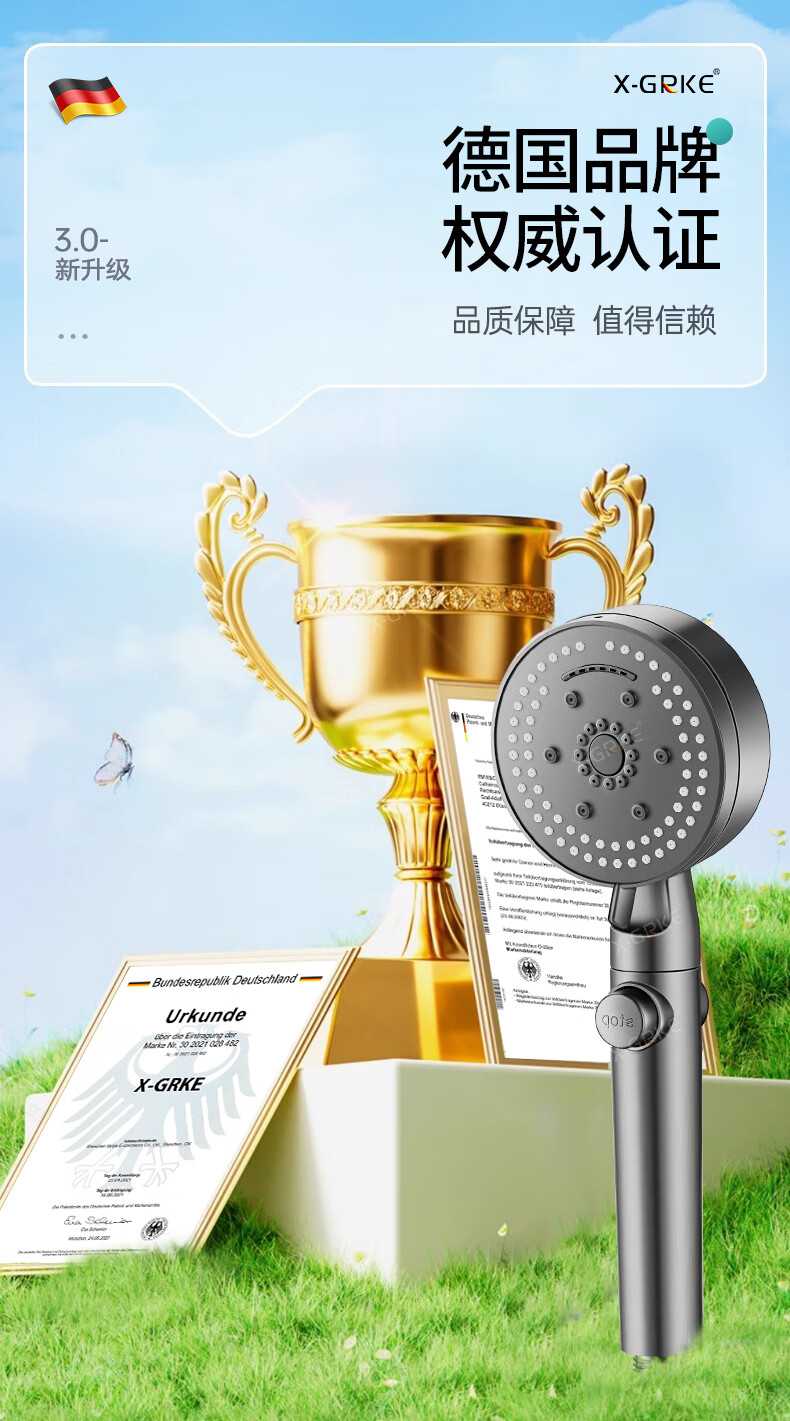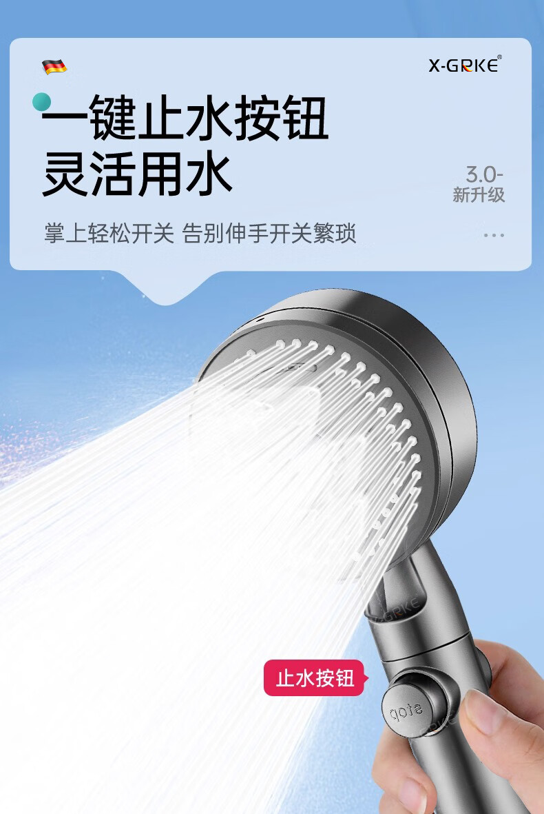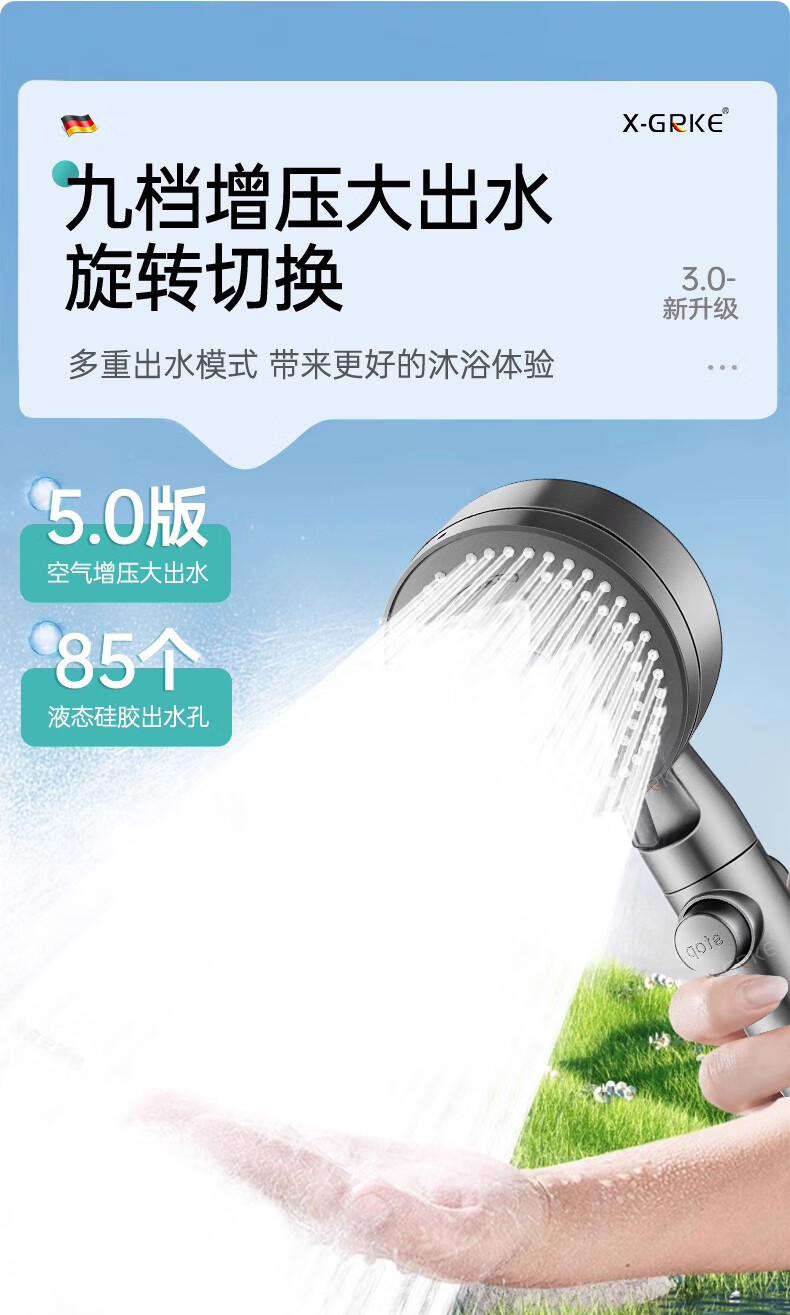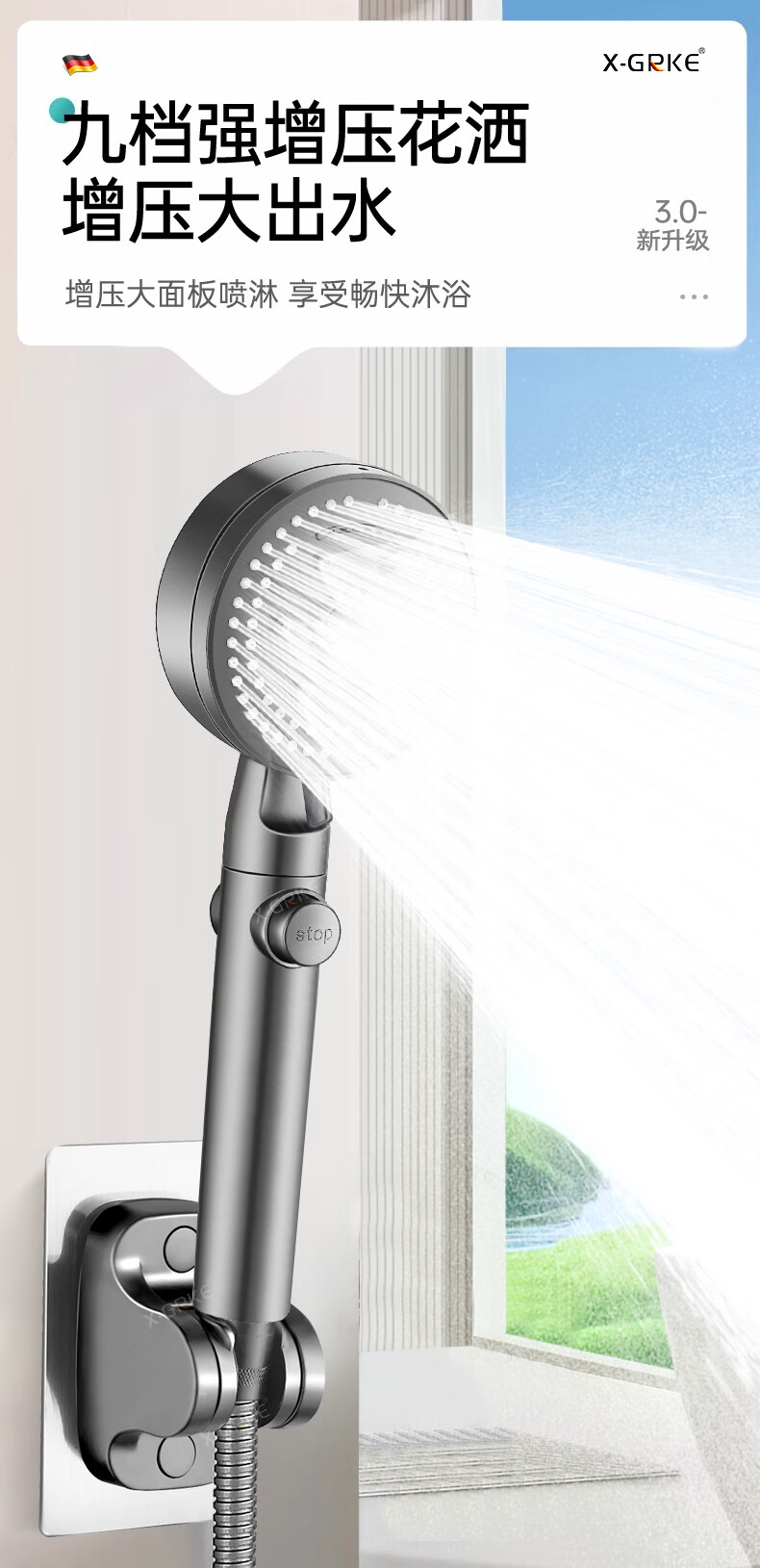 X-GRKE【德国】增压淋浴花洒喷头全套装强劲家用洗澡手持莲蓬头三件套 枪灰色丨新款九档花洒 【强劲九档增压丨密集大出水】