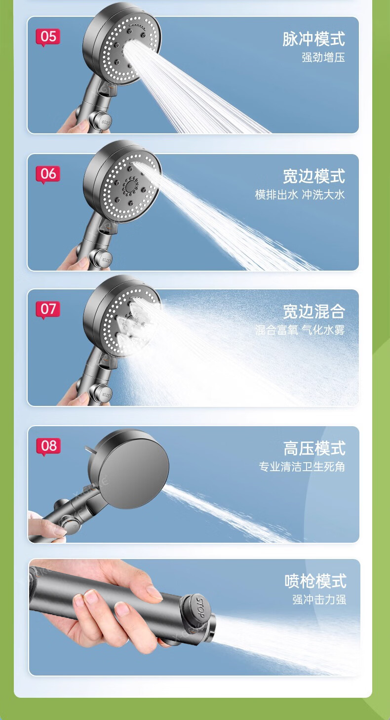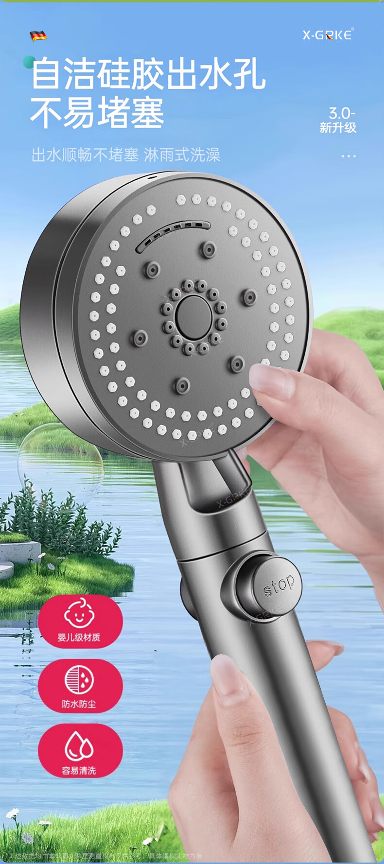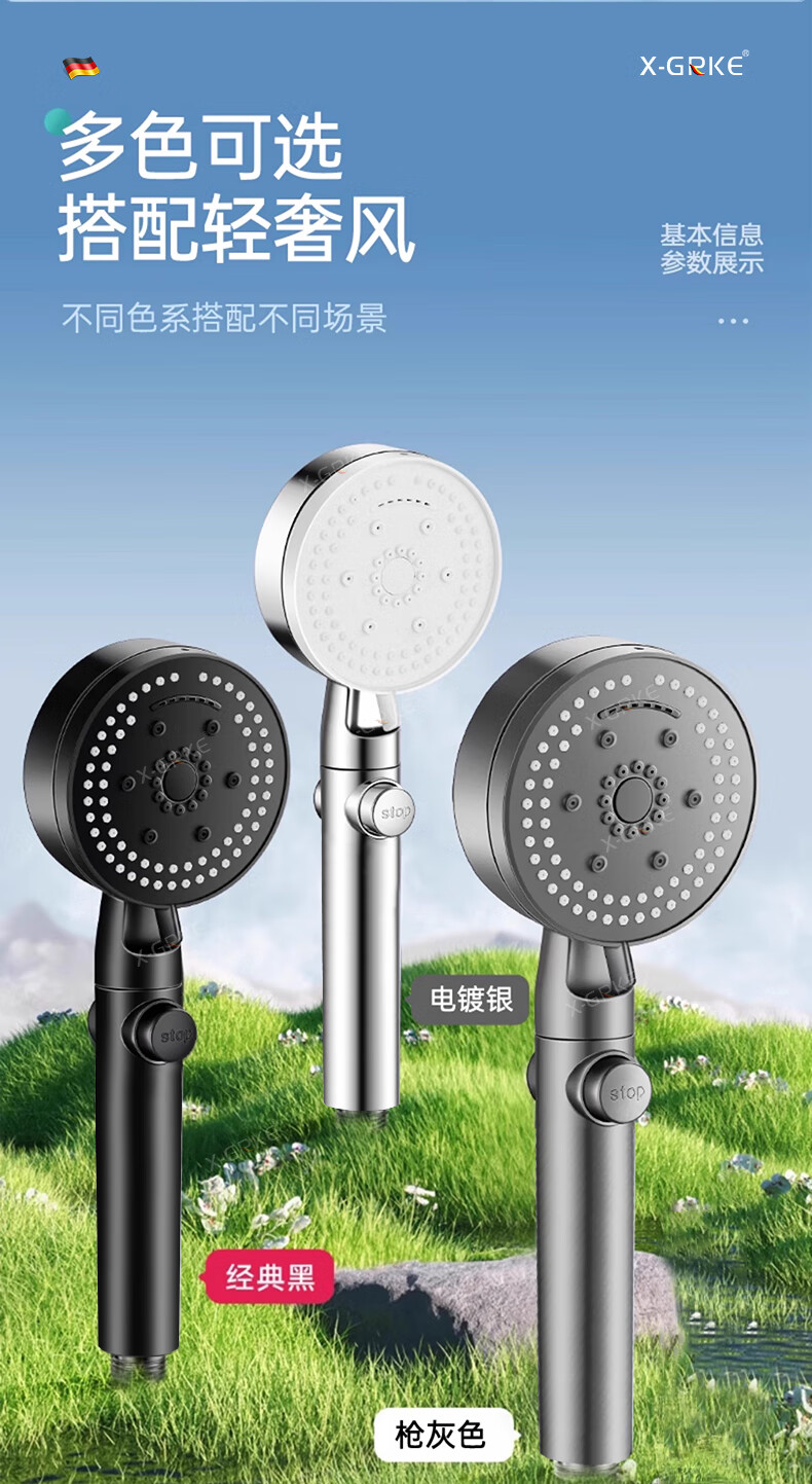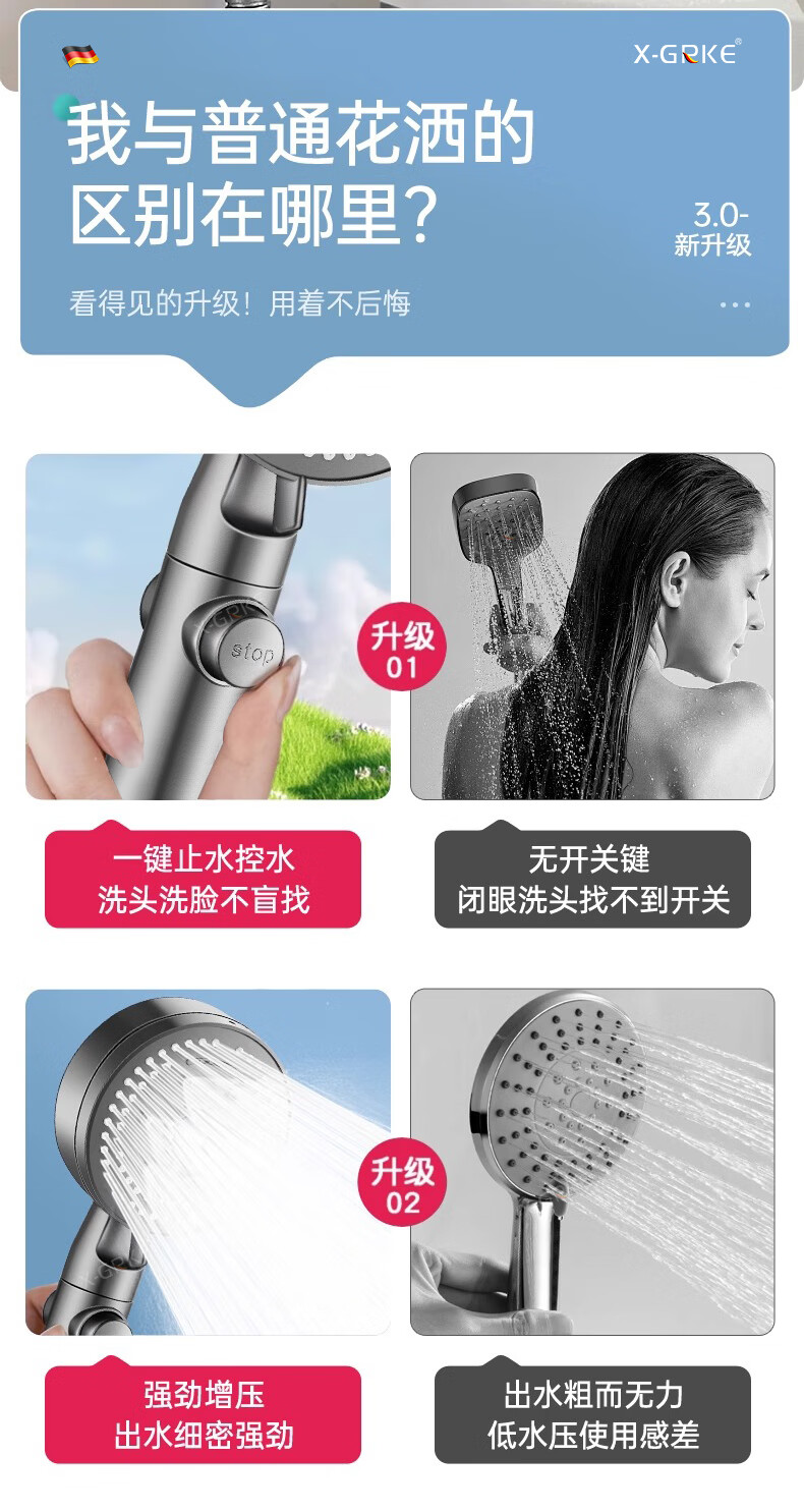 X-GRKE【德国】增压淋浴花洒喷头全套装强劲家用洗澡手持莲蓬头三件套 枪灰色丨新款九档花洒 【强劲九档增压丨密集大出水】