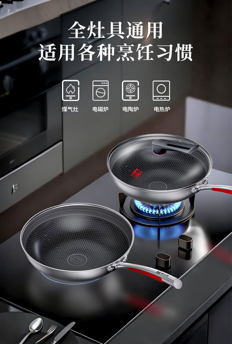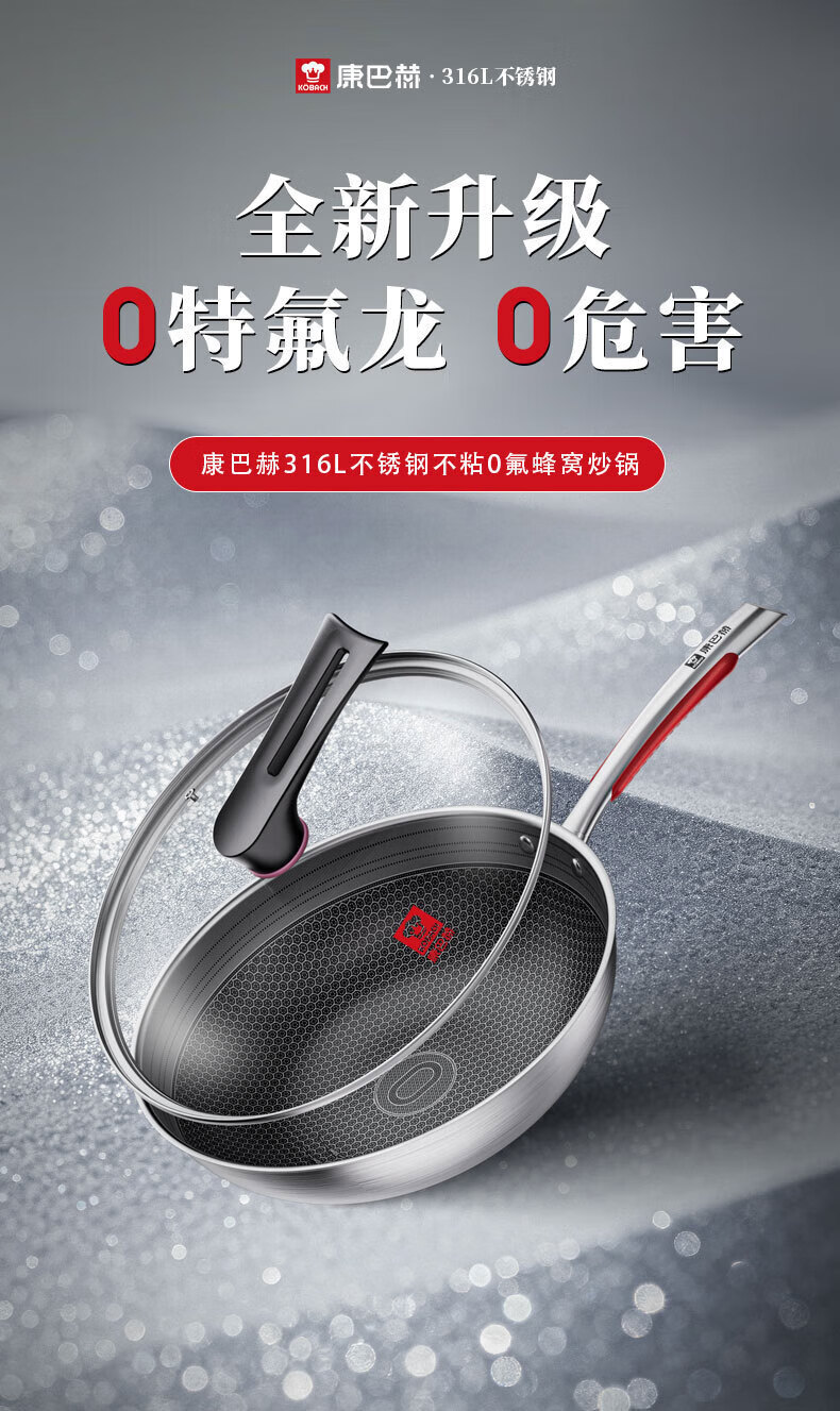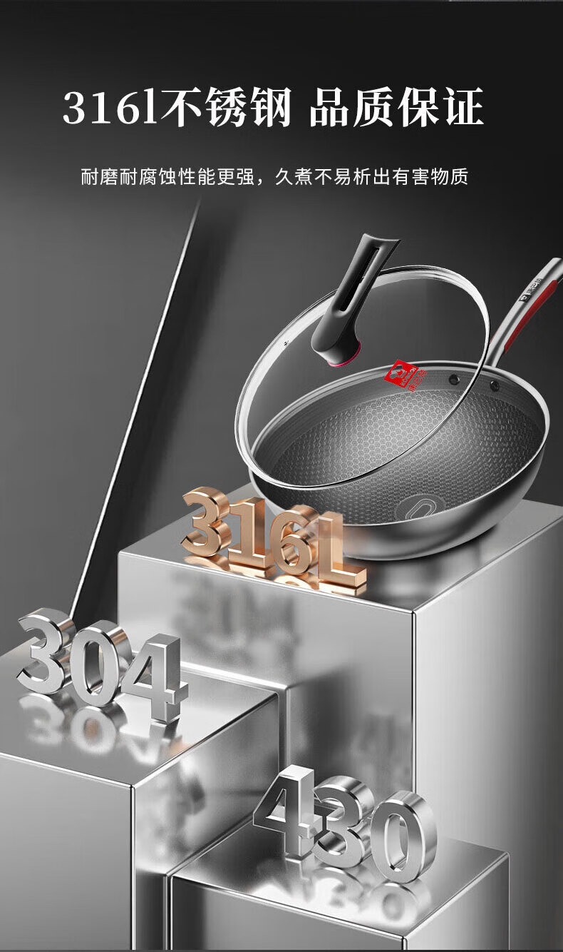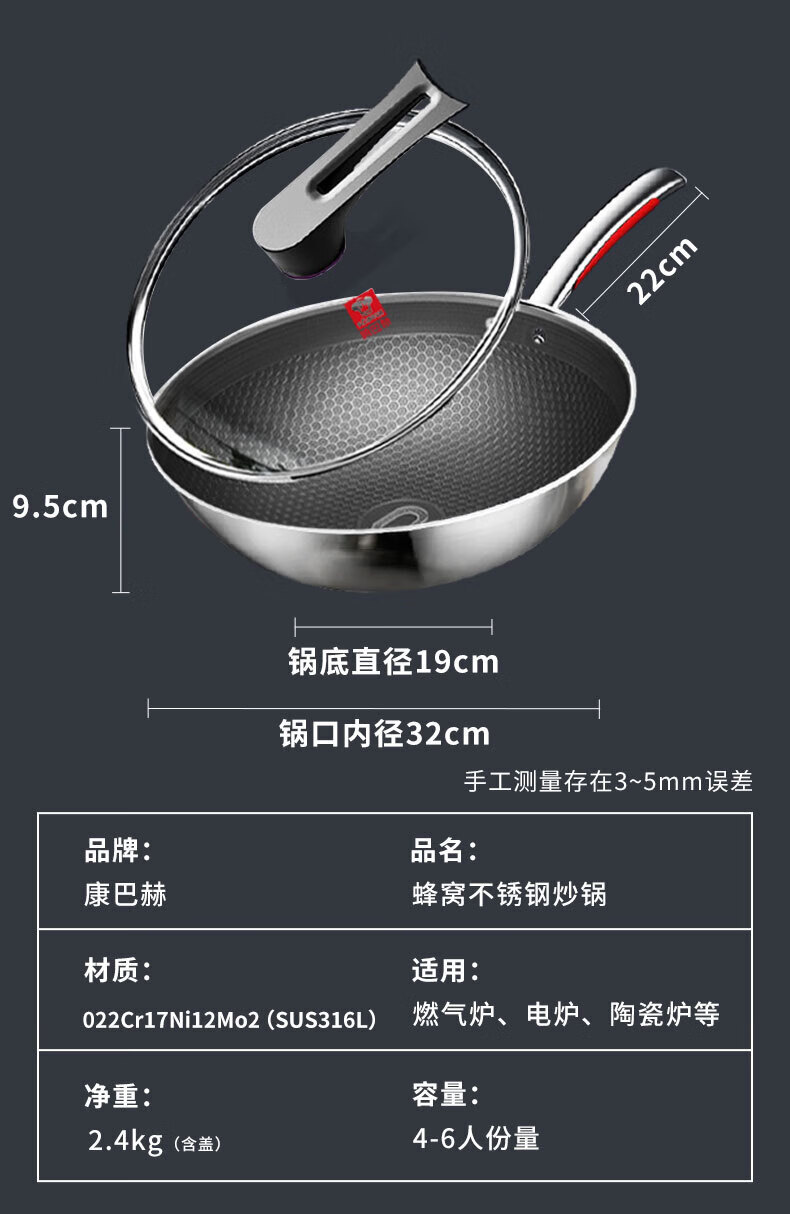 康巴赫炒锅316L不锈钢炒菜锅少油烟不粘锅家用电磁炉燃气灶通用32cm