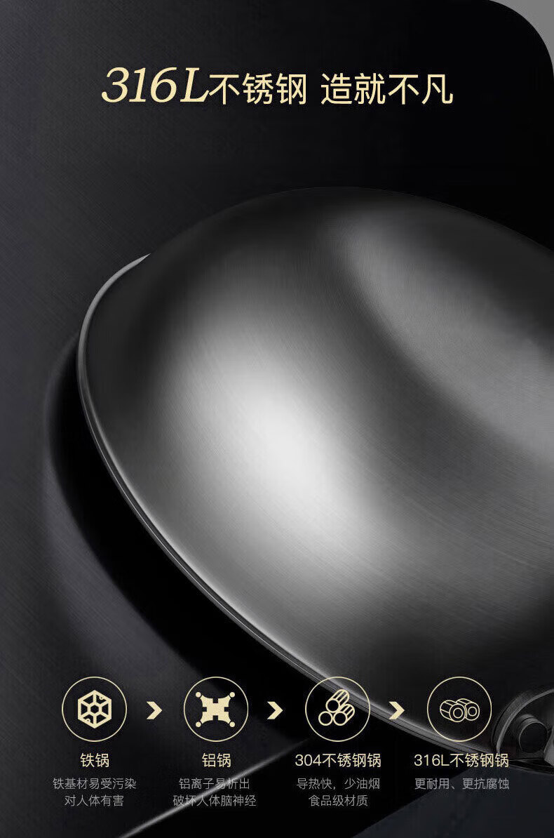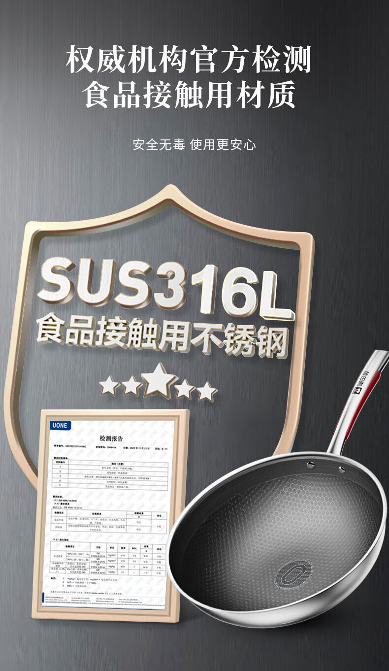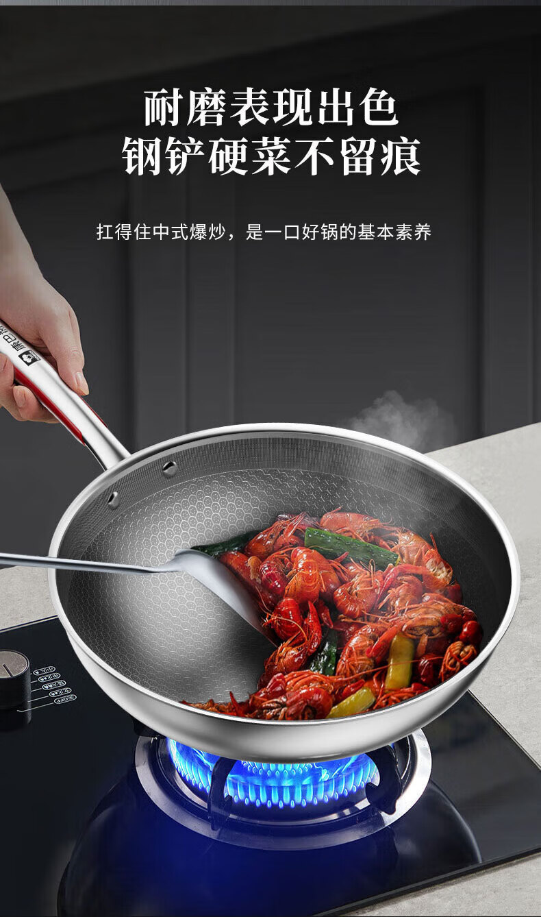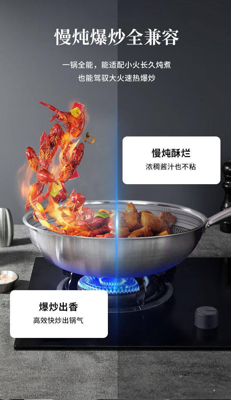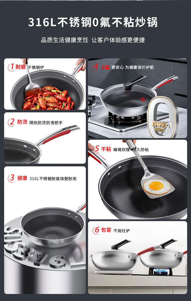 康巴赫炒锅316L不锈钢炒菜锅少油烟不粘锅家用电磁炉燃气灶通用32cm