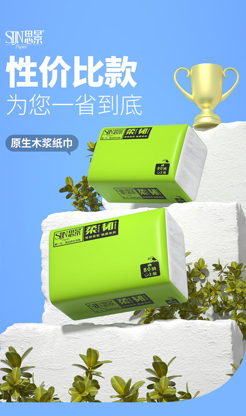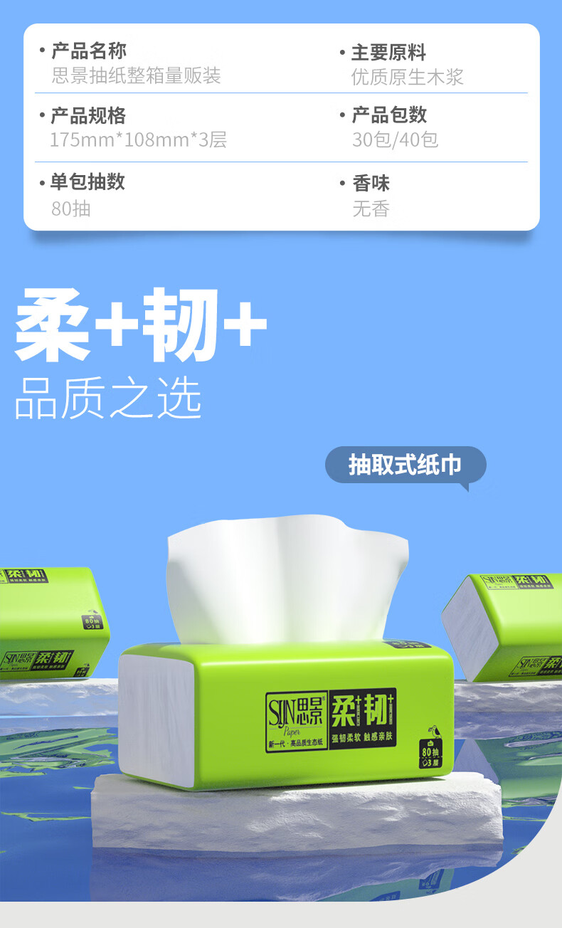 思景抽纸60包40包30包整箱3层80抽原生木浆抽纸面巾纸量贩装便携抽纸 囤货抽纸 3层 80抽*40包 整箱装