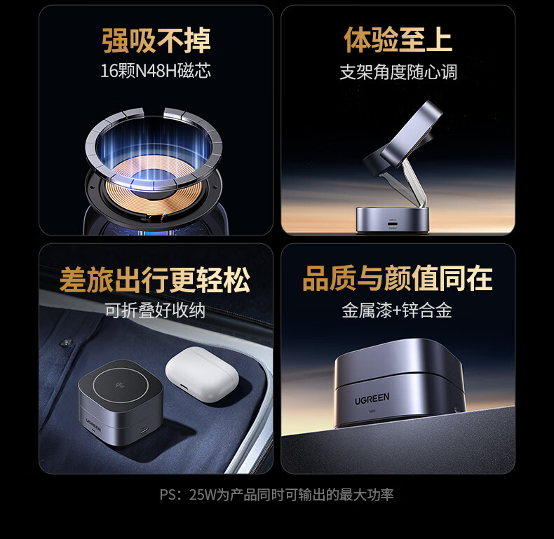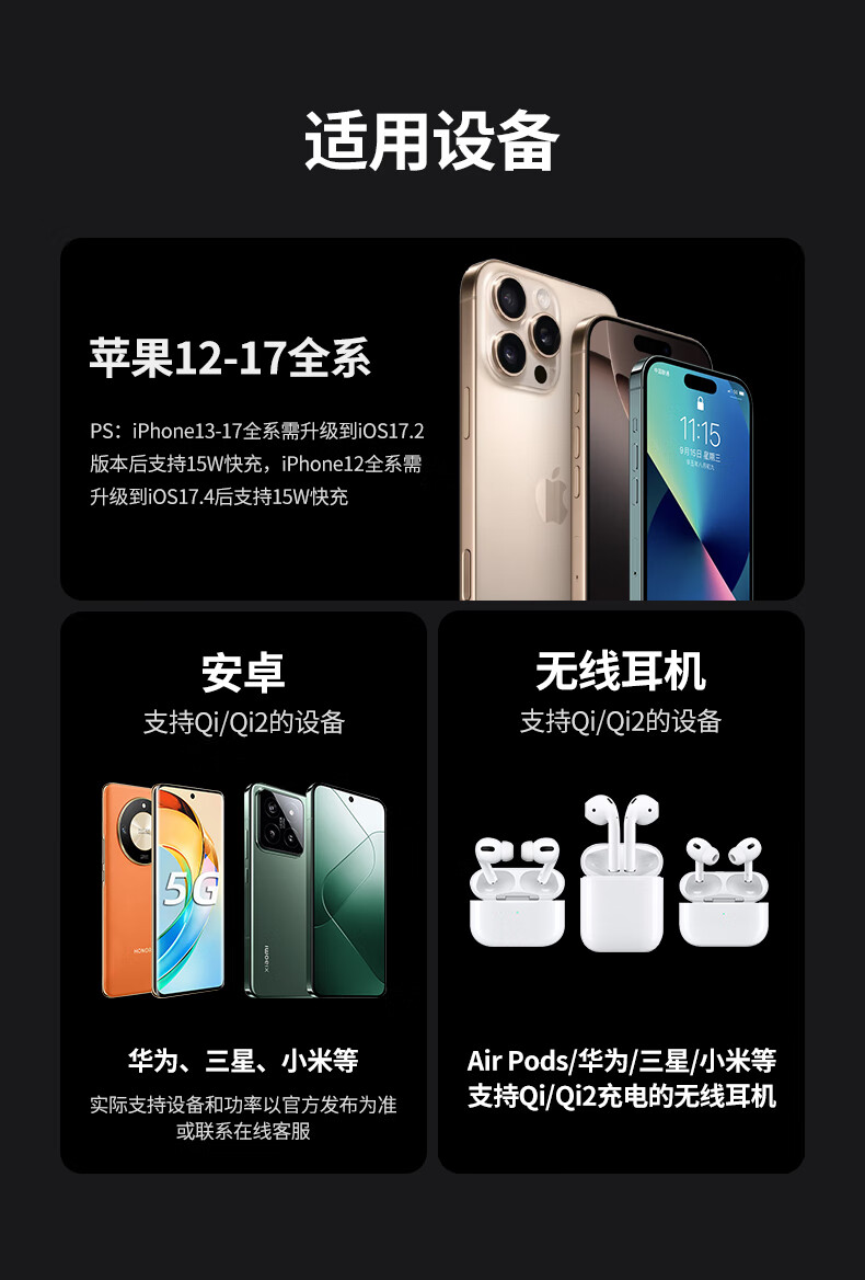 绿联Qi2认证【适用iPhone17】无线充电器MagSafe磁吸支架15W快充苹果16/15/14ProMax耳机充电板可折叠