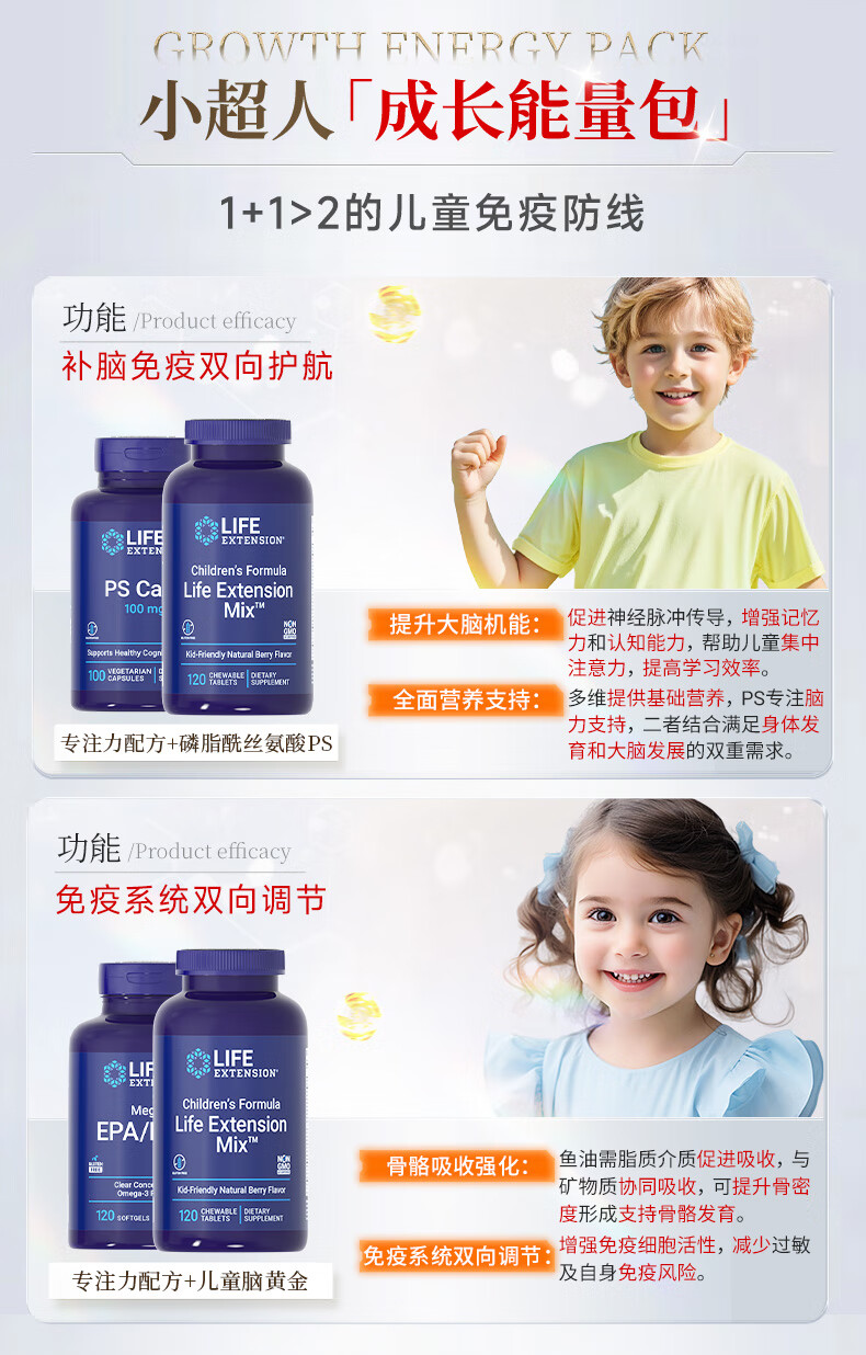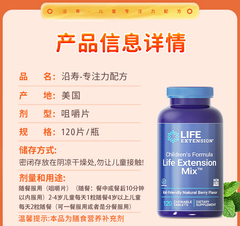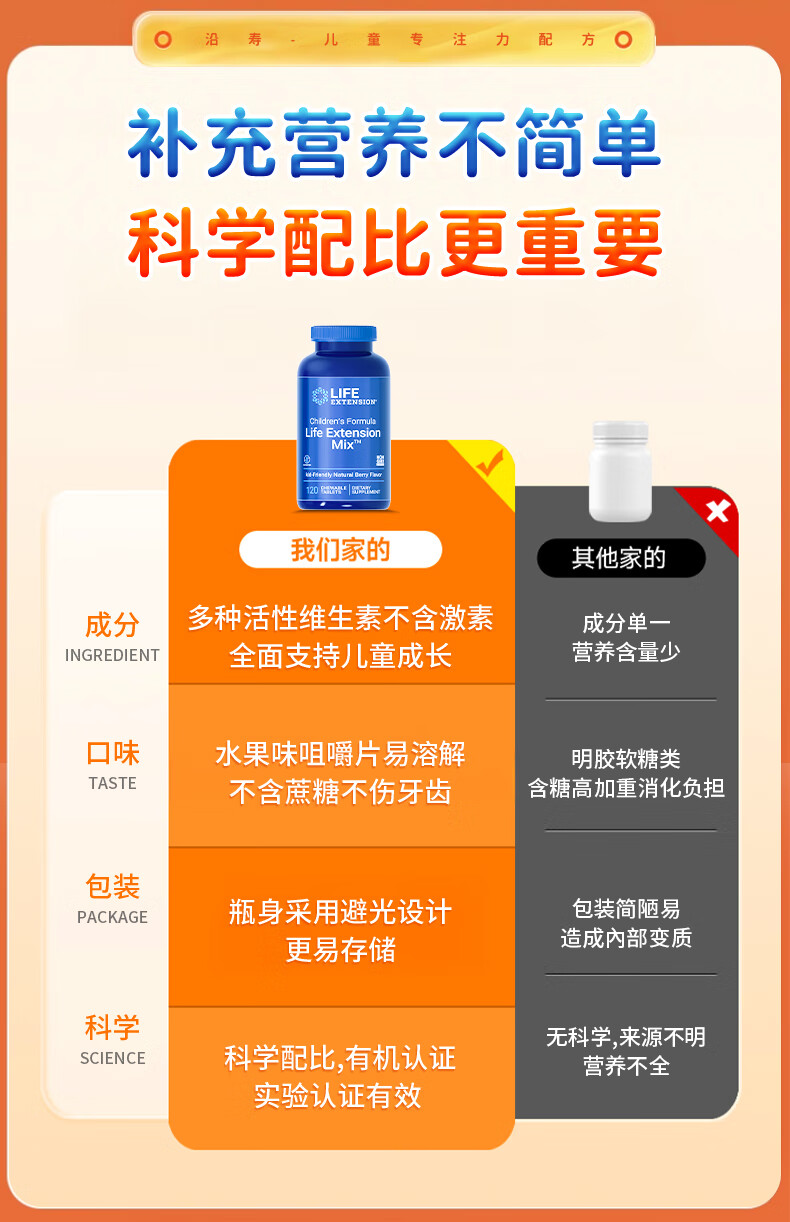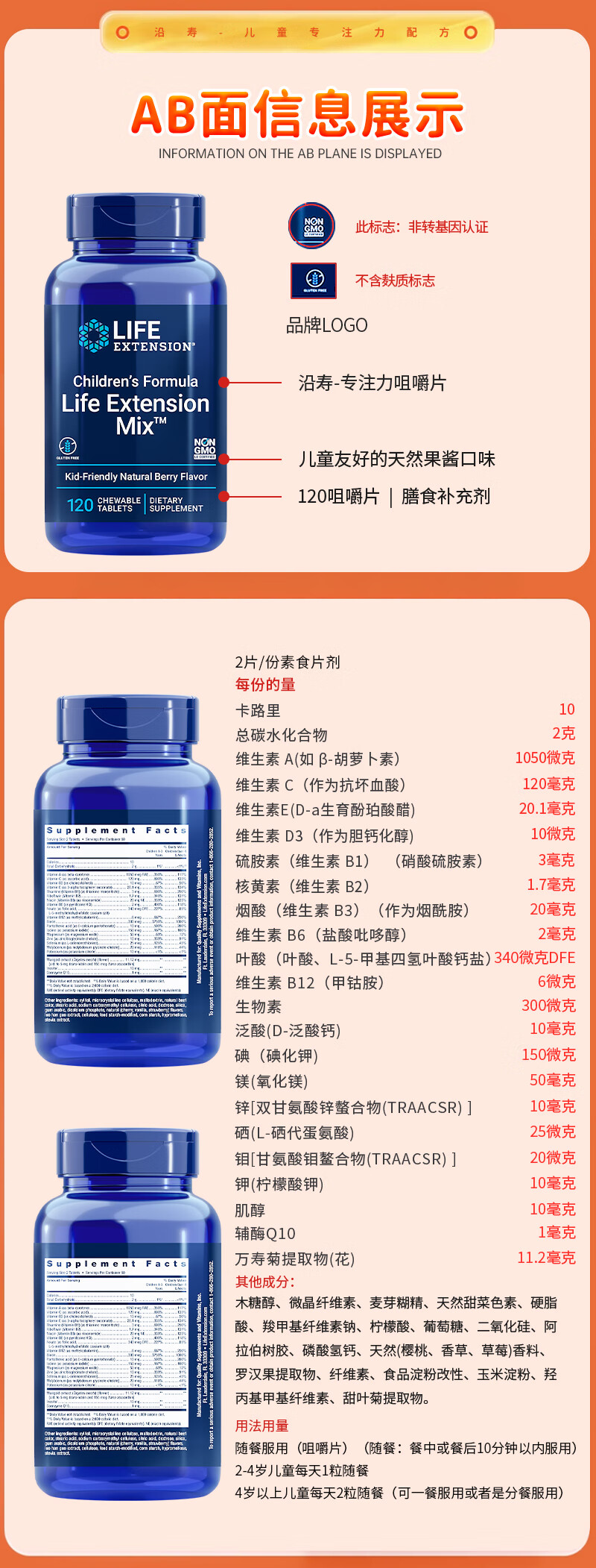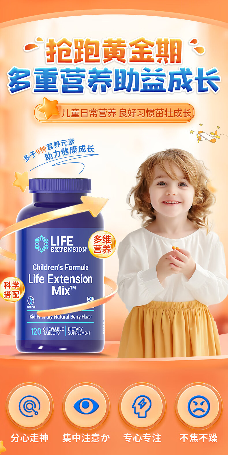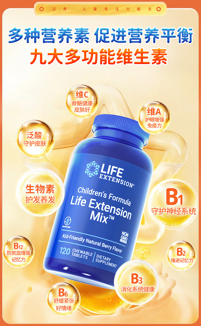 Life Extension沿寿儿童复合维生素ebD3维C果味咀嚼片含21种营养多维美国进口