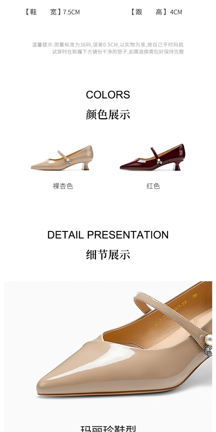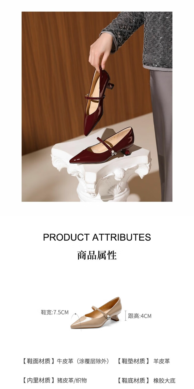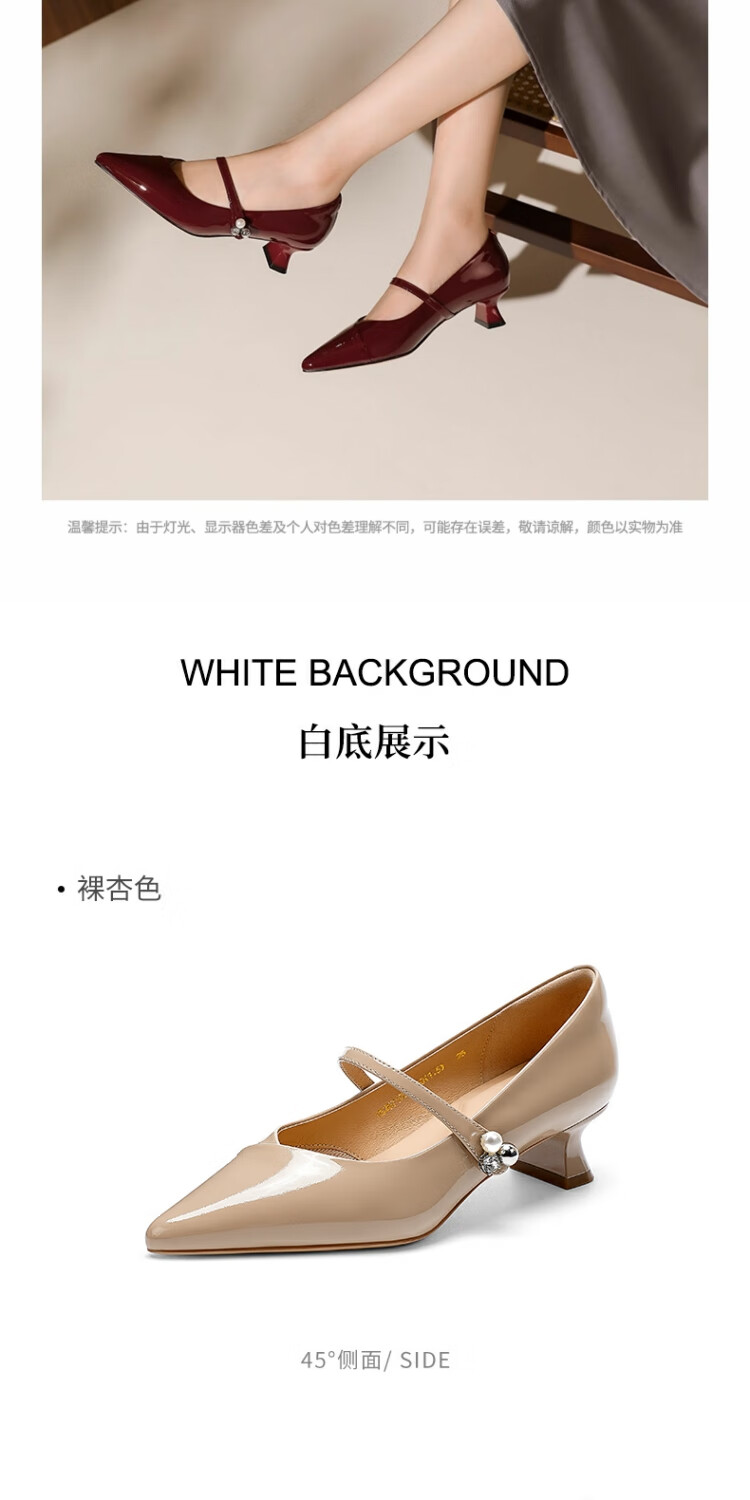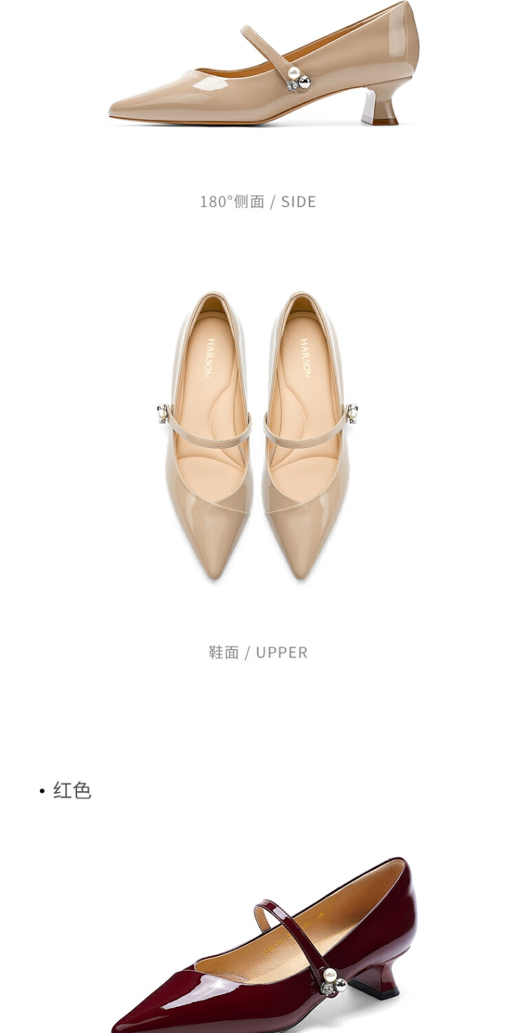 哈森玛丽珍女鞋2025新款法式红色气质粗跟尖头单鞋HS267105 裸杏色 牛皮革(涂覆层除外) 34
