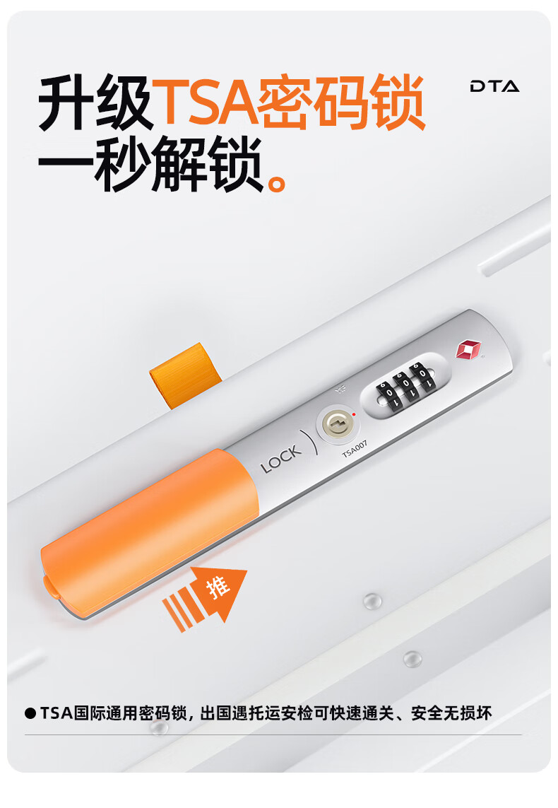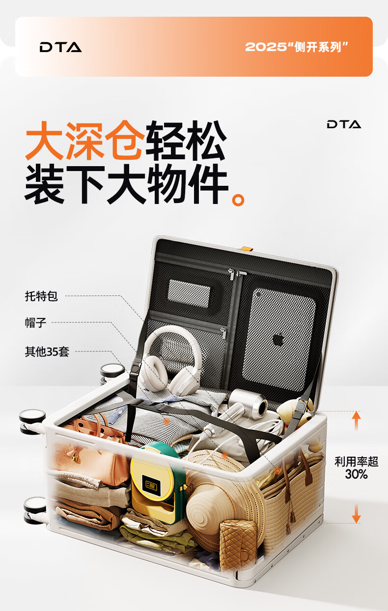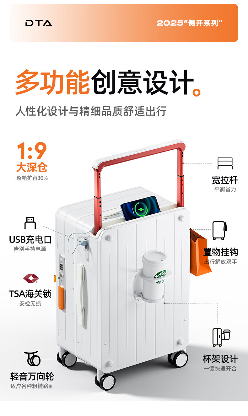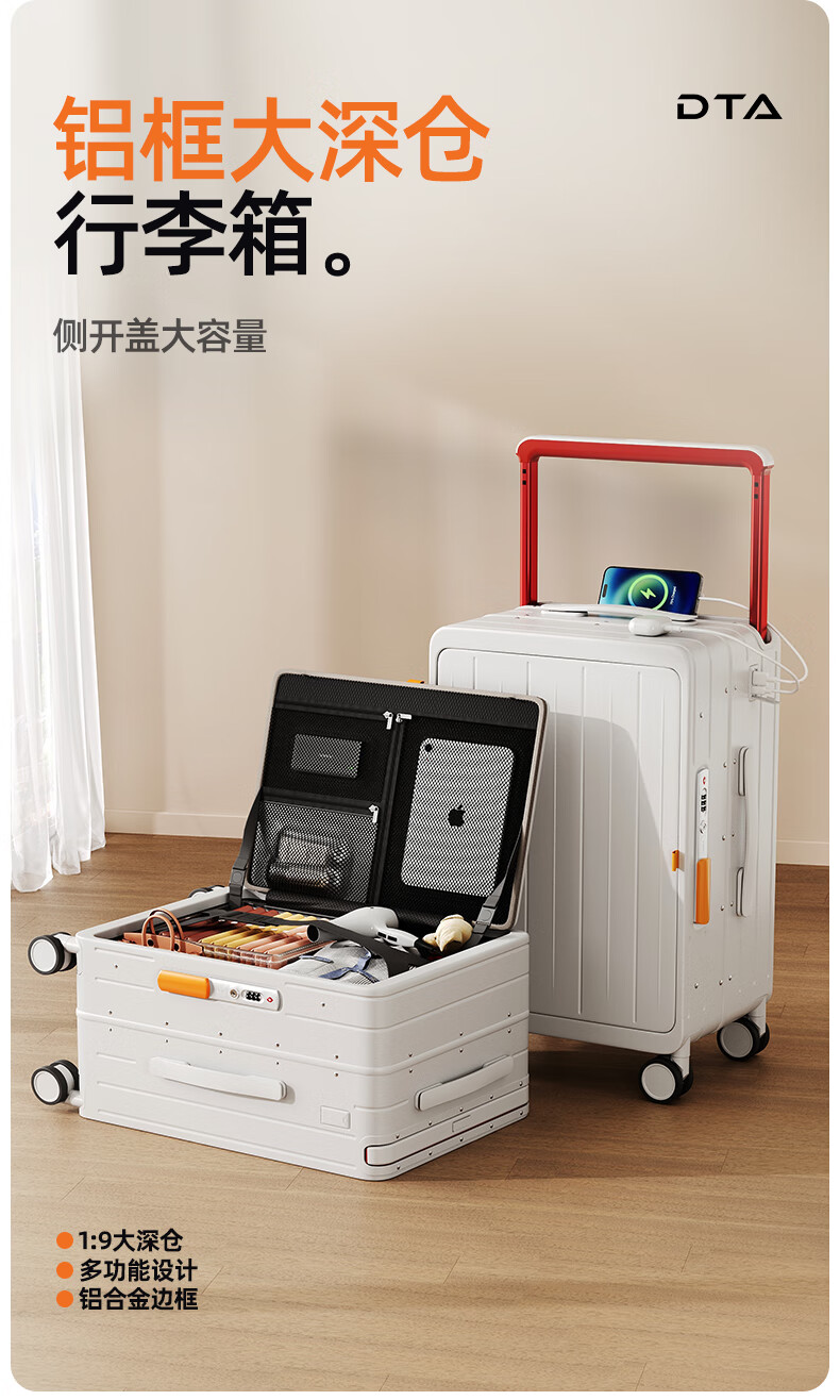 DTA侧开盖行李箱大容量可登机拉杆箱女多功能旅行皮箱子男黑色20英寸