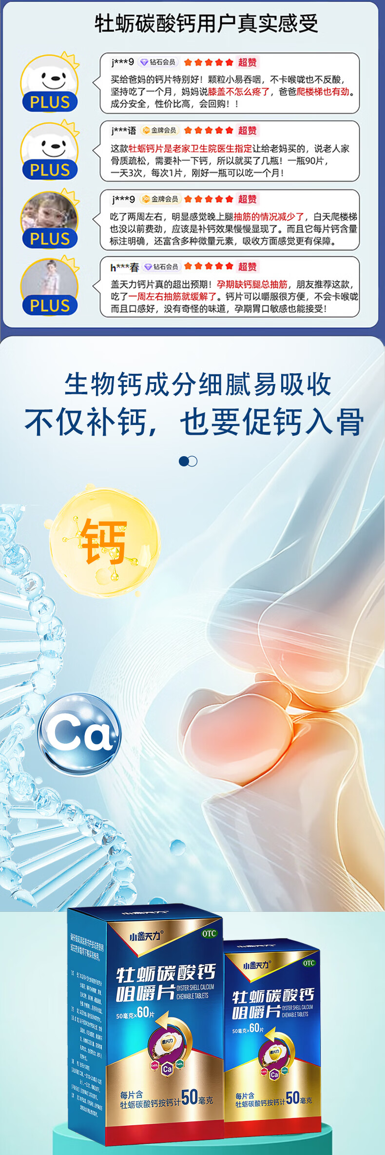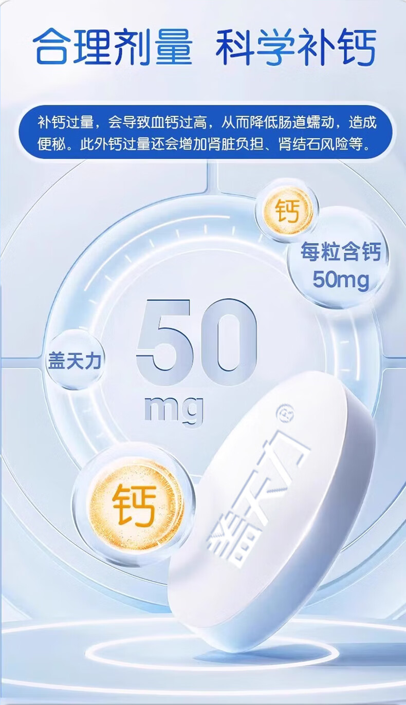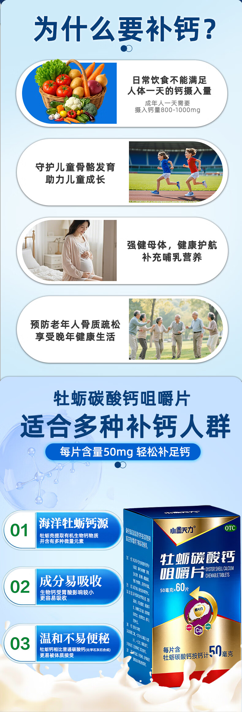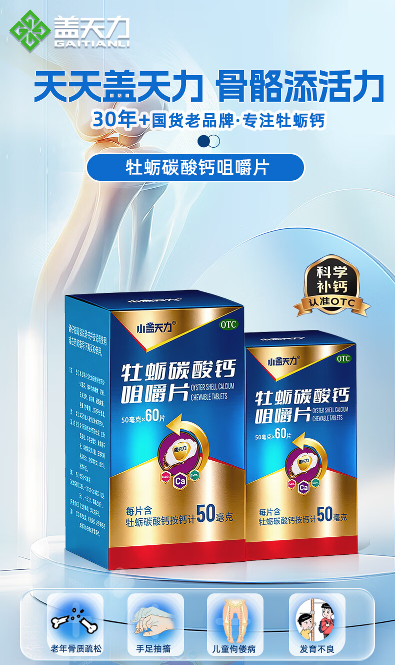 [盖天力]牡蛎碳酸钙咀嚼片 50mg*60片 1盒装 钙片适用于儿童孕妇中老年补钙 预防缺钙骨质疏松尔奇蚝贝钙片成人女士补钙 约10天量