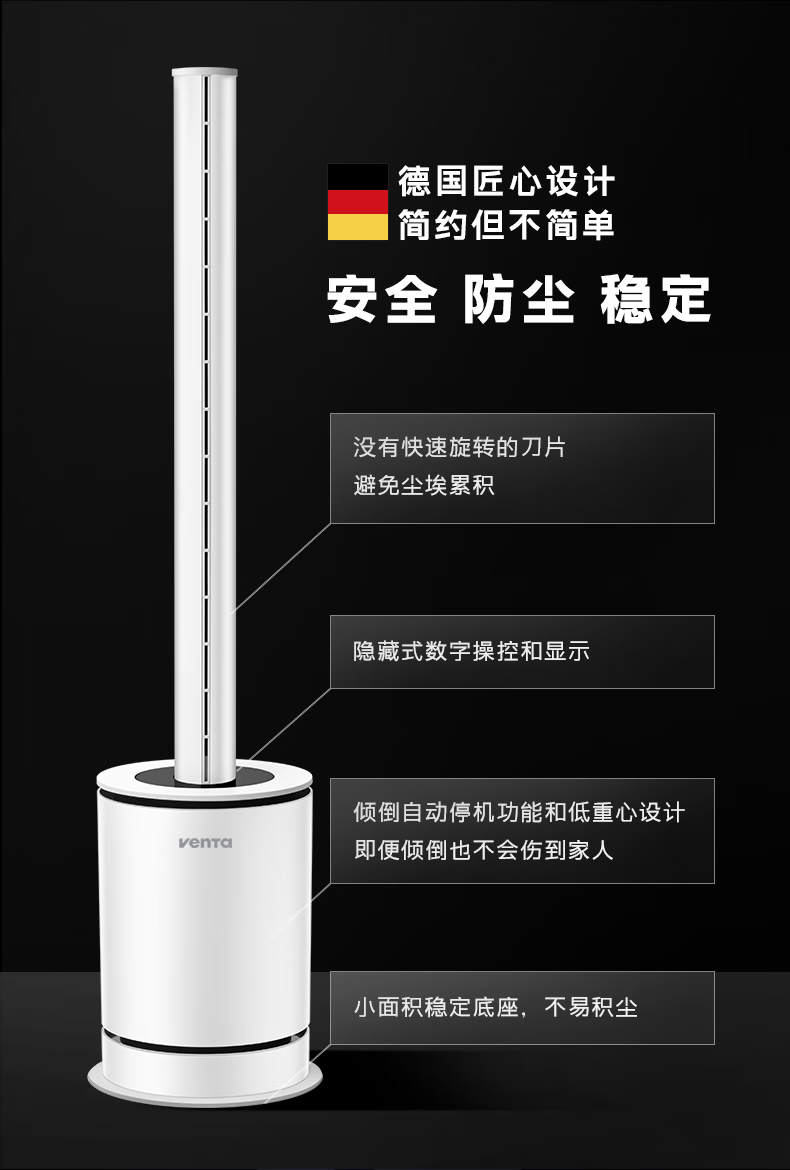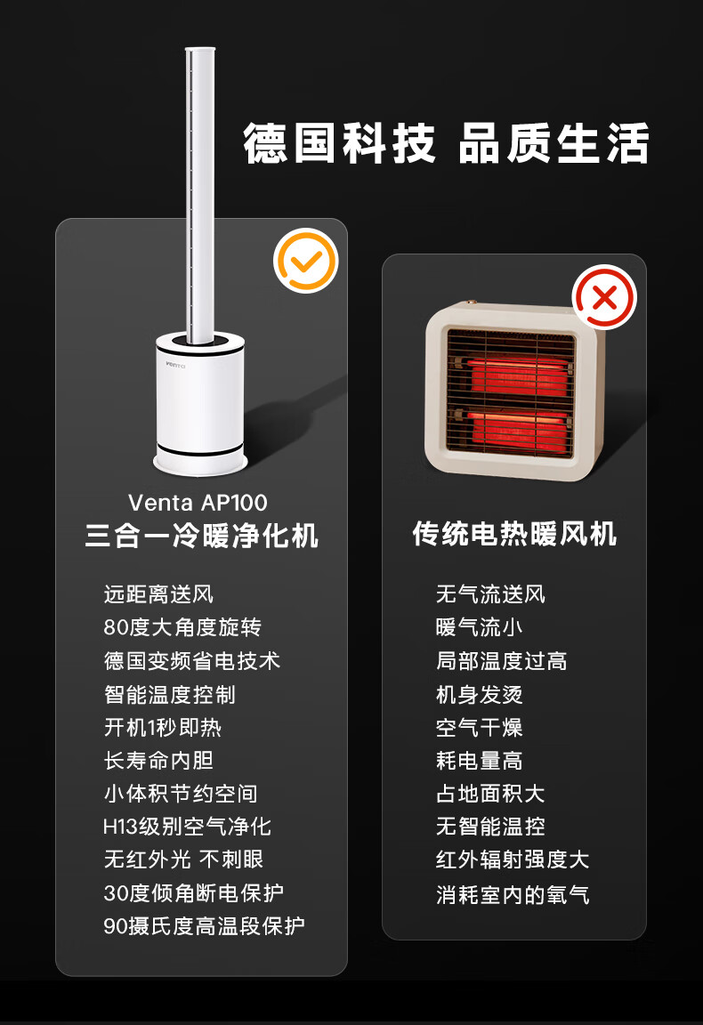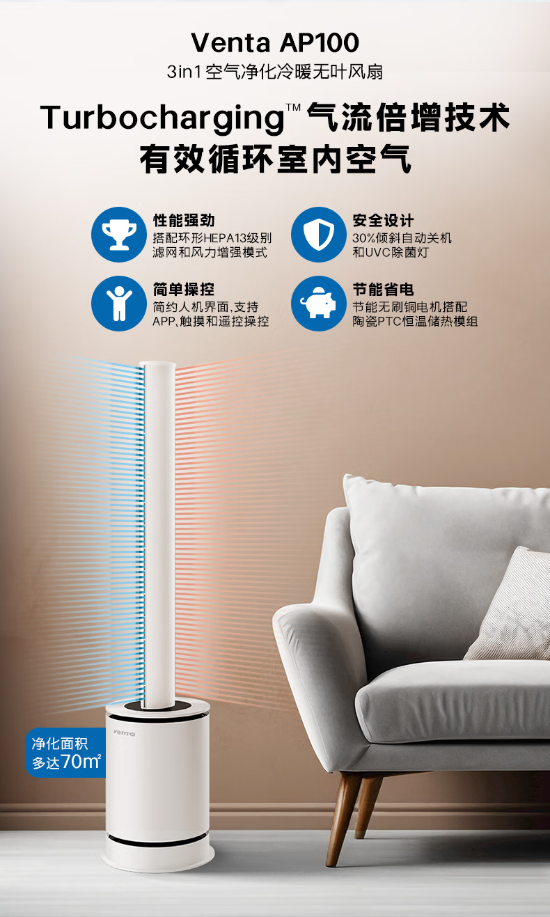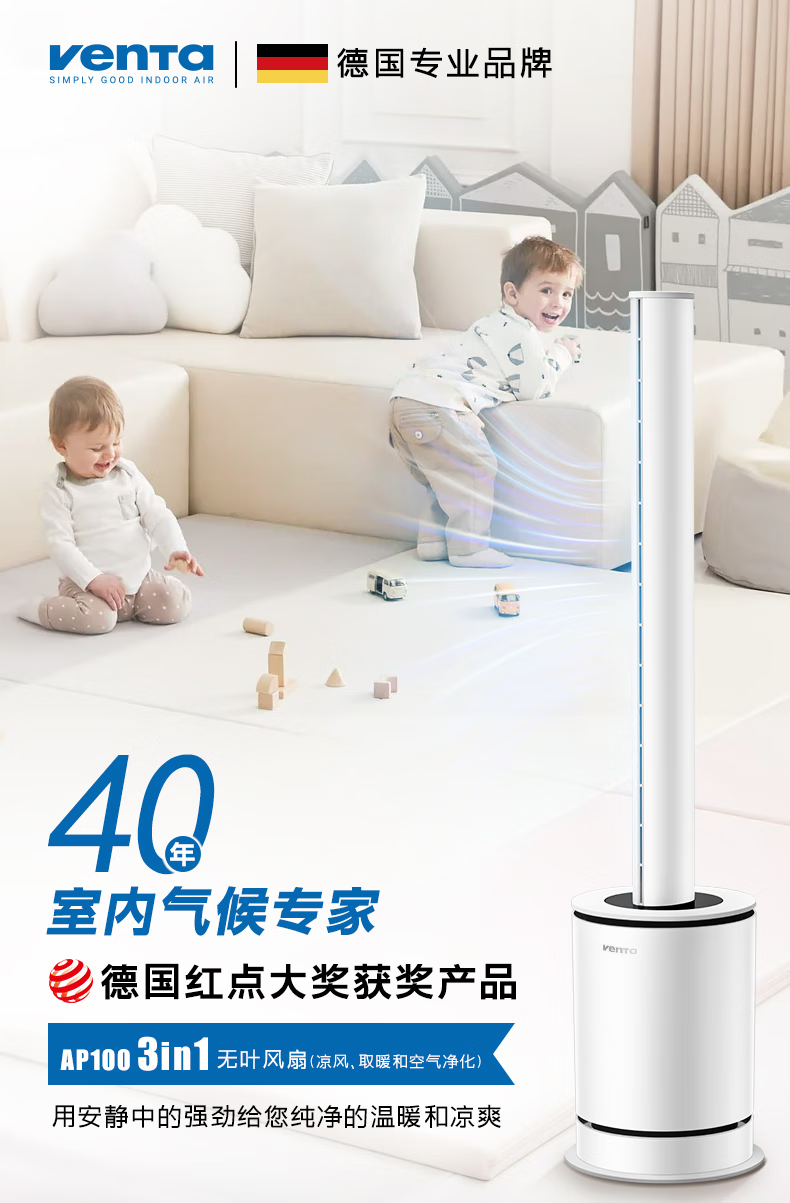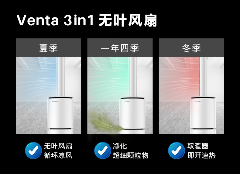 venTa【3年免费滤网】德国无叶风扇冷暖风扇静音家用落地取暖器空气循环扇电暖器立式净化扇文塔中秋礼 3合1冷暖风+空气净化